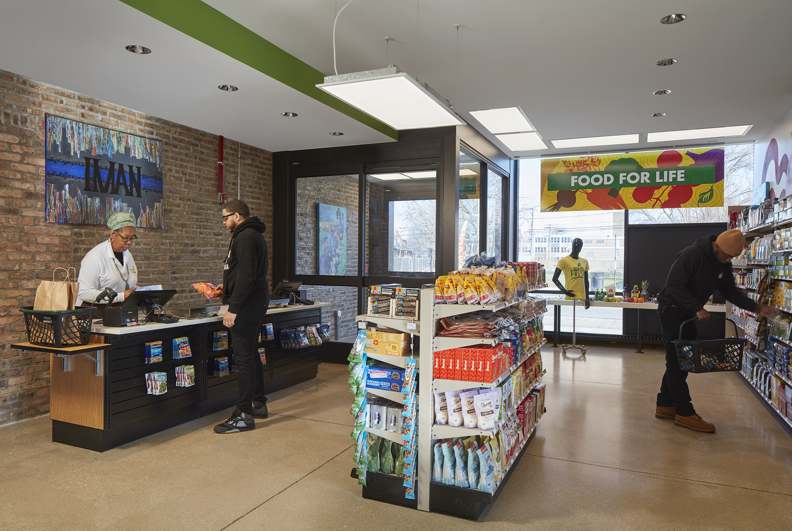 Unlike traditional corner stores with high shelving and extensive security cameras, taller items are placed along the walls, promoting open sightlines and face-to-face interaction. Inside, West African fabrics were used to develop a color palette, signaling this isn’t a generic high-end grocery; it is by and for Englewood.