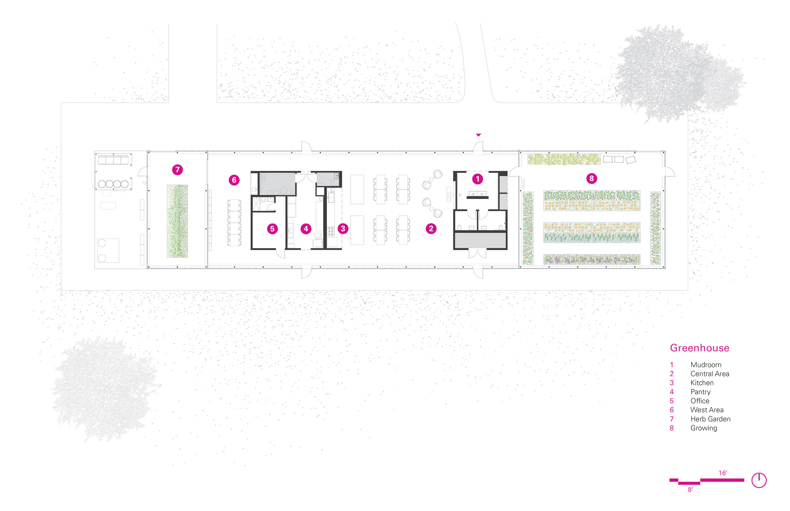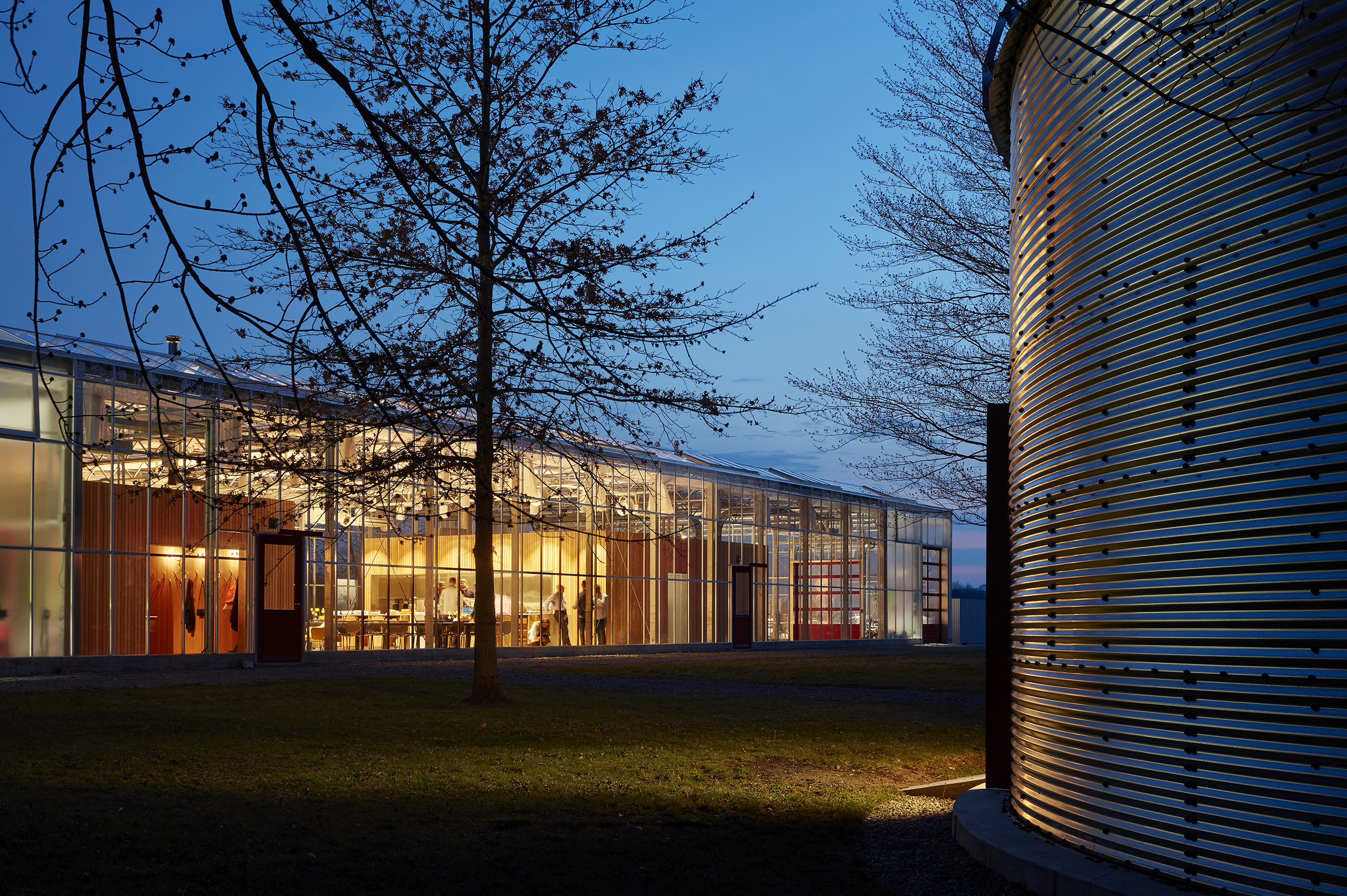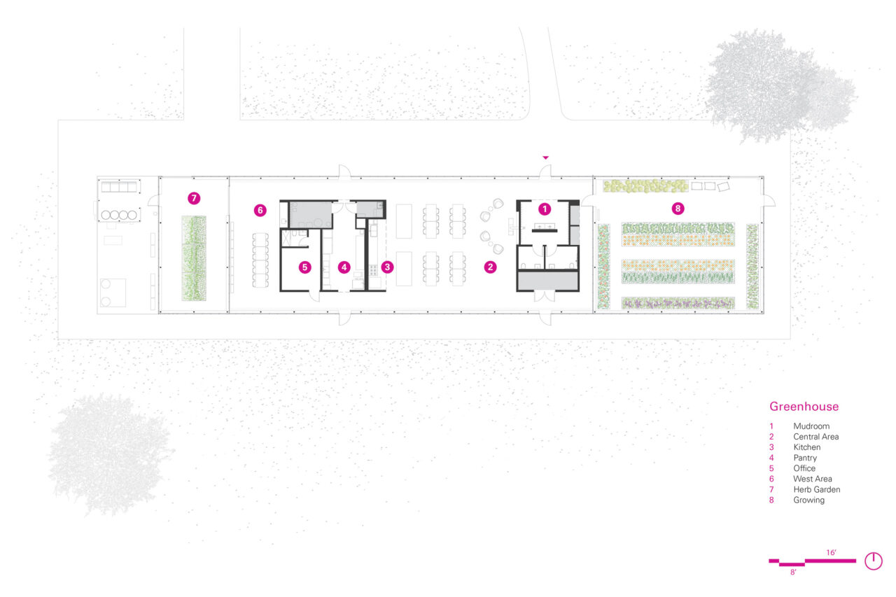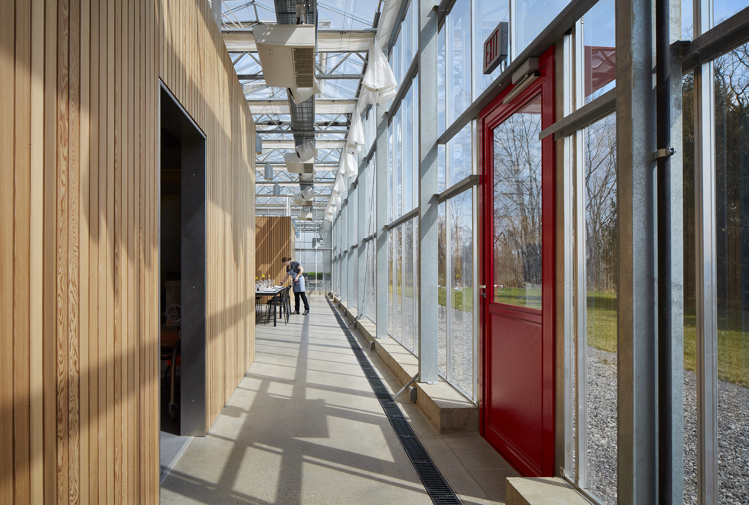 Harvesting the sun with its broadside facing south, the building utilizes the Dutch Venlo greenhouse kit-of-parts system, organizing its diverse program into three zones with associated glazing strategies.