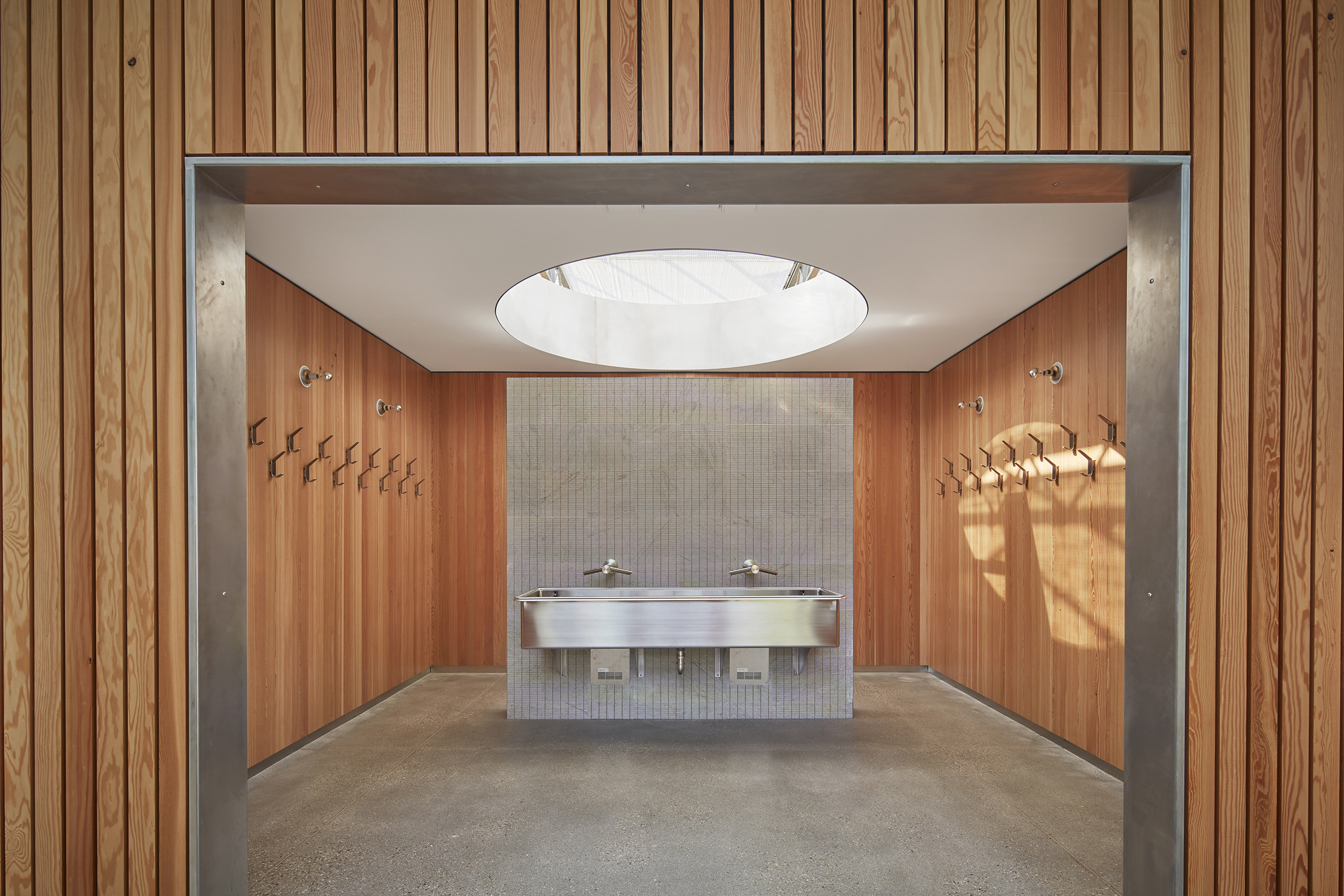 Bookending the main social space, two Douglas Fir clad volumes provide strategic separation between the zones, housing the mudroom/wash sink, pantry, and chef’s office. The wood softens the cool finishes while screening the acoustic absorption that wraps the volumes’ five faces.
