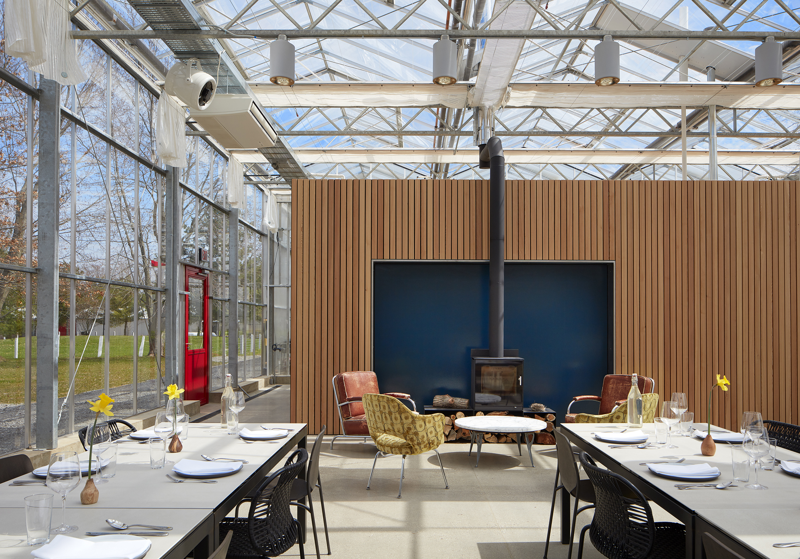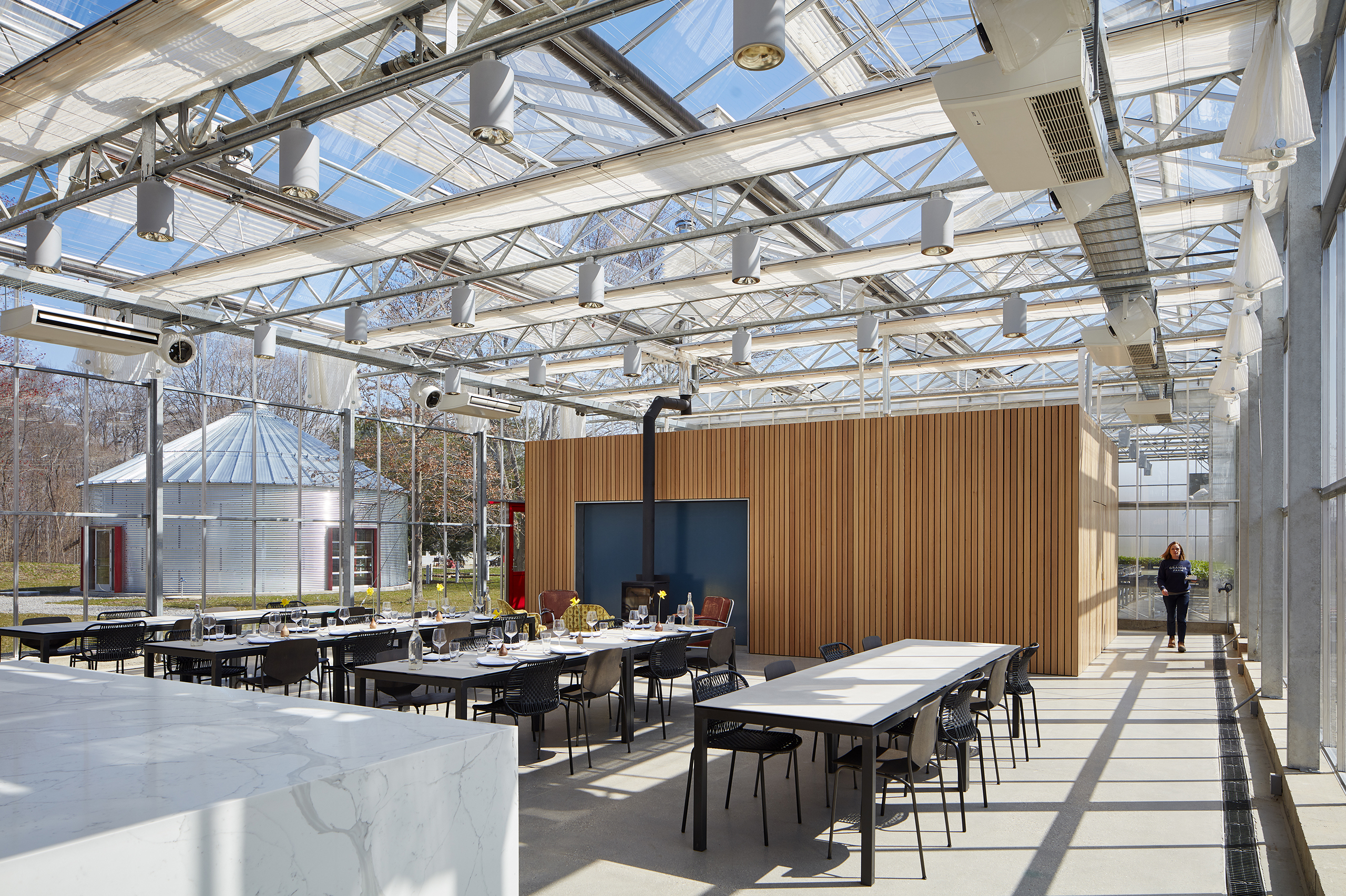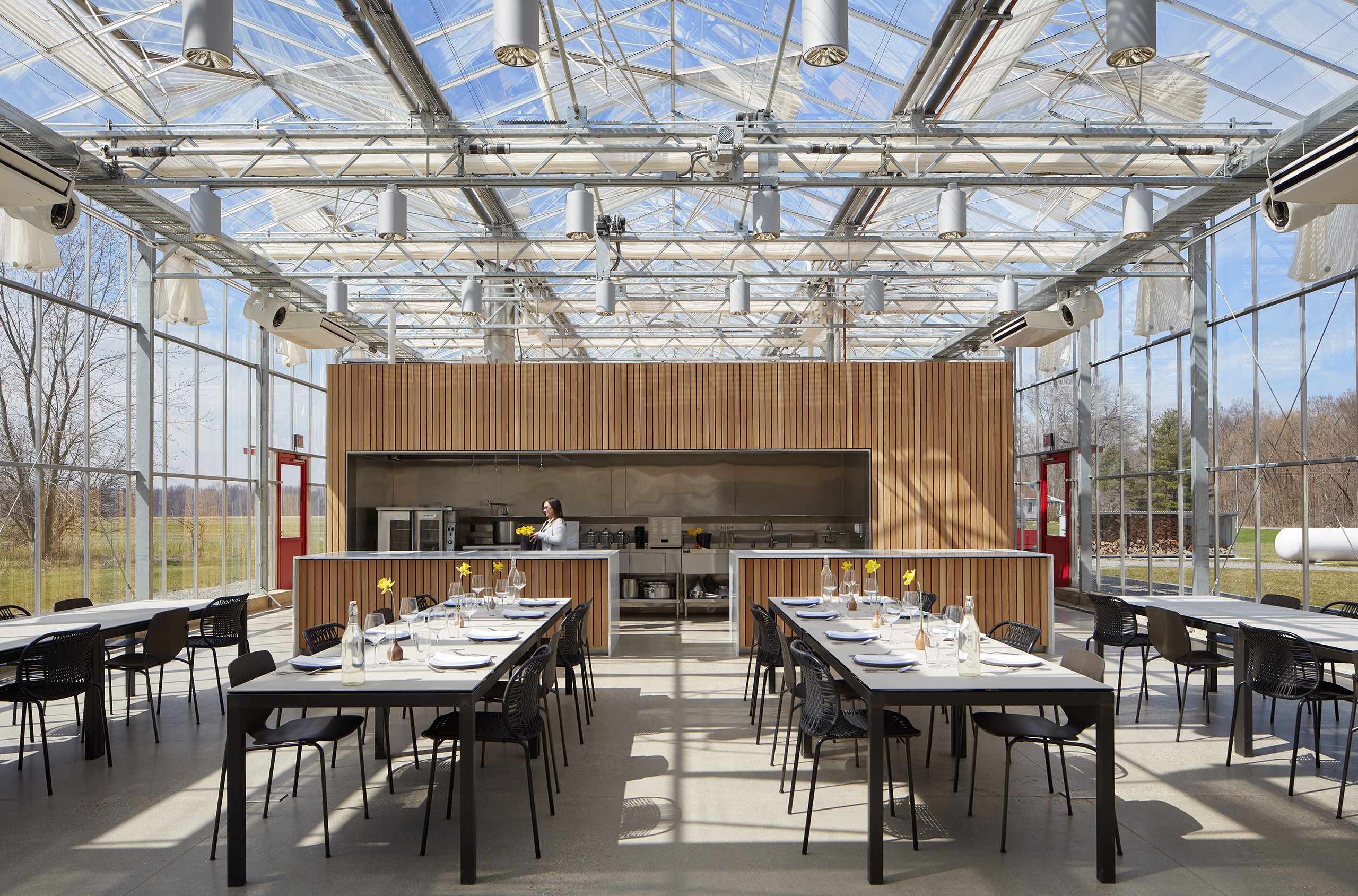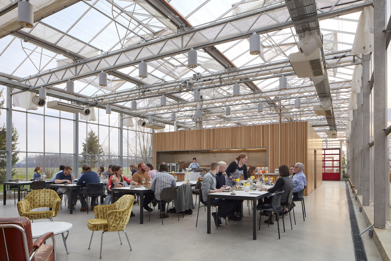 With agrarian economy and utility in mind, the prefabricated 7,336-sf glass structure immerses farm staff, chefs, Farmcamp youth, visitors, and farm-to-table diners into a working vegetable farm while delightfully engaging their five senses.