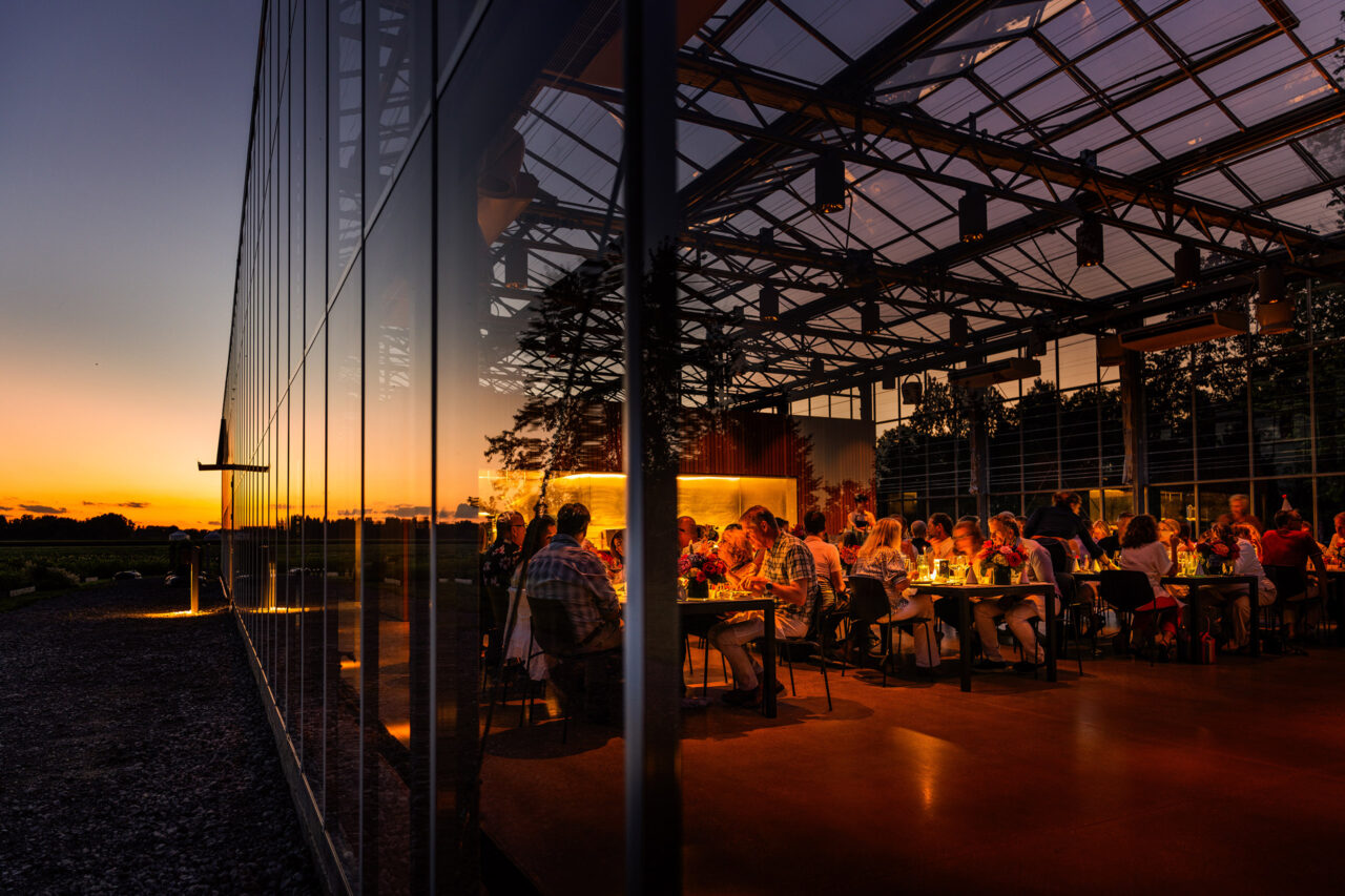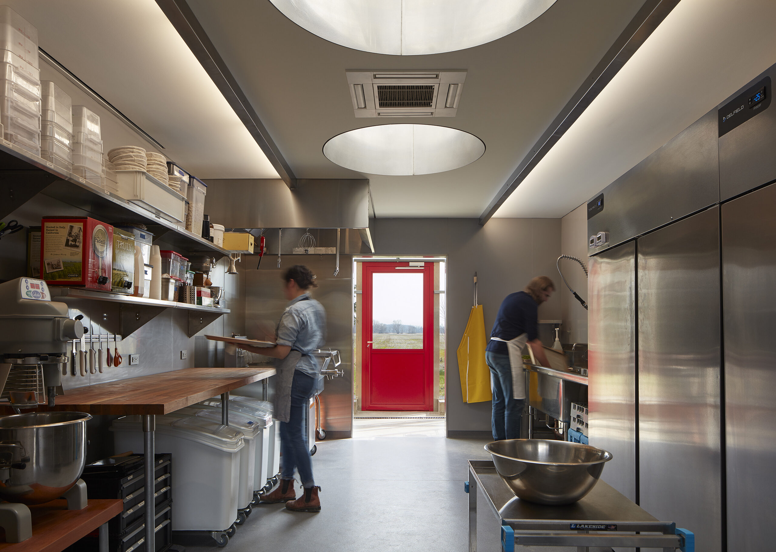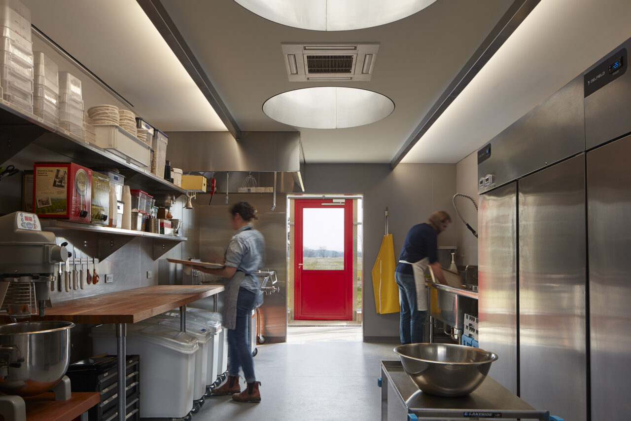 The central zone, designed for maximum program flexibility, uses clear glass to provide unencumbered views out to the fields and sky above. The ever-present kitchen supports daily food and bakery production made from ingredients grown on the farm. It also anchors Granor’s highly successful dinner-at-the-farm program that incorporates movable furniture over the ground concrete floor, allowing the space to quickly transform from a production facility to a place for community and dining events.