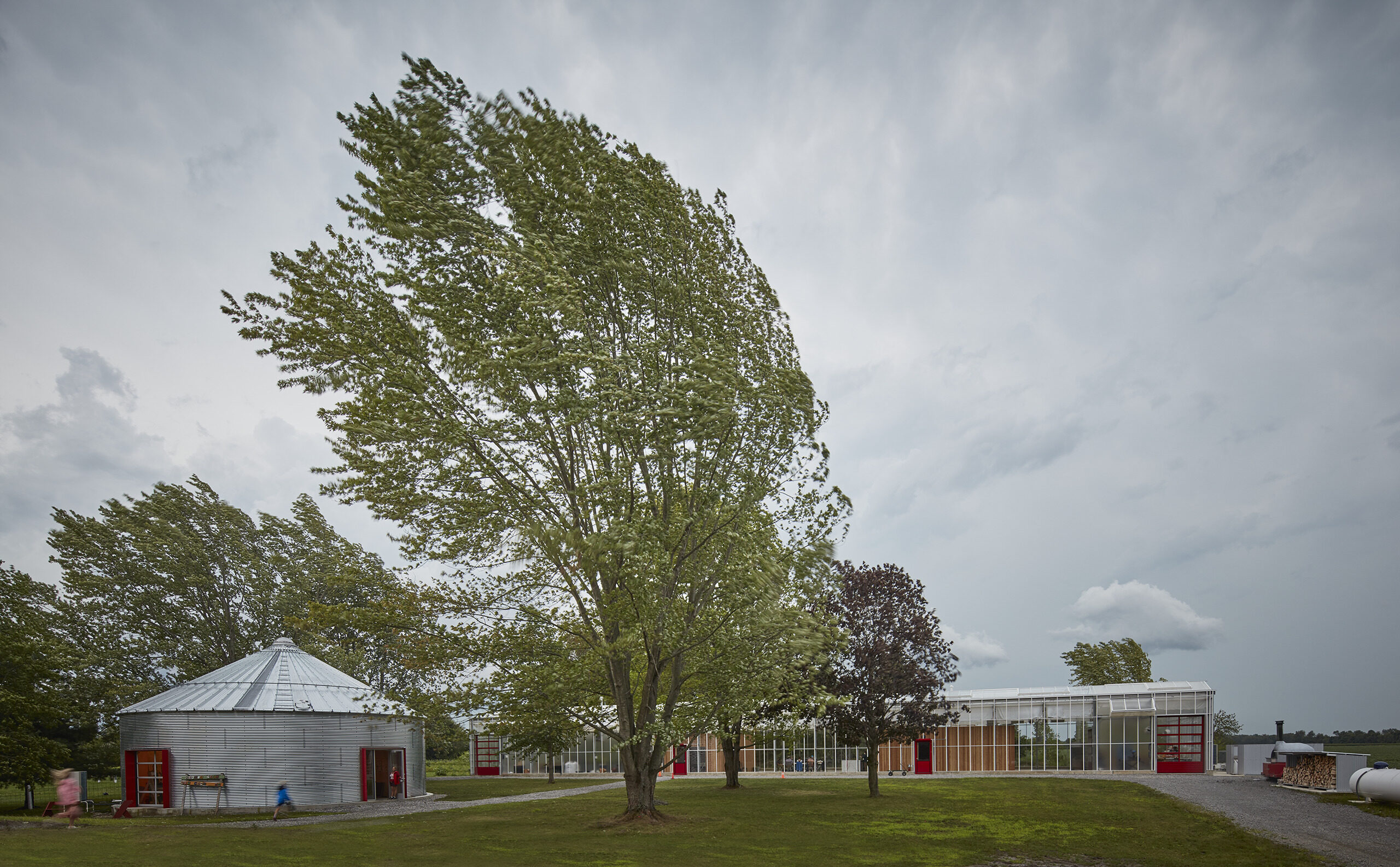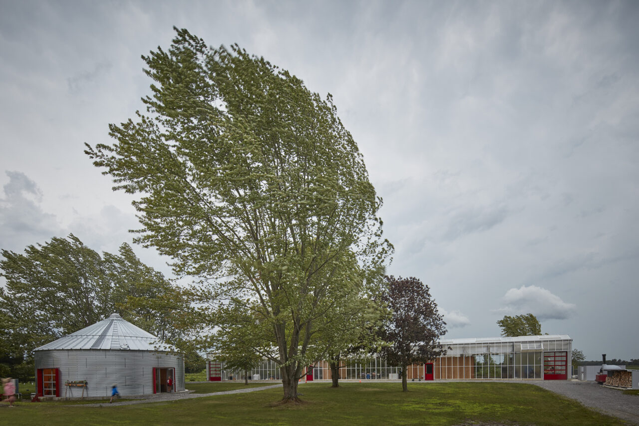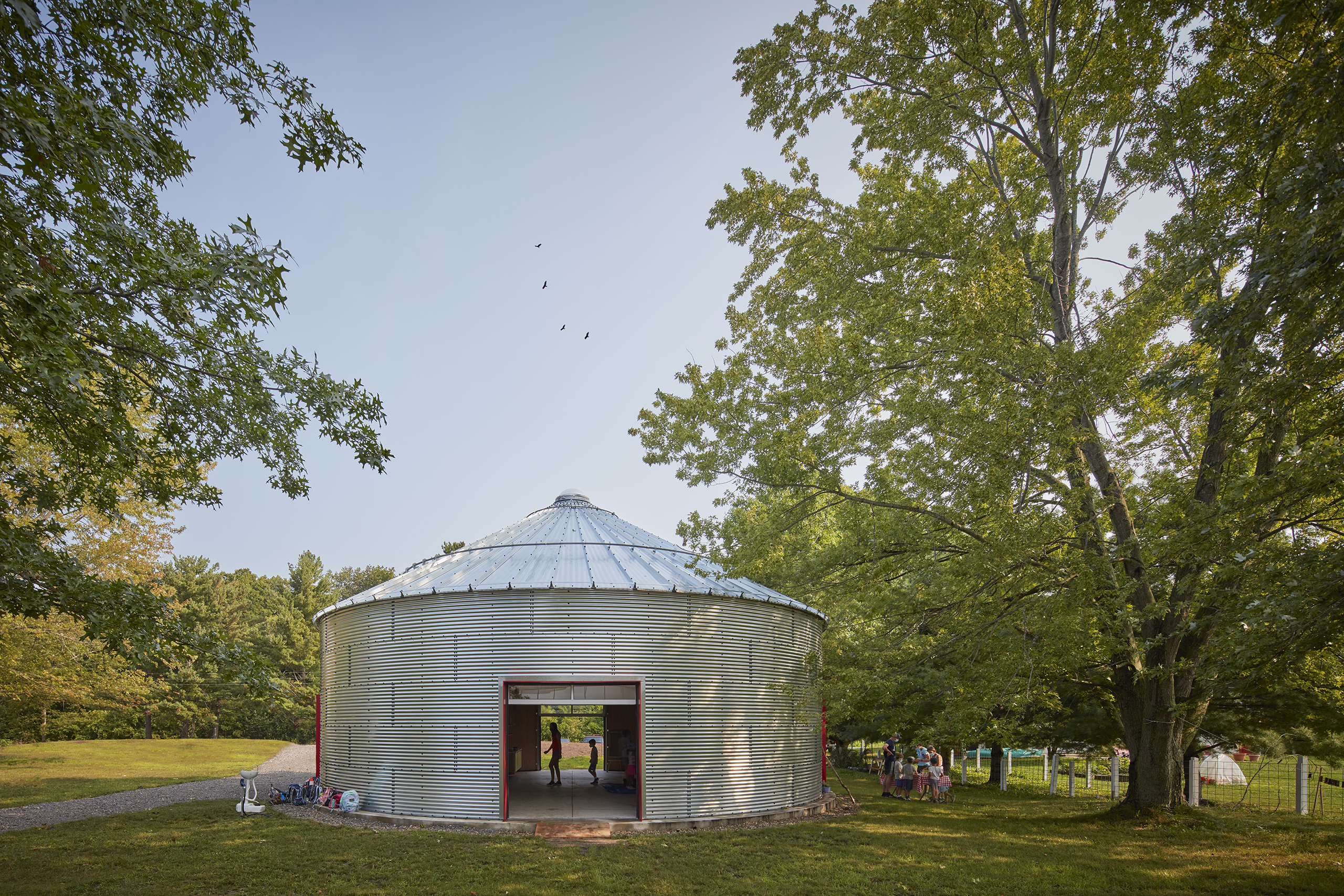 Designed and constructed in tandem with the Granor Greenhouse, the Schoolhouse also uses off the shelf components of a common agrarian form—a 42-foot diameter Brock grain bin—reimagining and adapting it to support various programs.