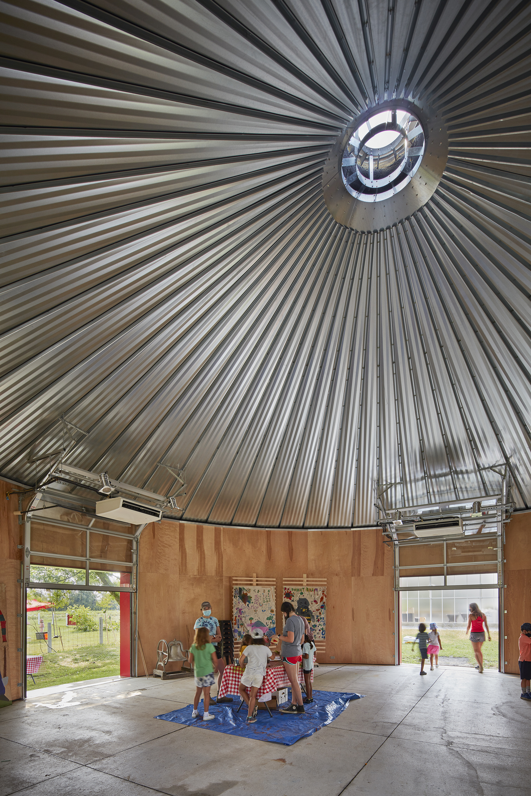 Large glass overhead doors punctuate the round exterior, creating points of connection to the farm from each cardinal point, and with the help of a skylight (substituted for the typical feed port/cap above) fill the space with natural light. The fully insulated interior walls are clad in Douglas Fir plywood to bring material warmth, residing under the double skinned, gleaming metal ceiling. The large, open plan provides the perfect environment for art projects, skits, games, and additional gathering space for farm events.