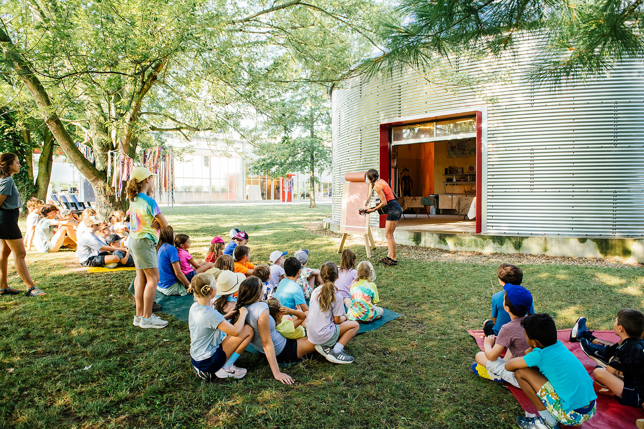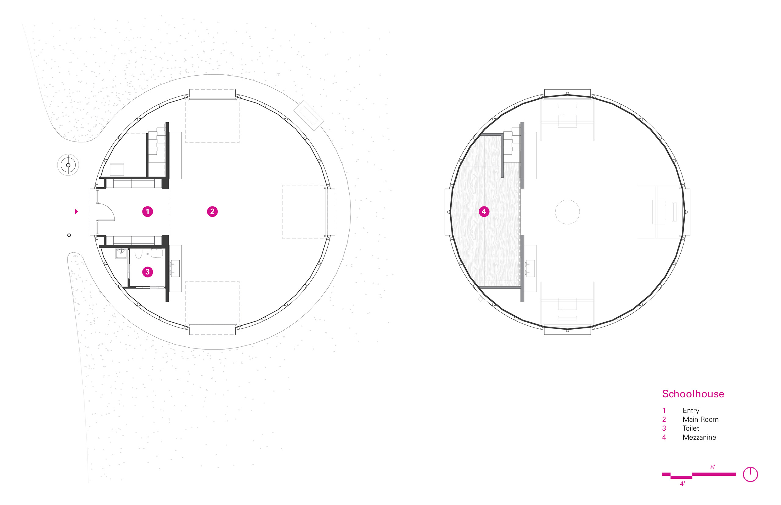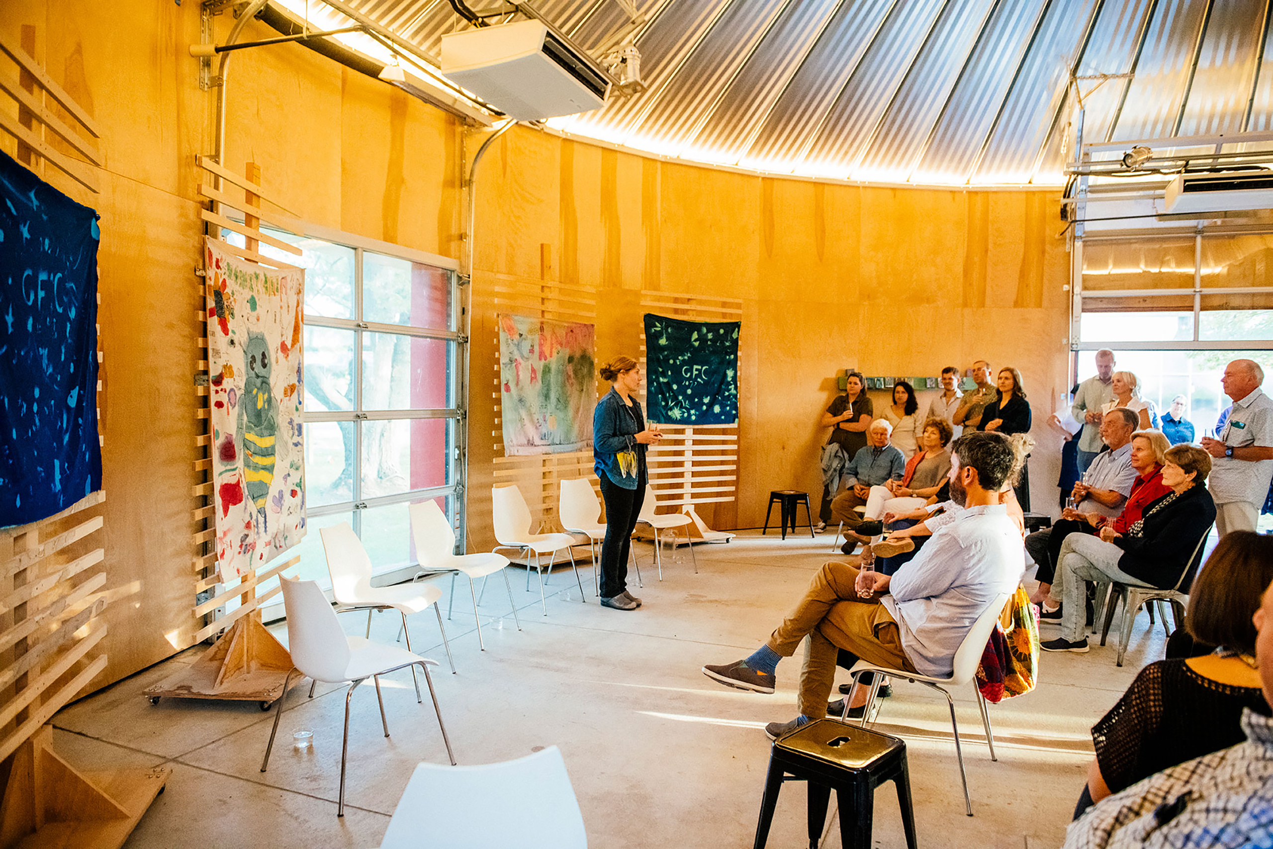 Designed and constructed in tandem with the Granor Greenhouse, the Schoolhouse also uses off the shelf components of a common agrarian form—a 42-foot diameter Brock grain bin—reimagining and adapting it to support various programs.