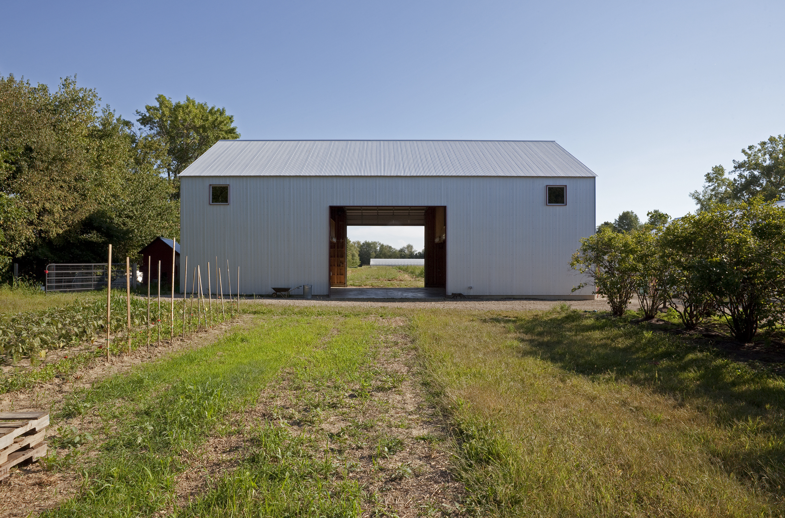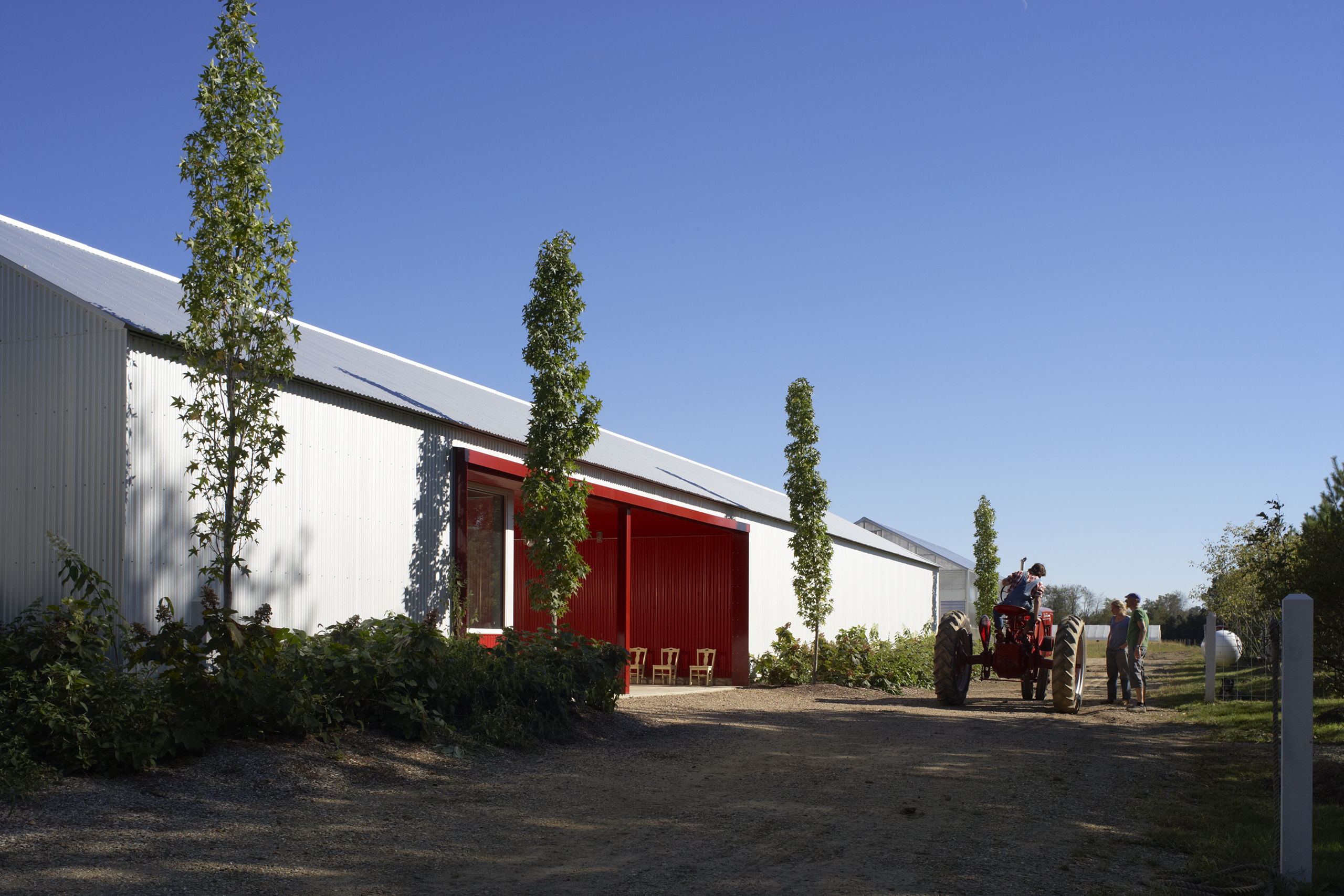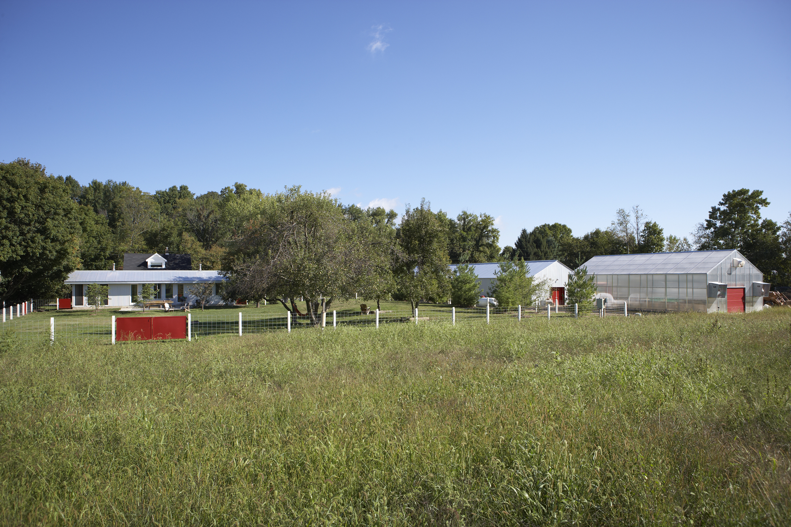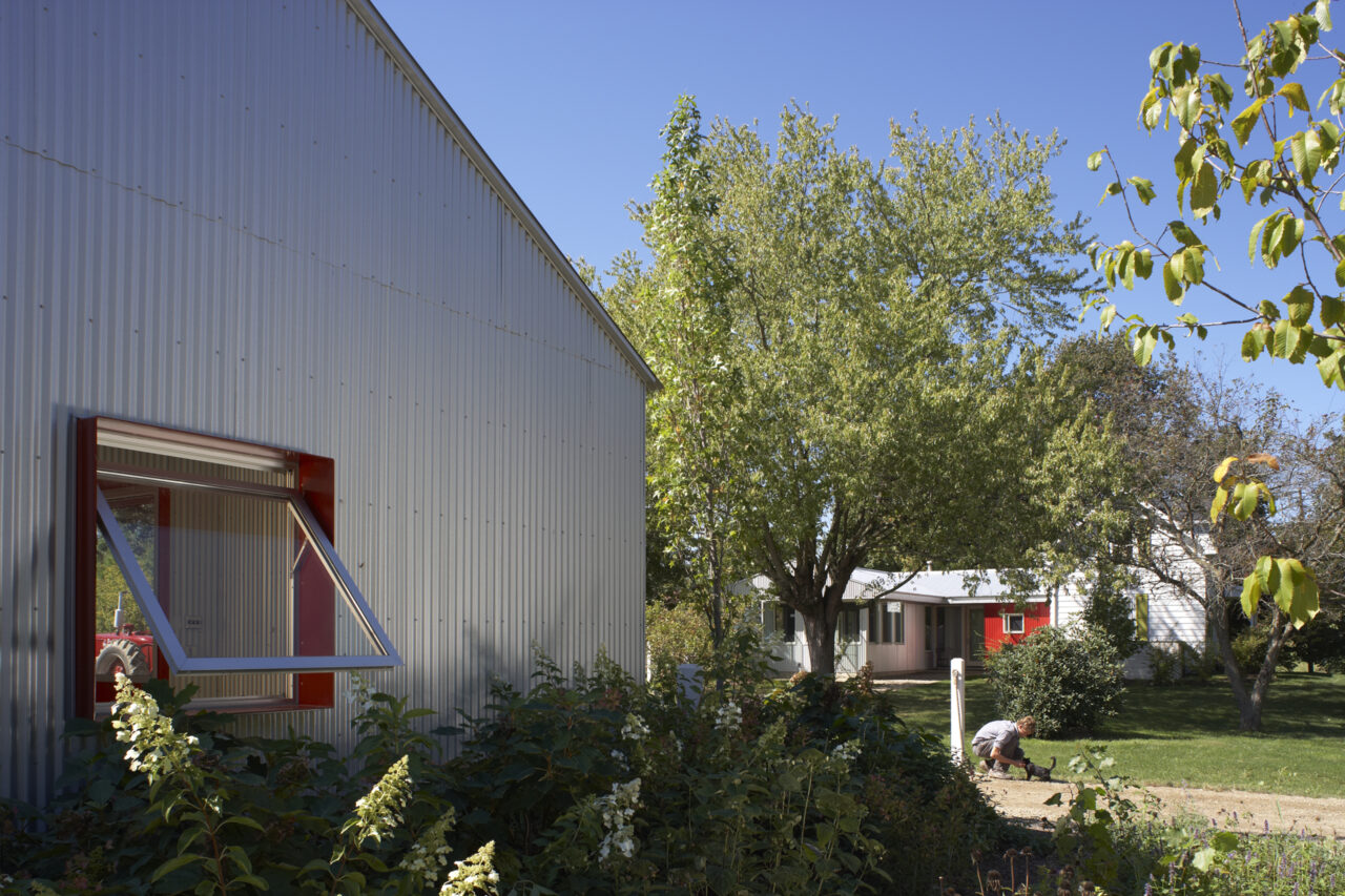 The original 16′ × 24′ frame house was rehabilitated and repainted white to function as office and staff lodging. New construction includes a utility/entry dogtrot and a one-story kitchen, dining, and porch volume, both clad in galvalume with red siding used selectively as an accent. The initial phase delivered a vehicle barn and greenhouse; the second phase added an exterior solar-heated washstand and a 40′ × 60′ two-story barn with seasonal staff quarters.