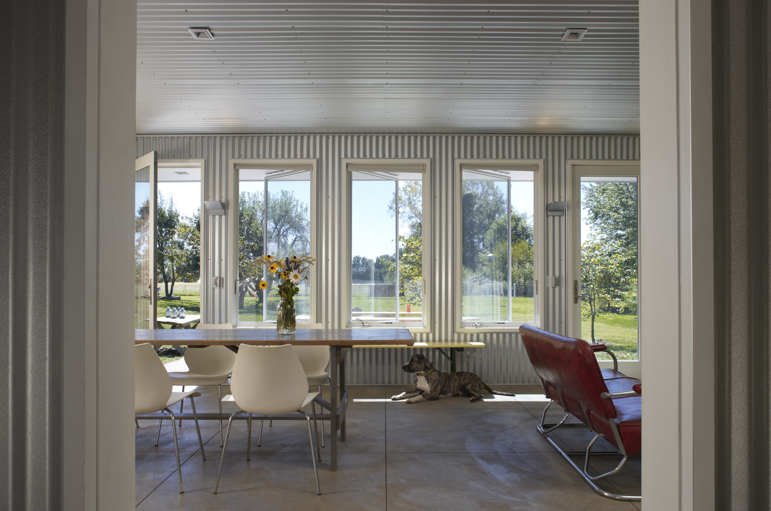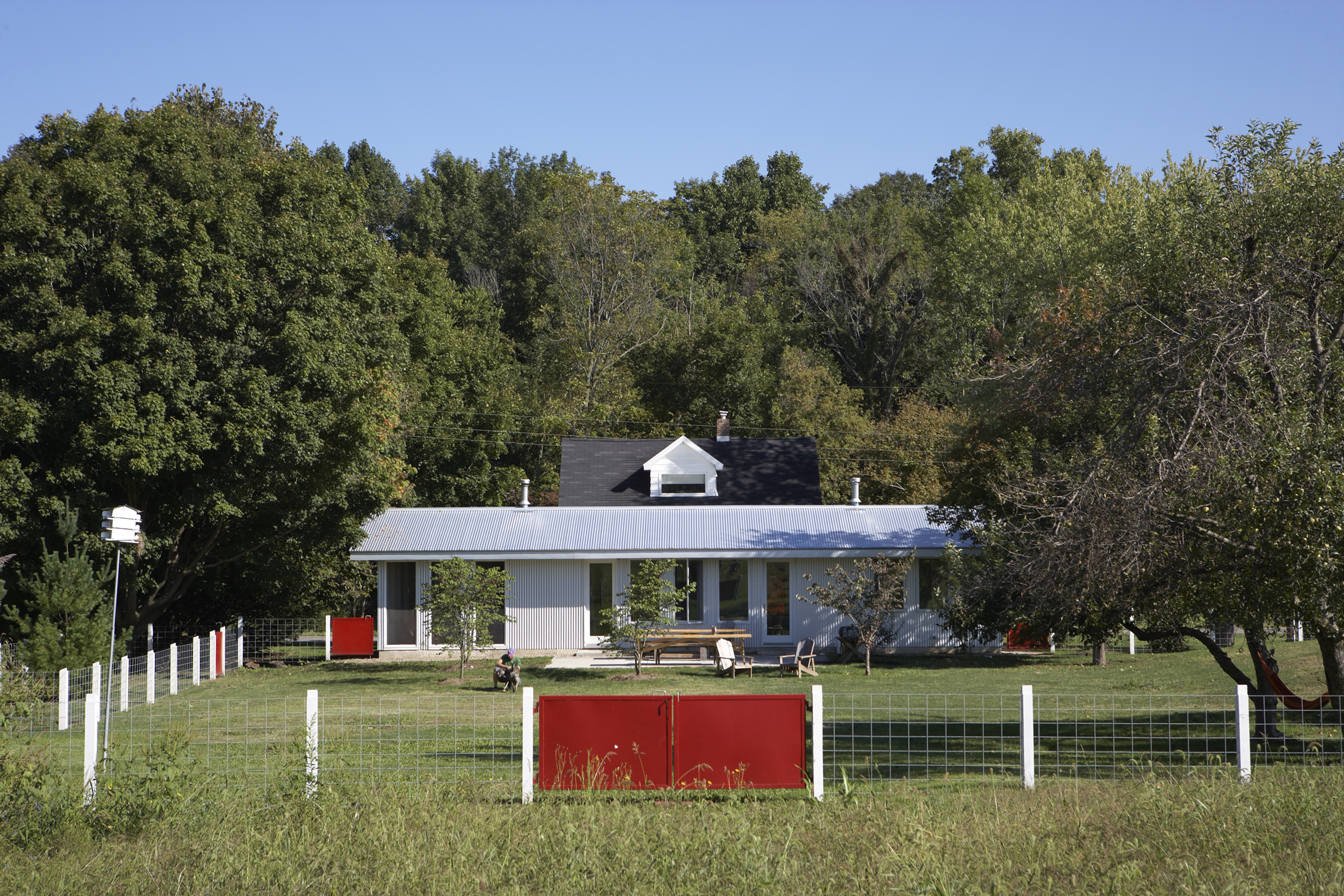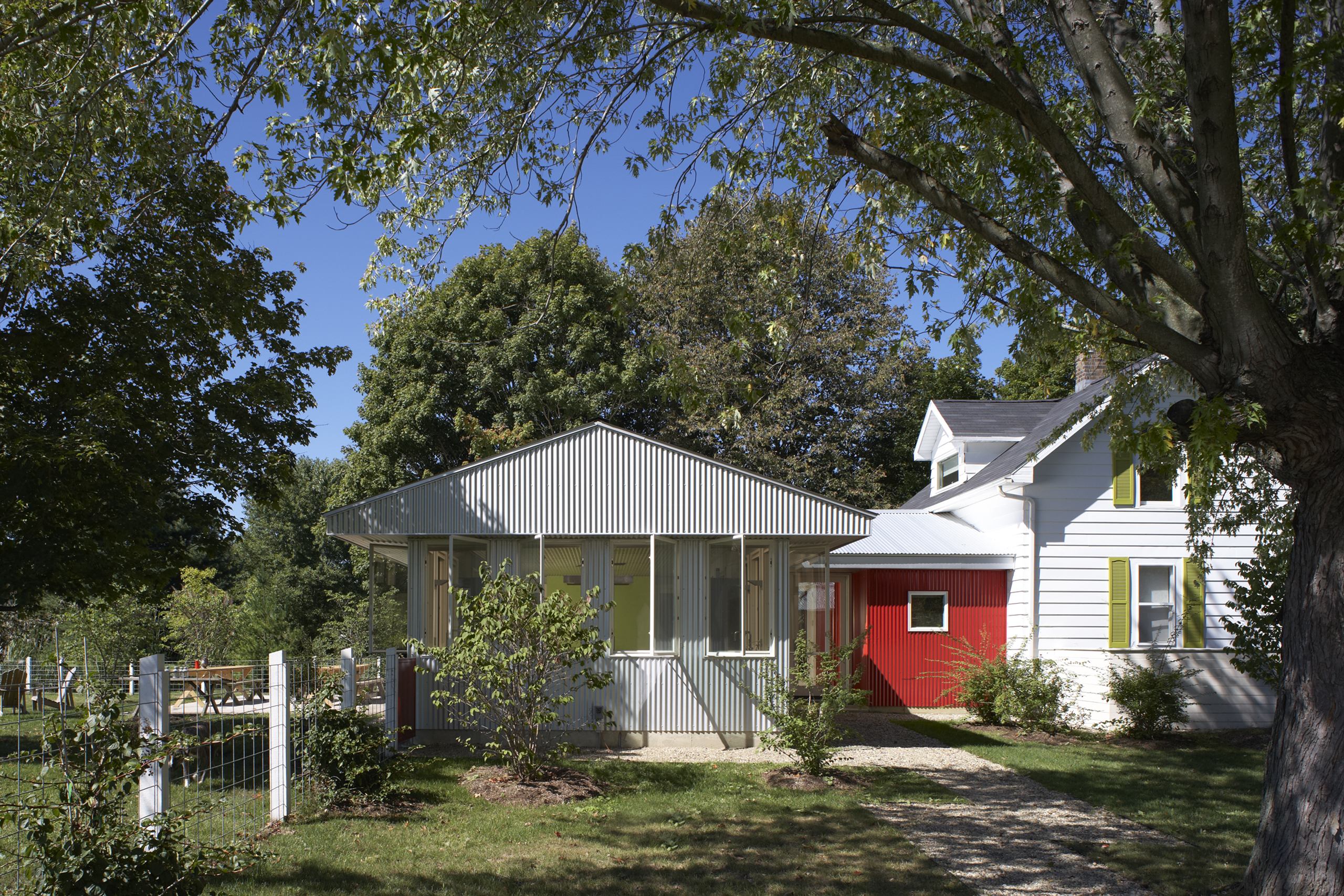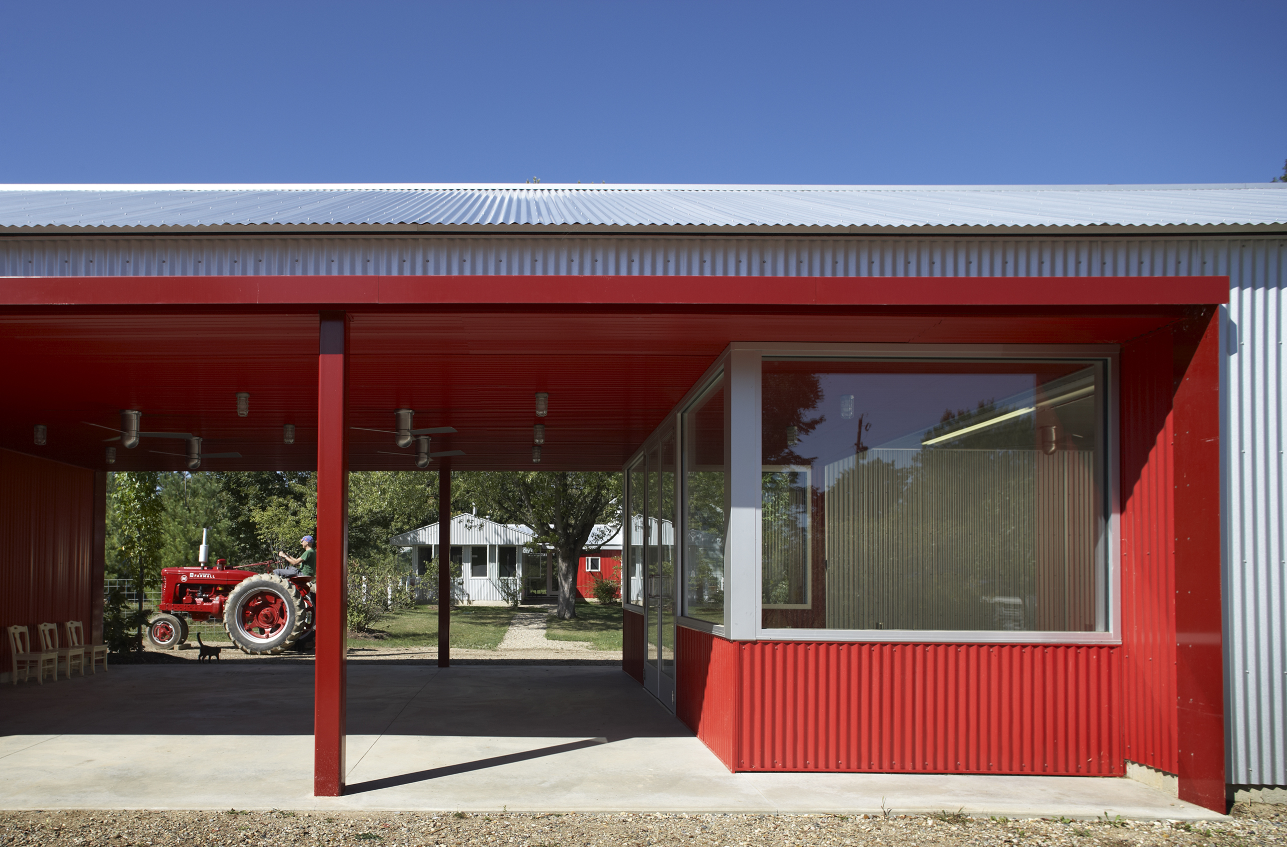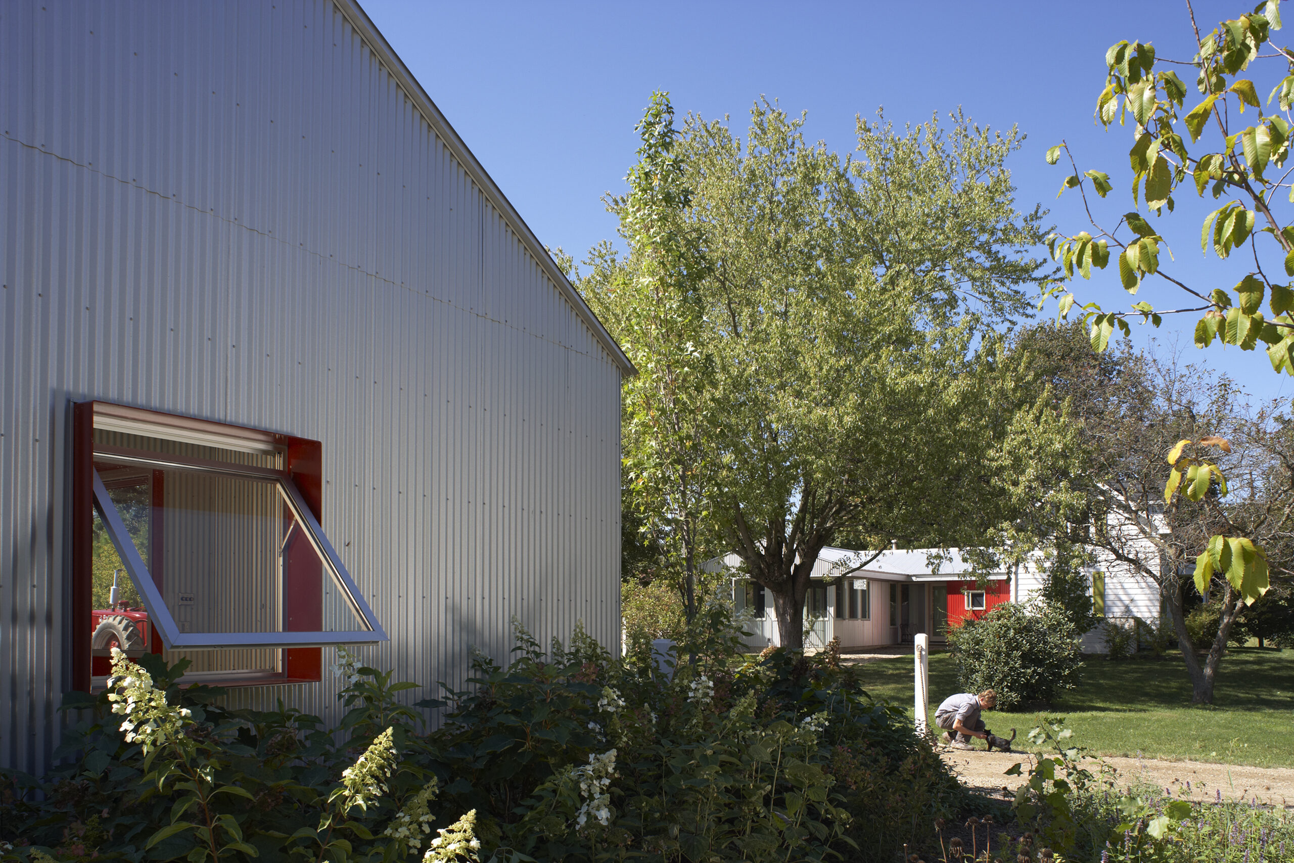 The original 16′ × 24′ frame house was rehabilitated and repainted white to function as office and staff lodging. New construction includes a utility/entry dogtrot and a one-story kitchen, dining, and porch volume, both clad in galvalume with red siding used selectively as an accent. The initial phase delivered a vehicle barn and greenhouse; the second phase added an exterior solar-heated washstand and a 40′ × 60′ two-story barn with seasonal staff quarters.