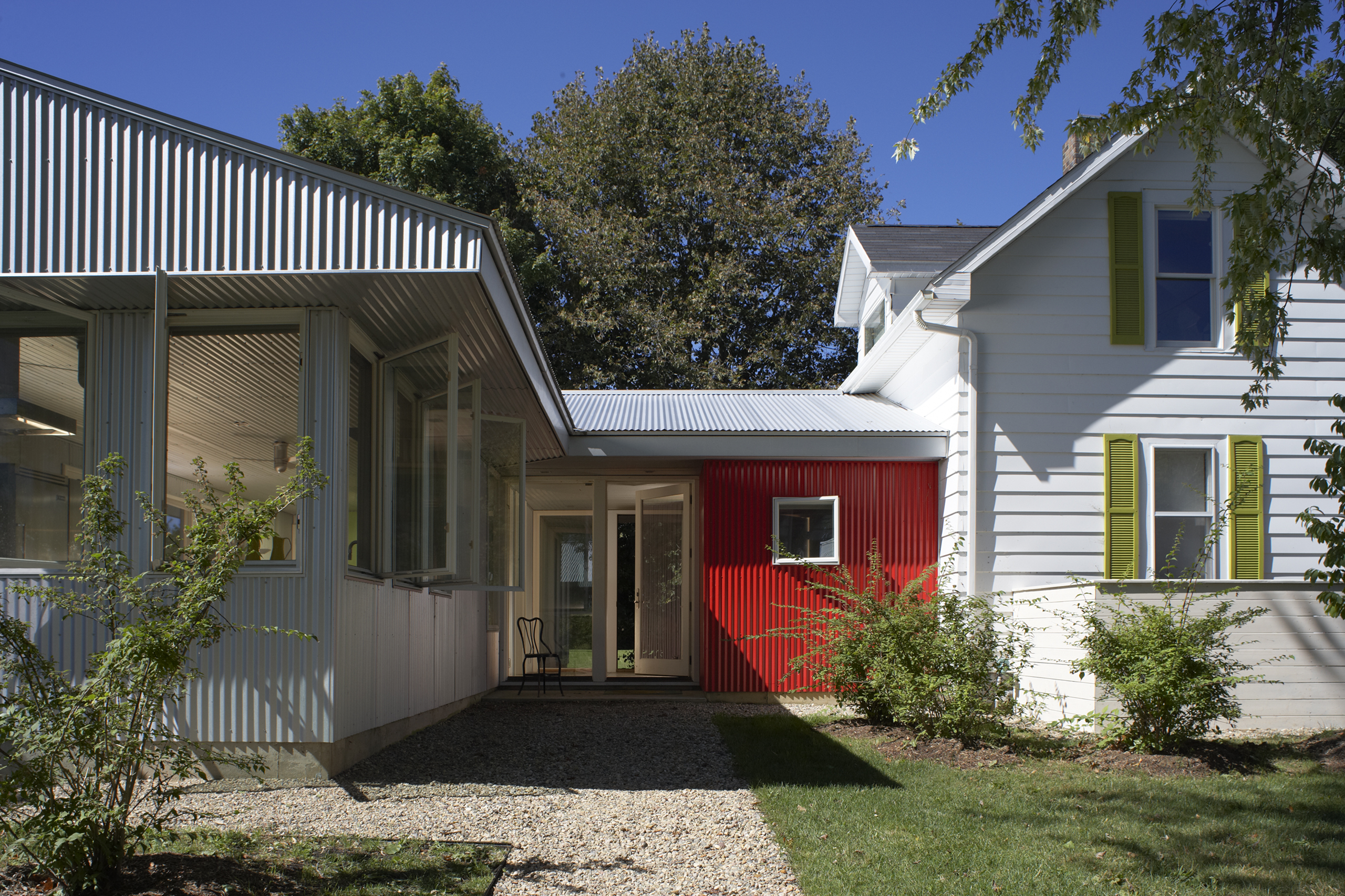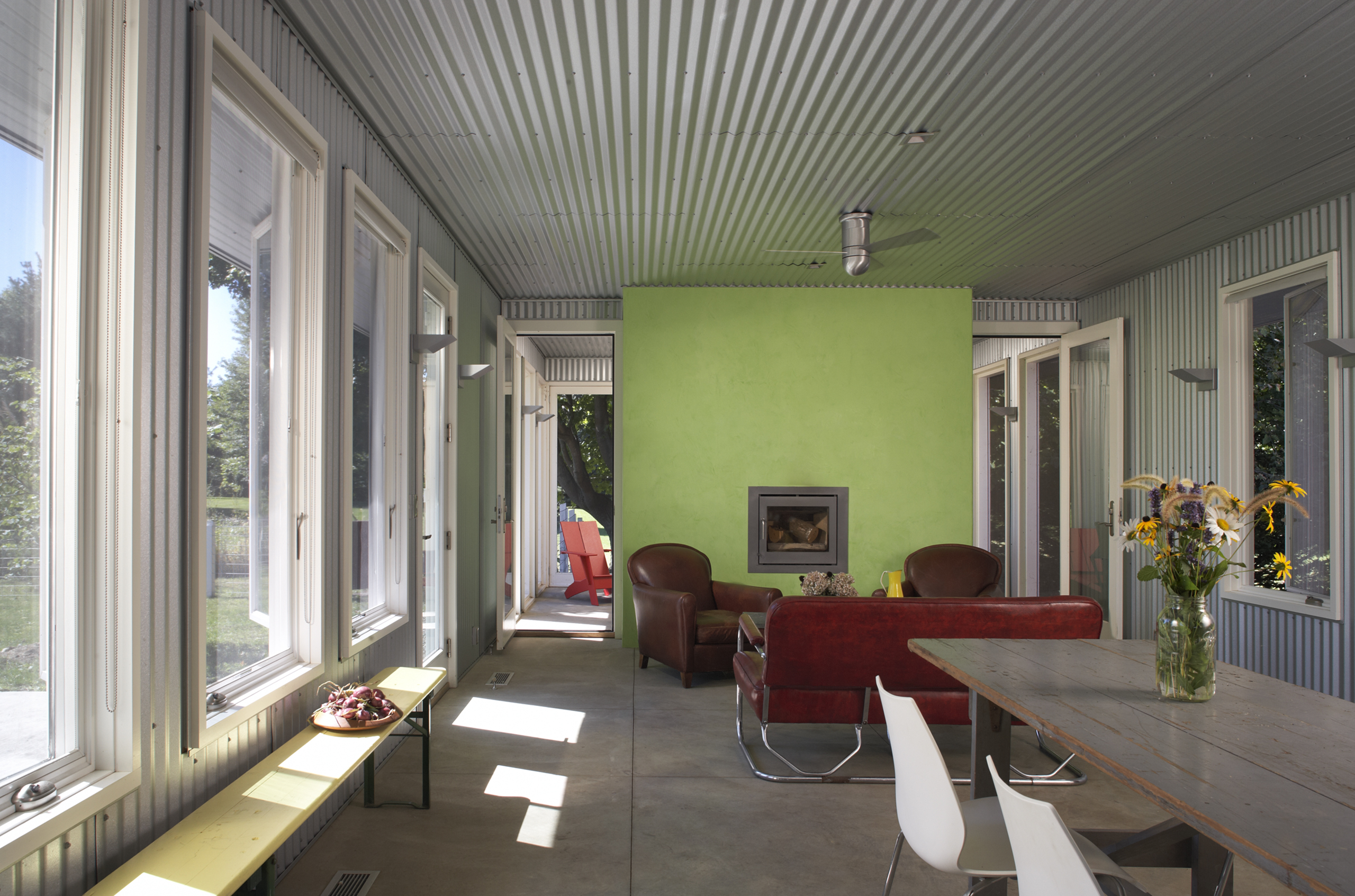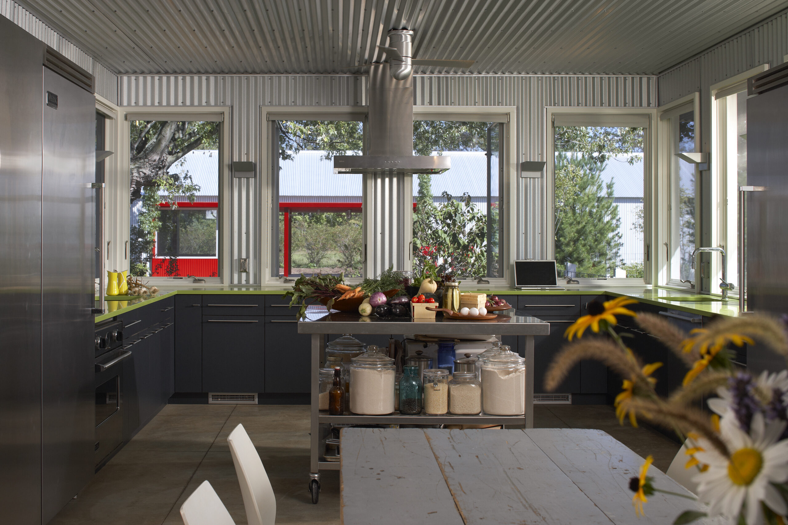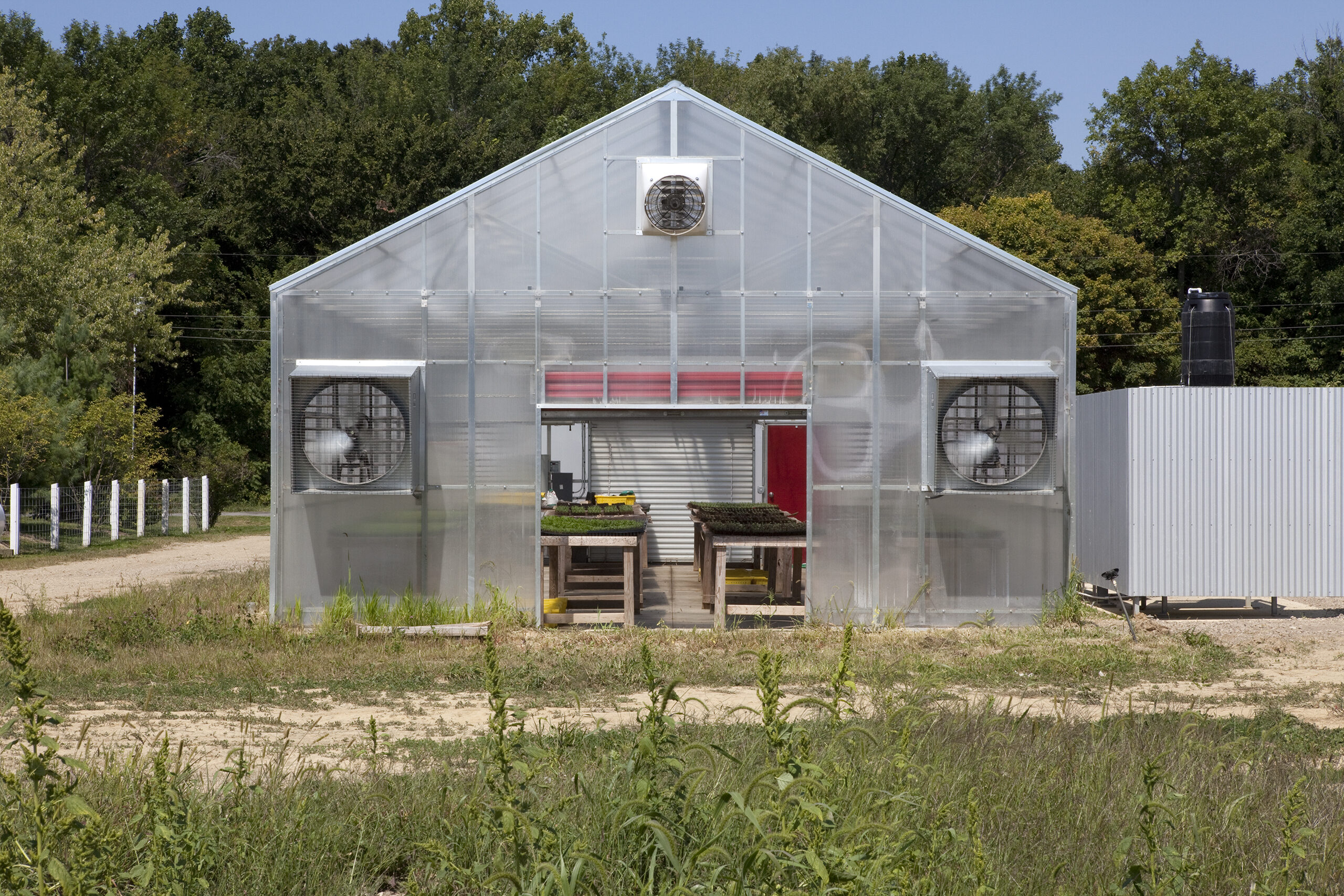 The original 16′ × 24′ frame house was rehabilitated and repainted white to function as office and staff lodging. New construction includes a utility/entry dogtrot and a one-story kitchen, dining, and porch volume, both clad in galvalume with red siding used selectively as an accent. The initial phase delivered a vehicle barn and greenhouse; the second phase added an exterior solar-heated washstand and a 40′ × 60′ two-story barn with seasonal staff quarters.