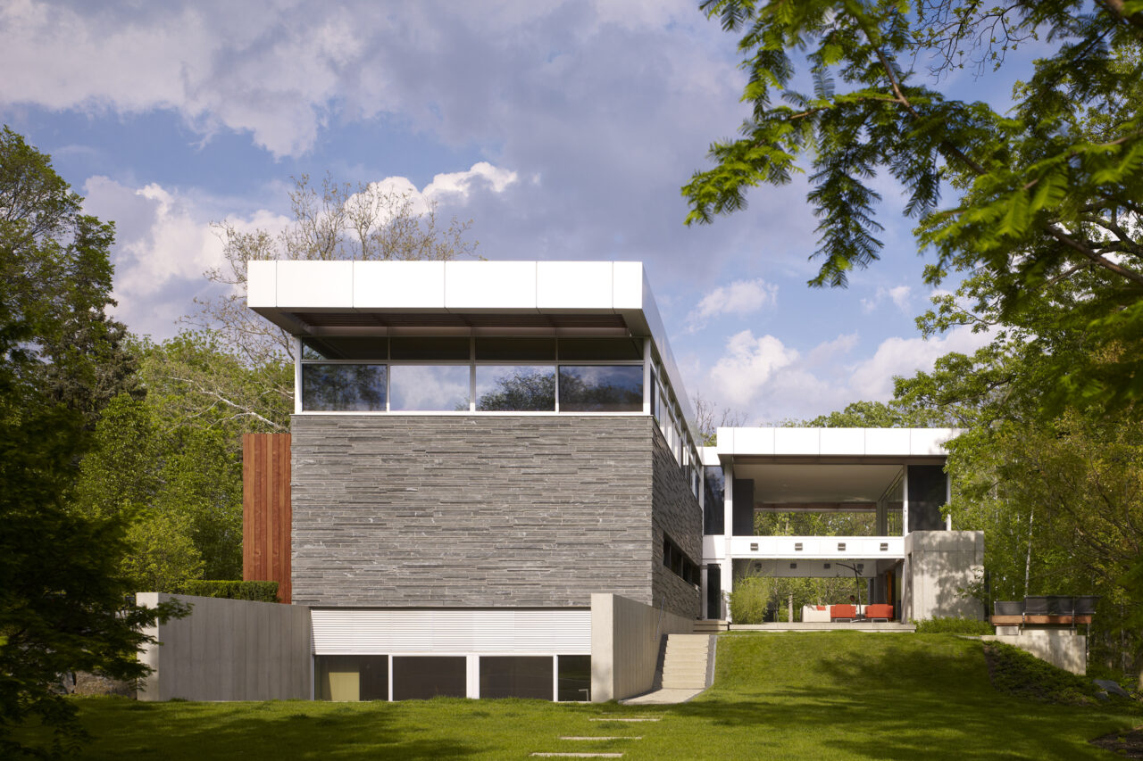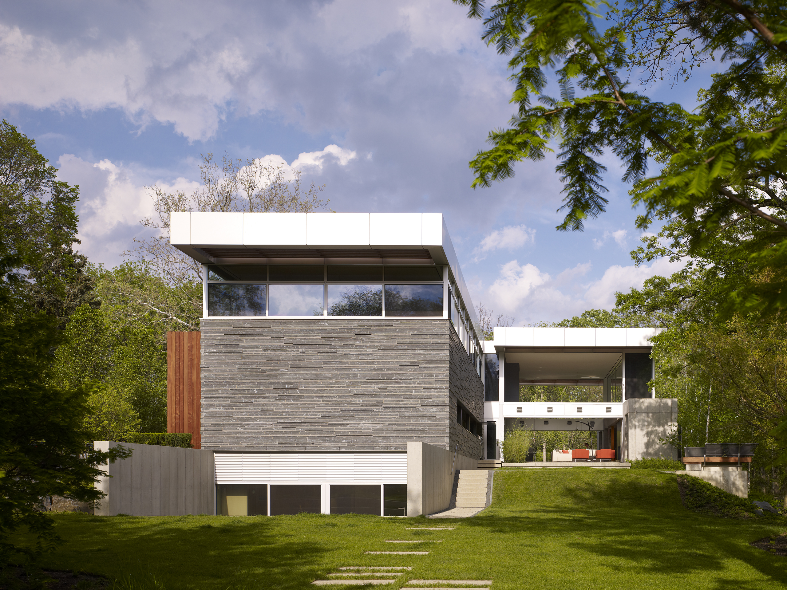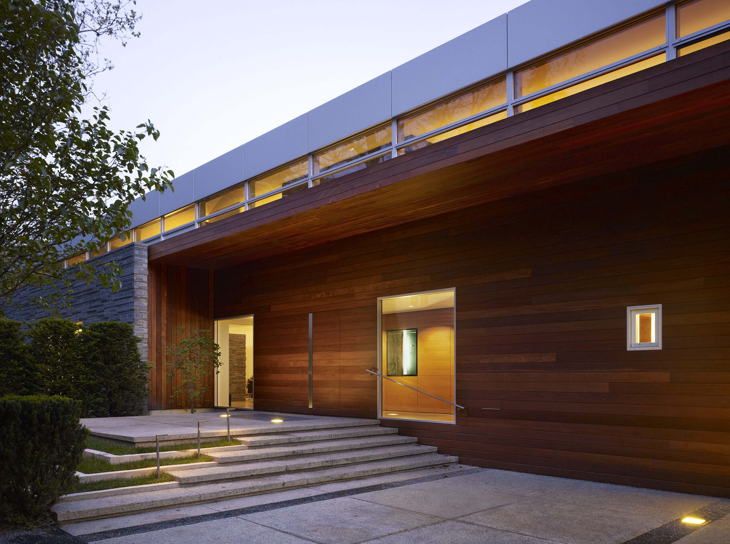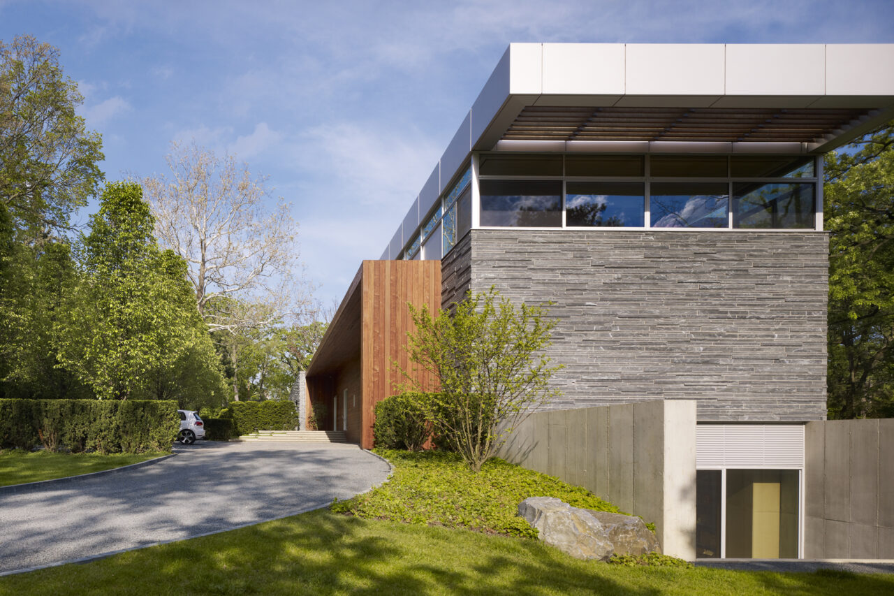 Situated on a suburban wooded lot, this house is pulled back from the road and rotated to visually diminish its presence and maximize its ideal exposure to the sun and protected views.
