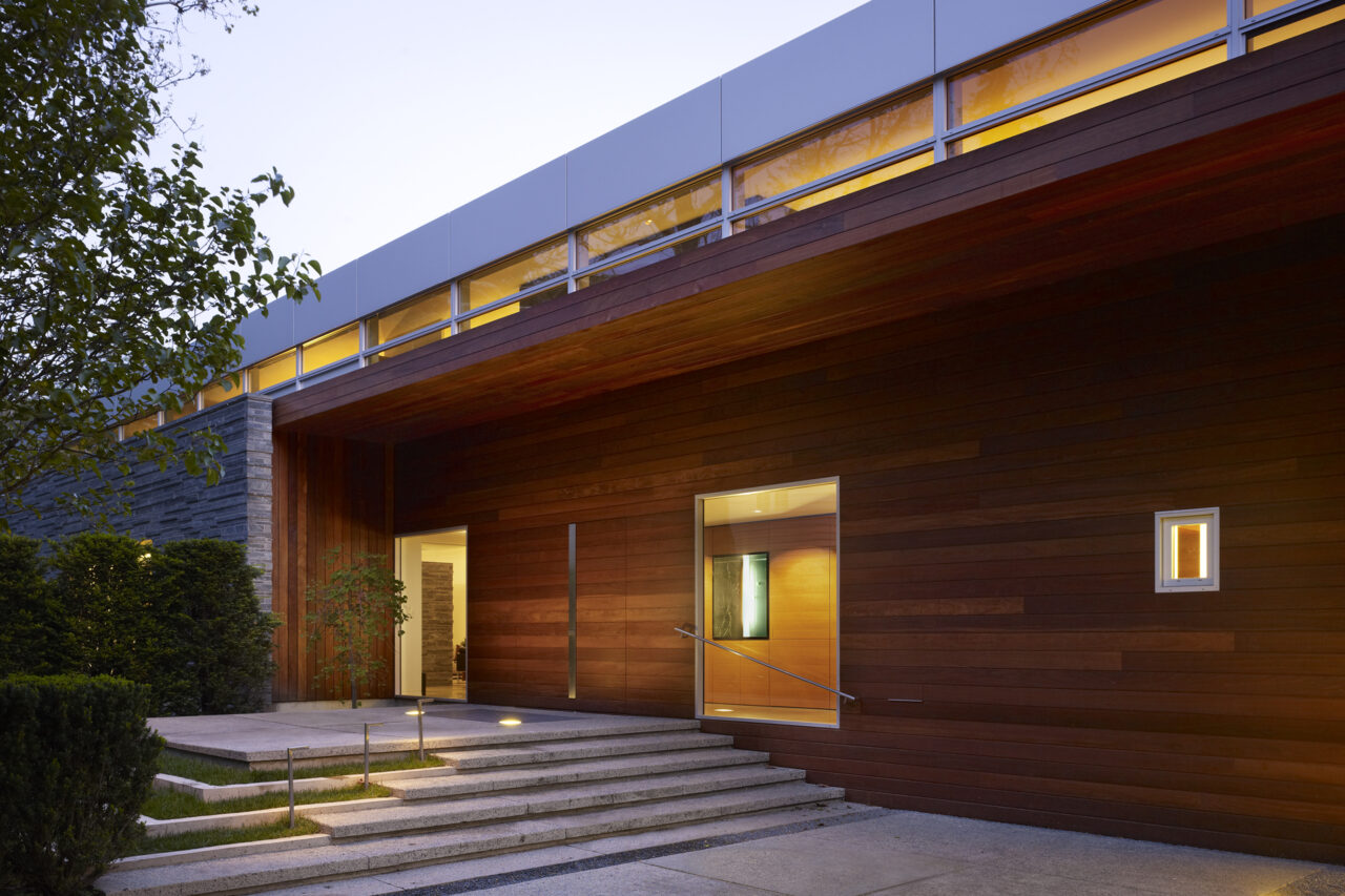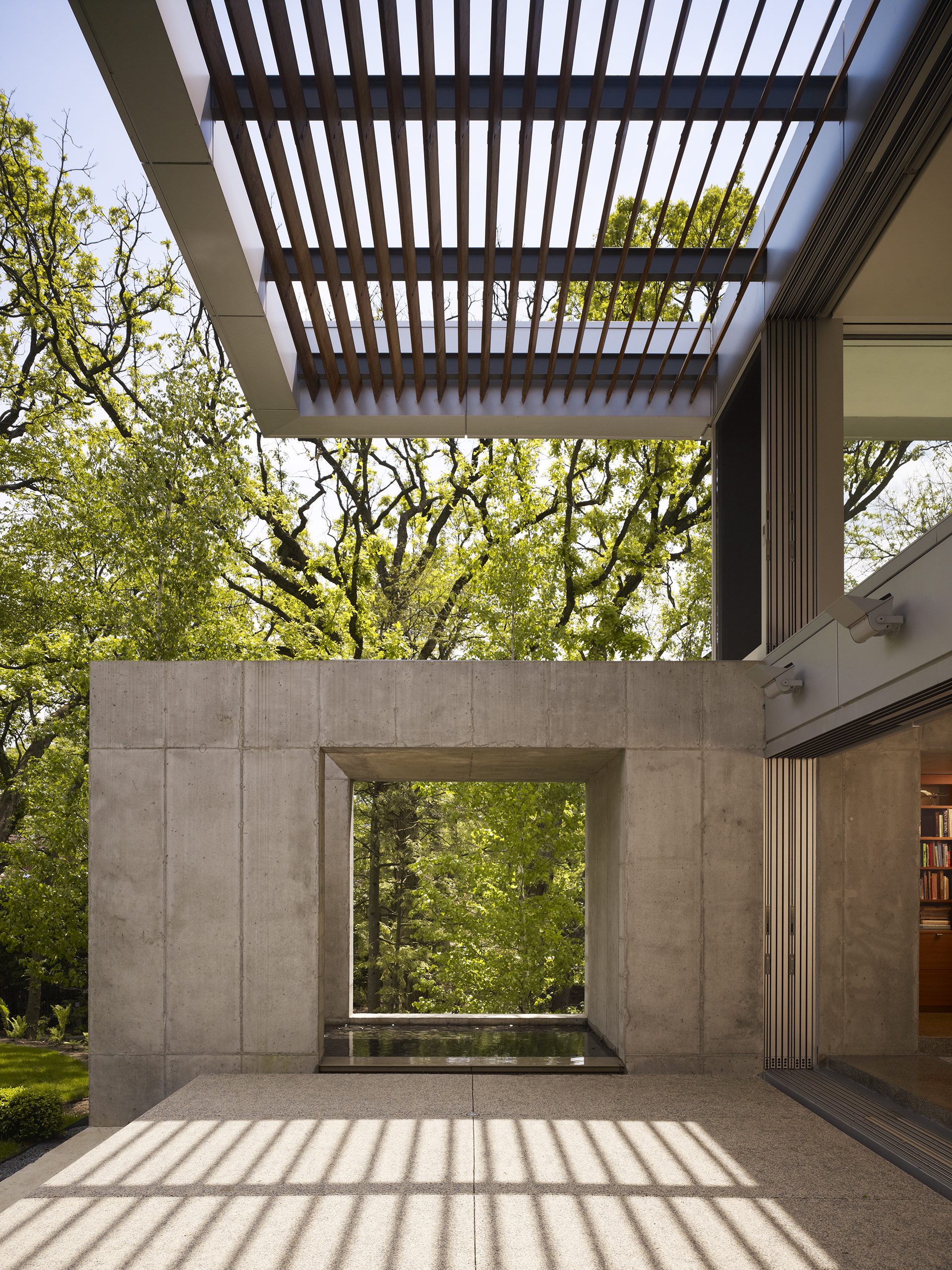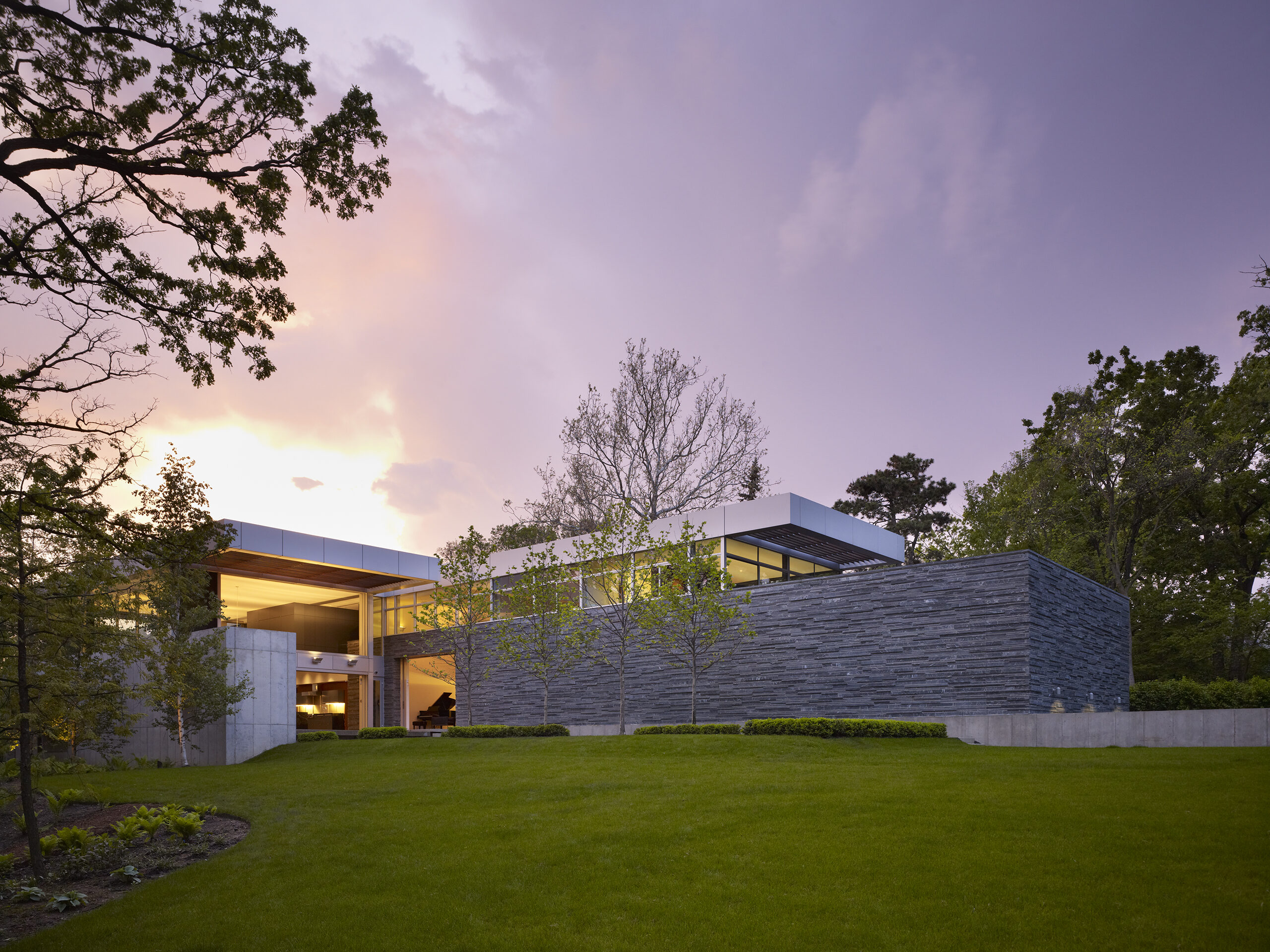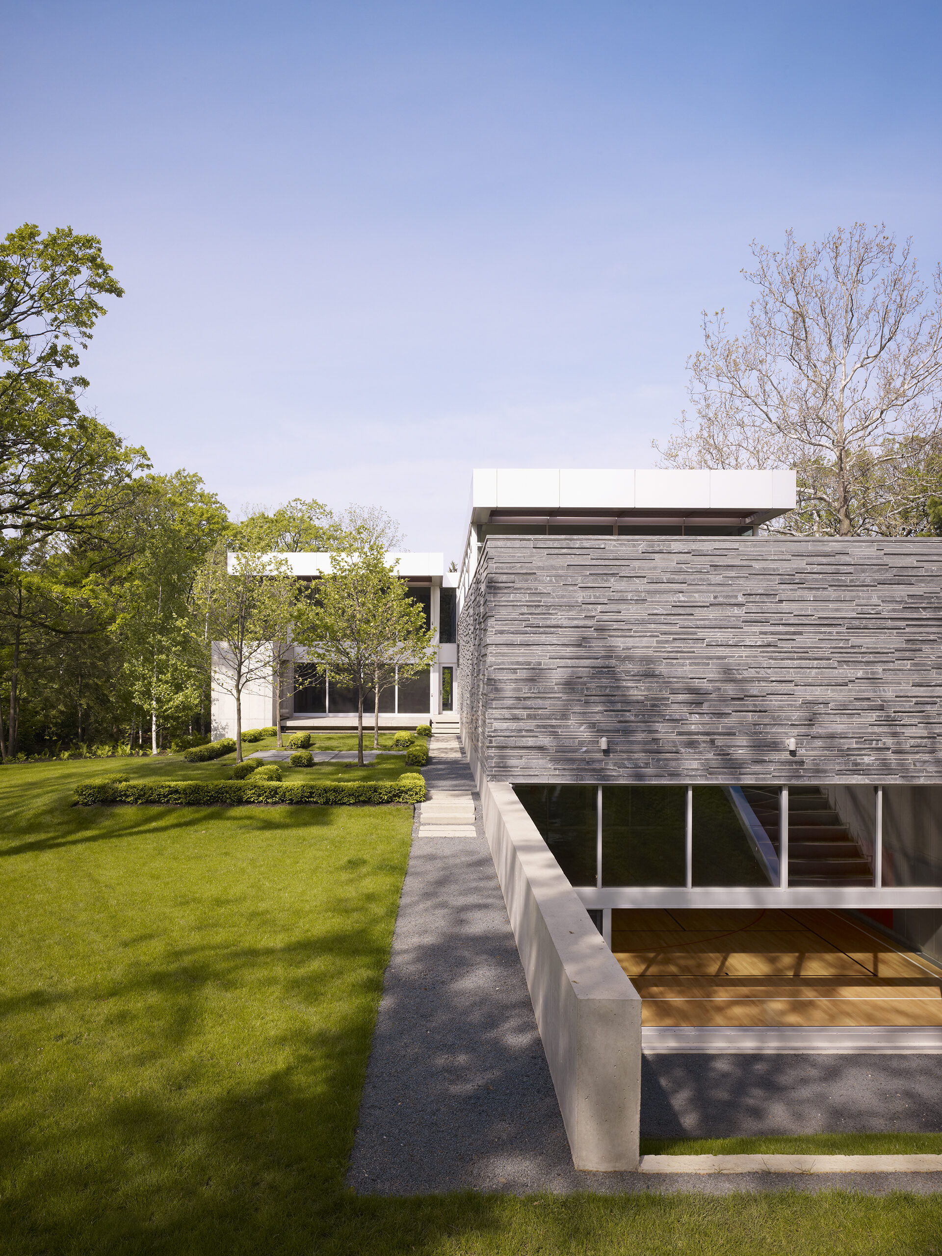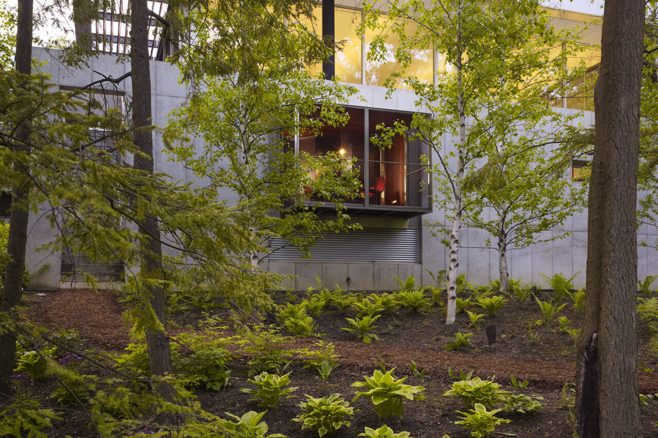 Situated on a suburban wooded lot, this house is pulled back from the road and rotated to visually diminish its presence and maximize its ideal exposure to the sun and protected views.