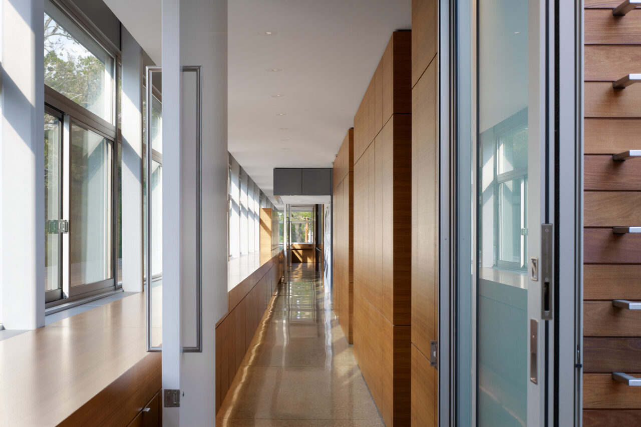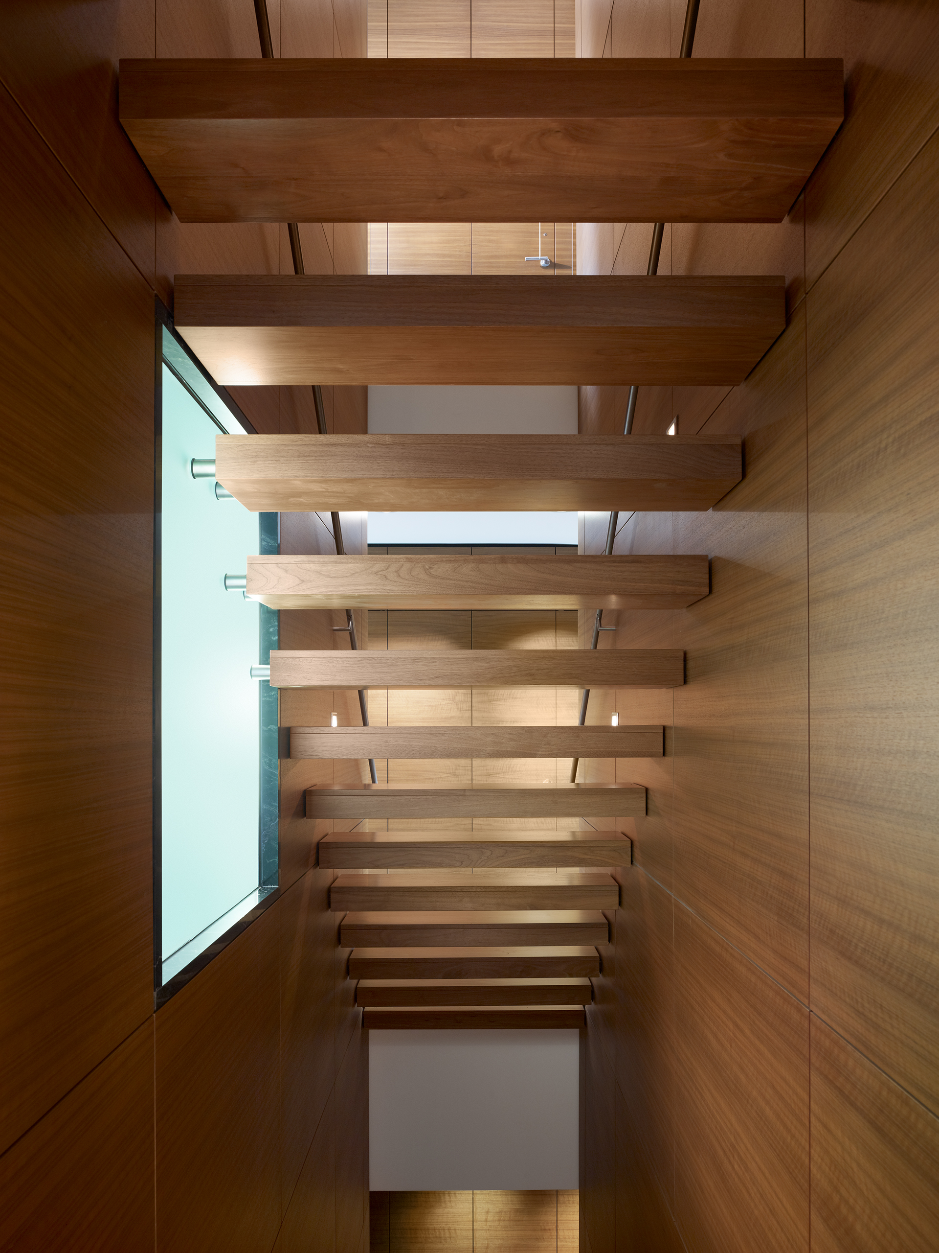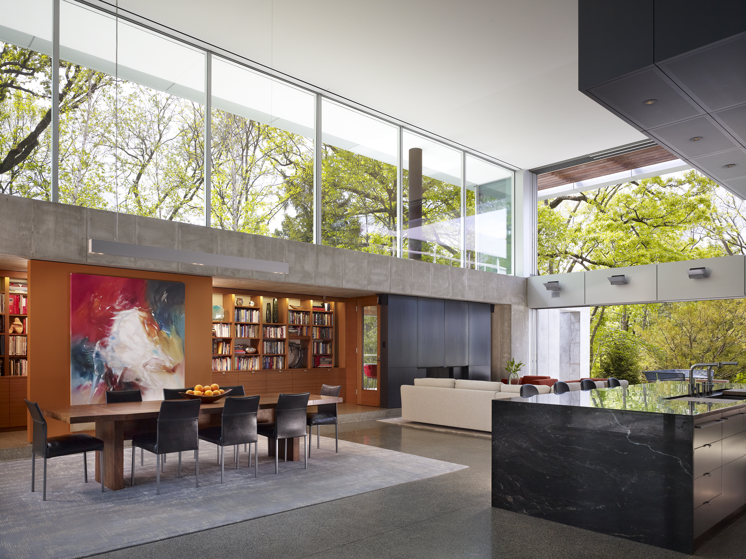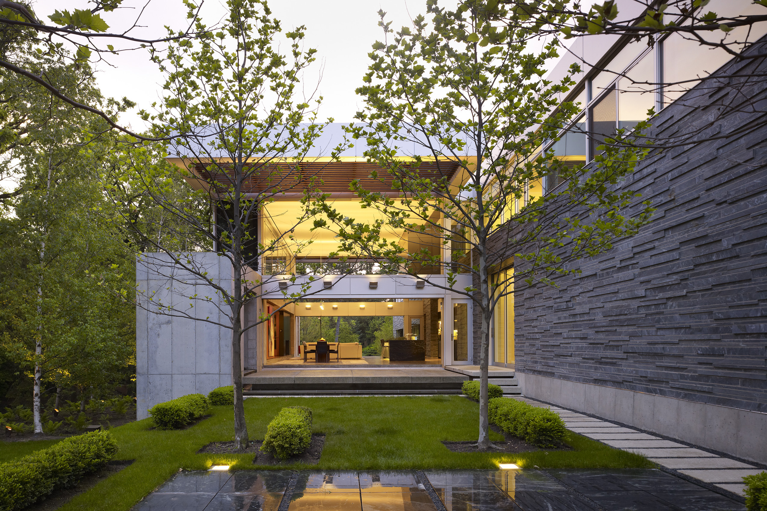 Situated on a suburban wooded lot, this house is pulled back from the road and rotated to visually diminish its presence and maximize its ideal exposure to the sun and protected views.