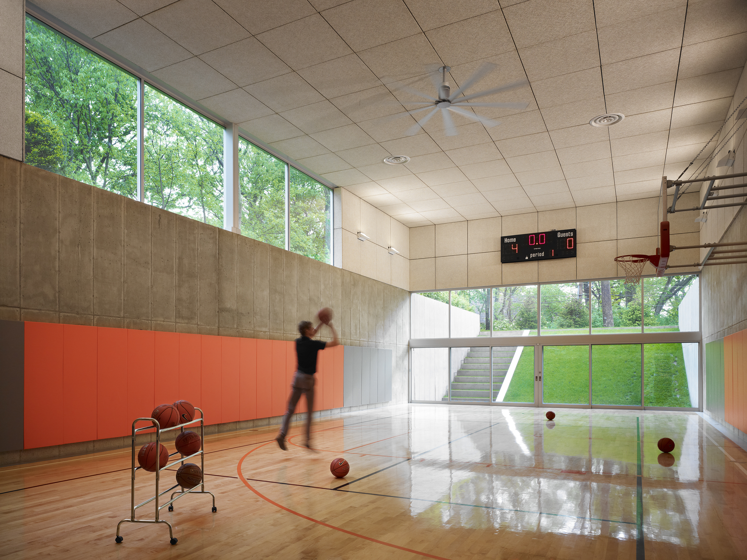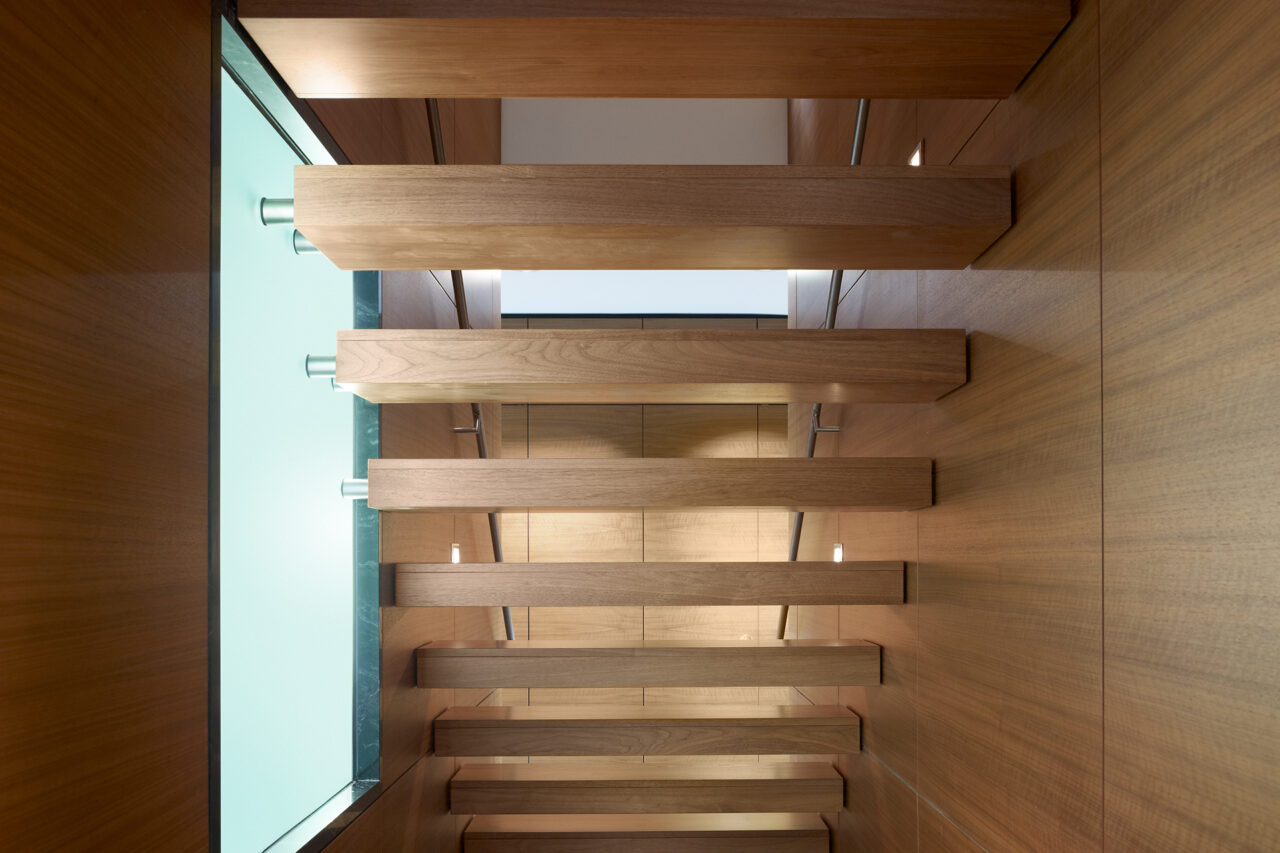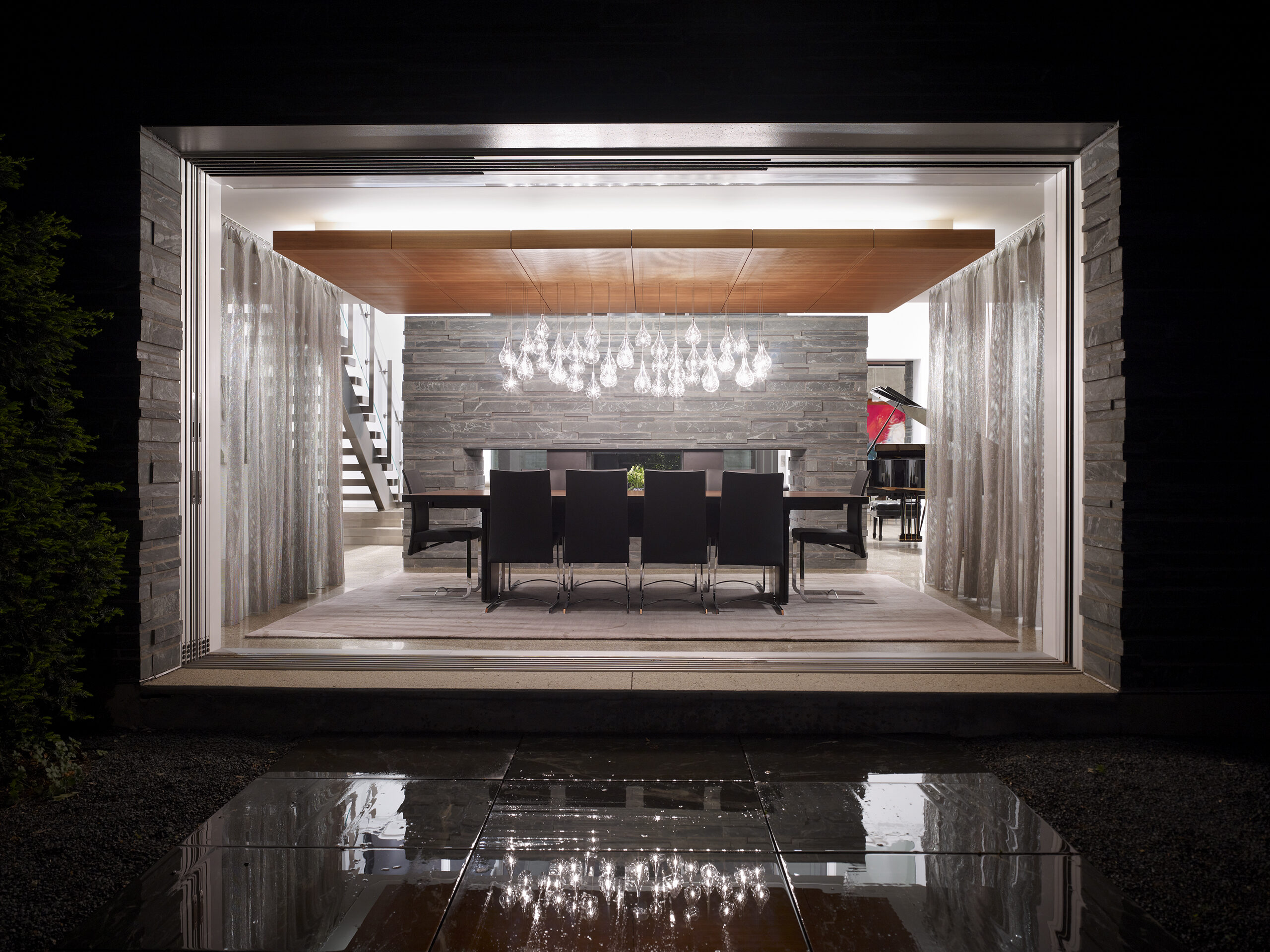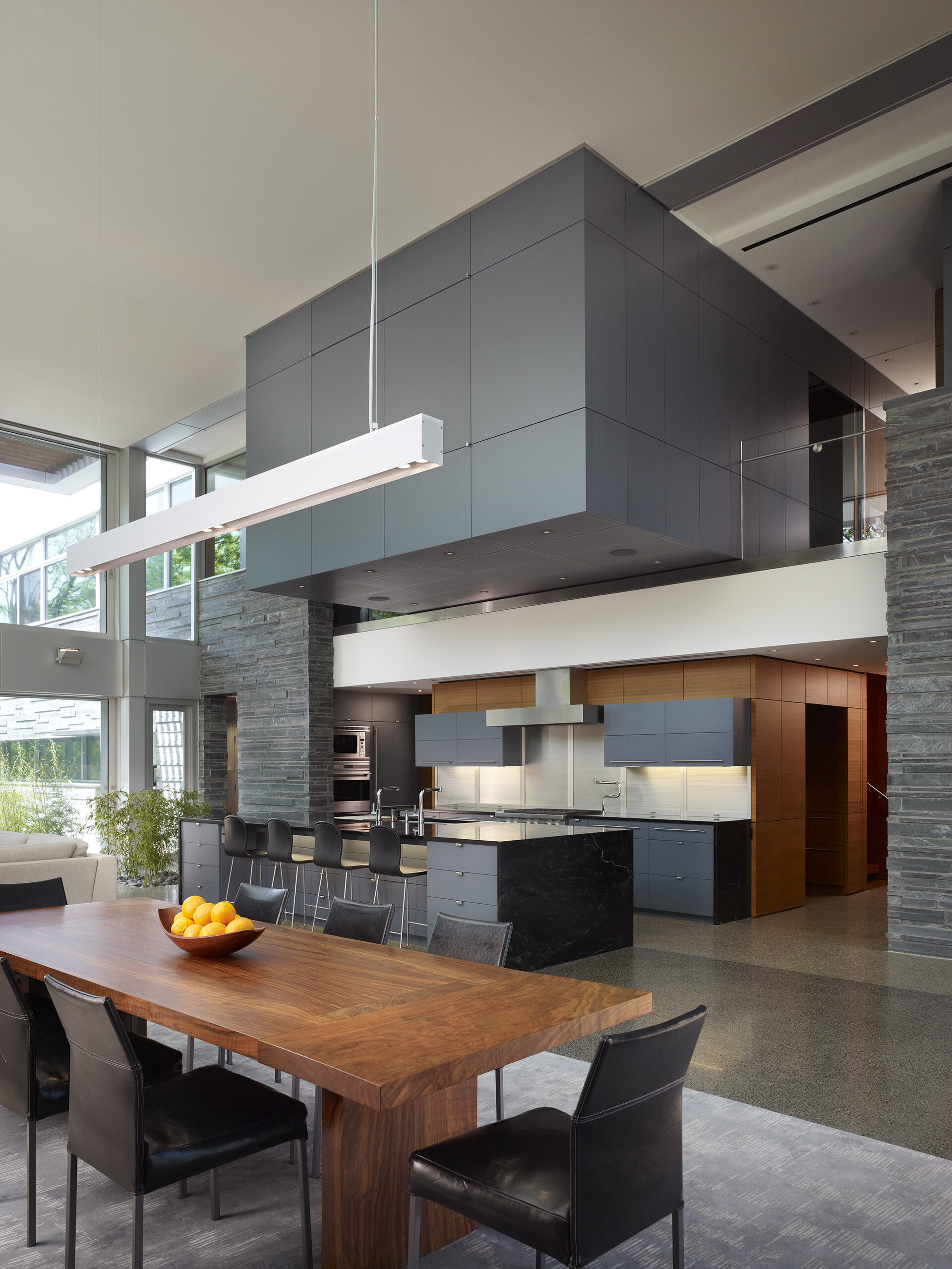 Situated on a suburban wooded lot, this house is pulled back from the road and rotated to visually diminish its presence and maximize its ideal exposure to the sun and protected views.