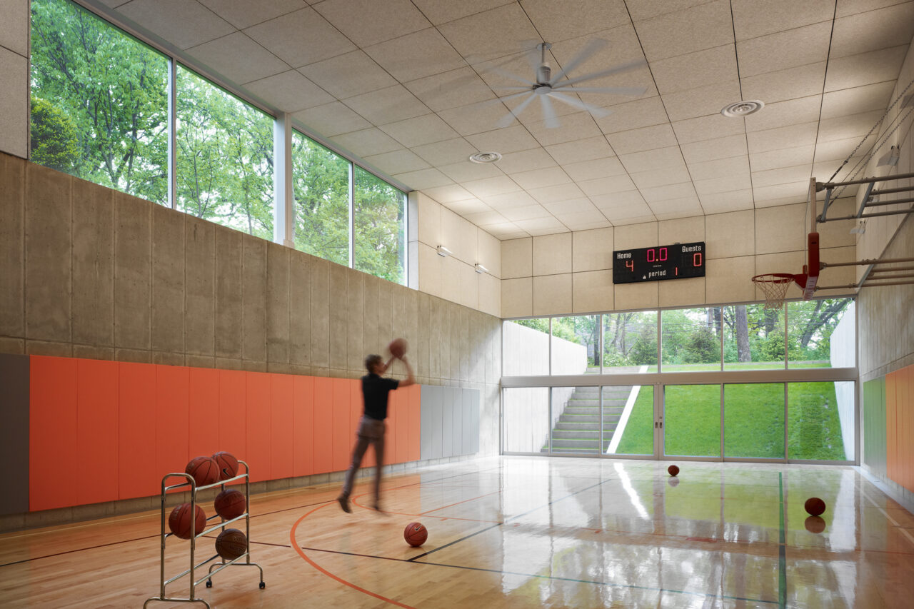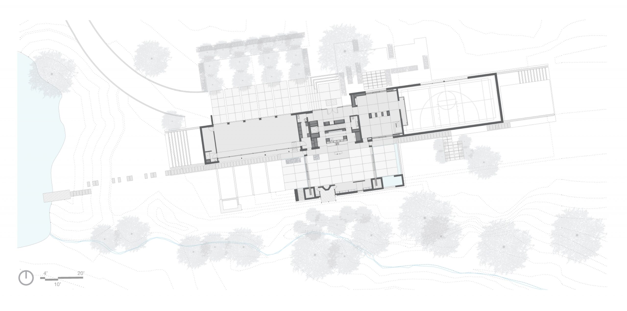 A long, sawn stone service bar rests on a concrete base, housing bedrooms above a garage and sports court. A distinct glass pavilion sits alongside the service bar, containing a two story living area.