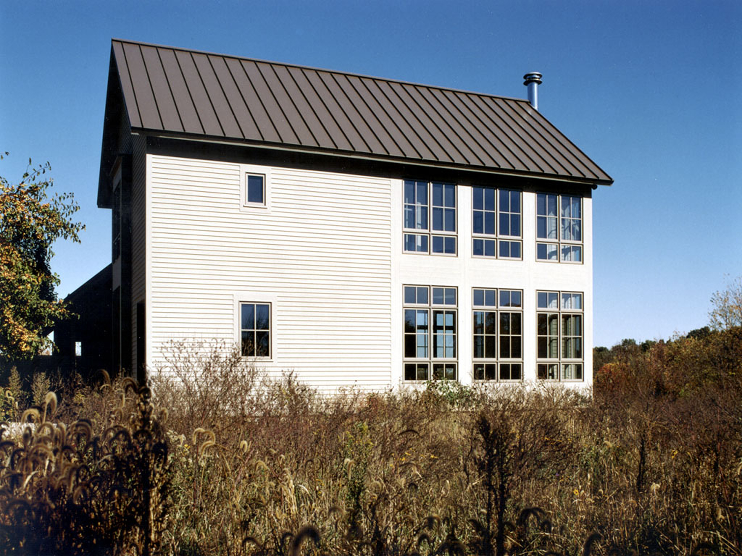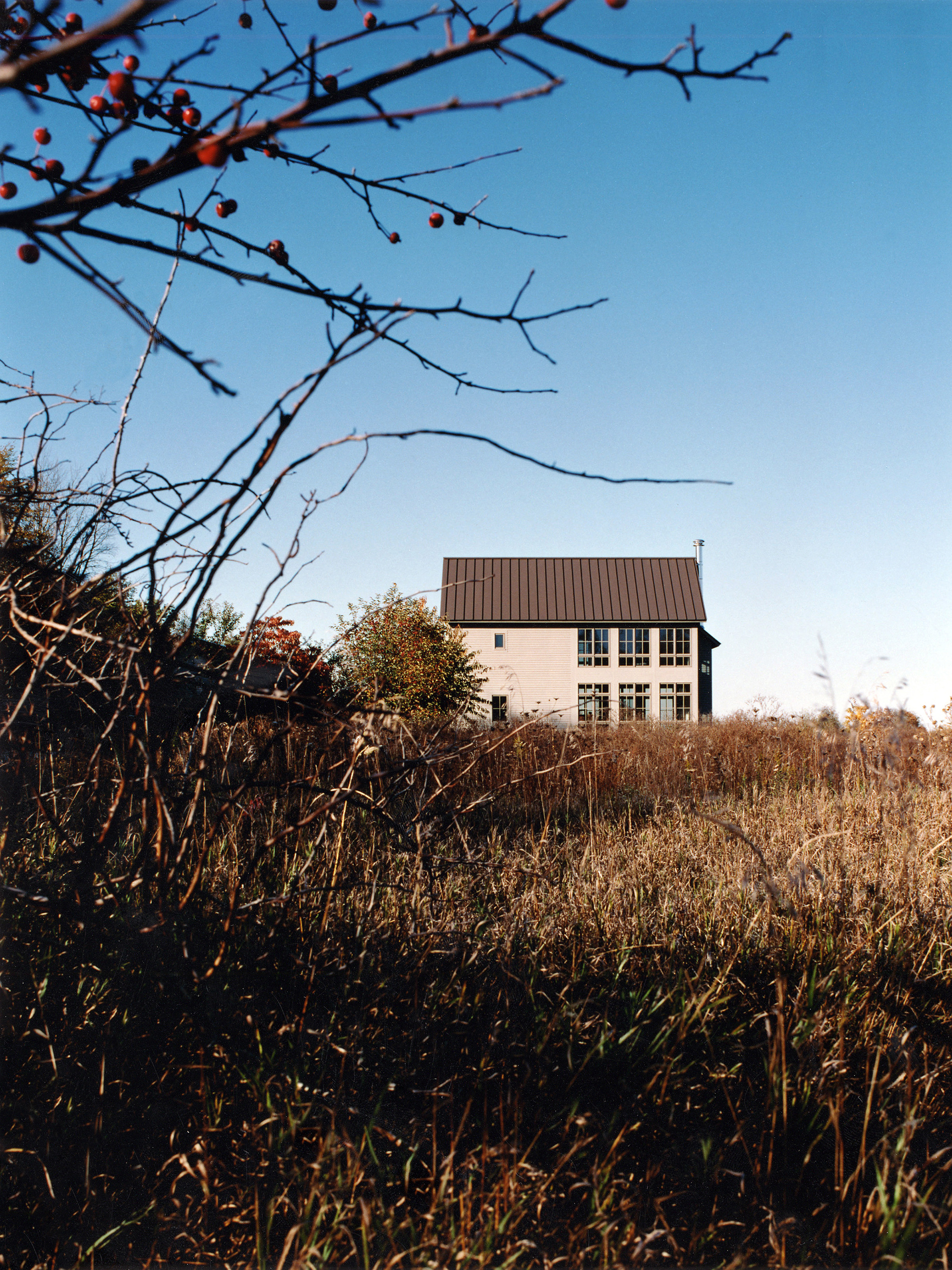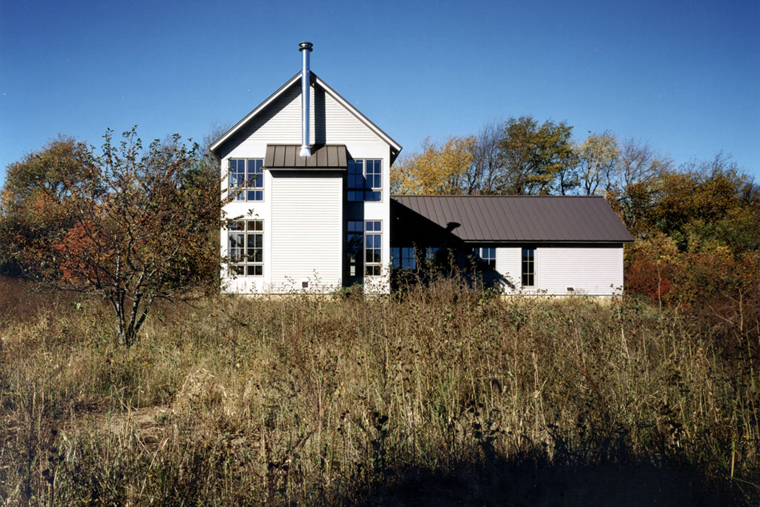 The main house accommodates an entry, library, living room, and two bedrooms on an upper floor. The living room, surrounded by windows, is situated to take part in a broad vista of the farm field.