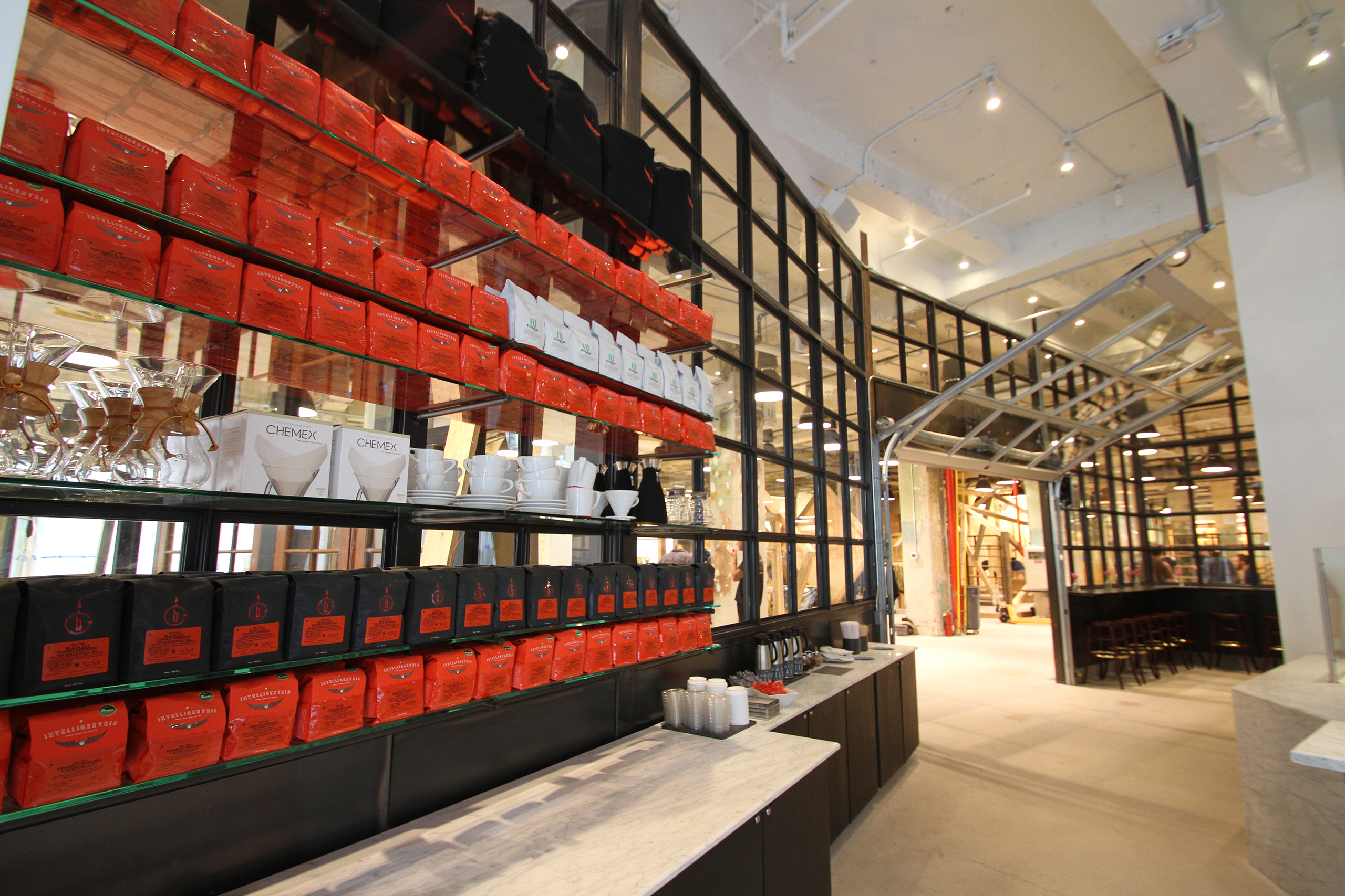 With its own street-facing entrance on Broadway, an interior garage door opens up to allow customers to flow freely between retail space and coffee shop.