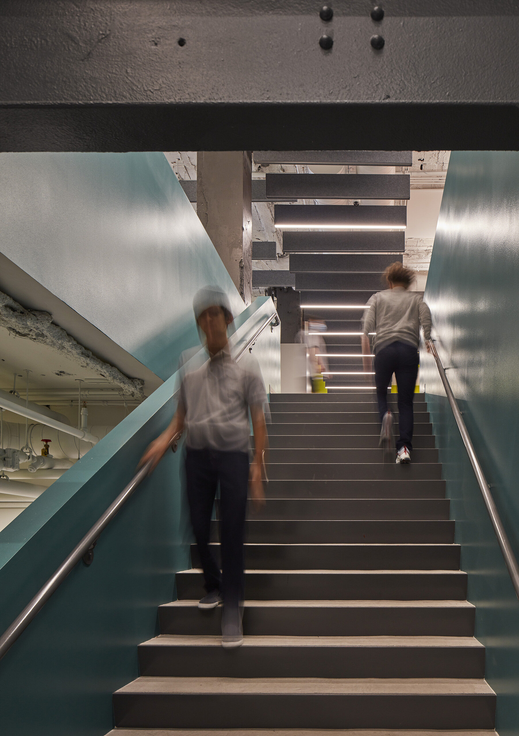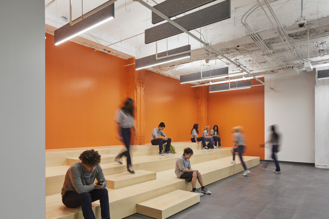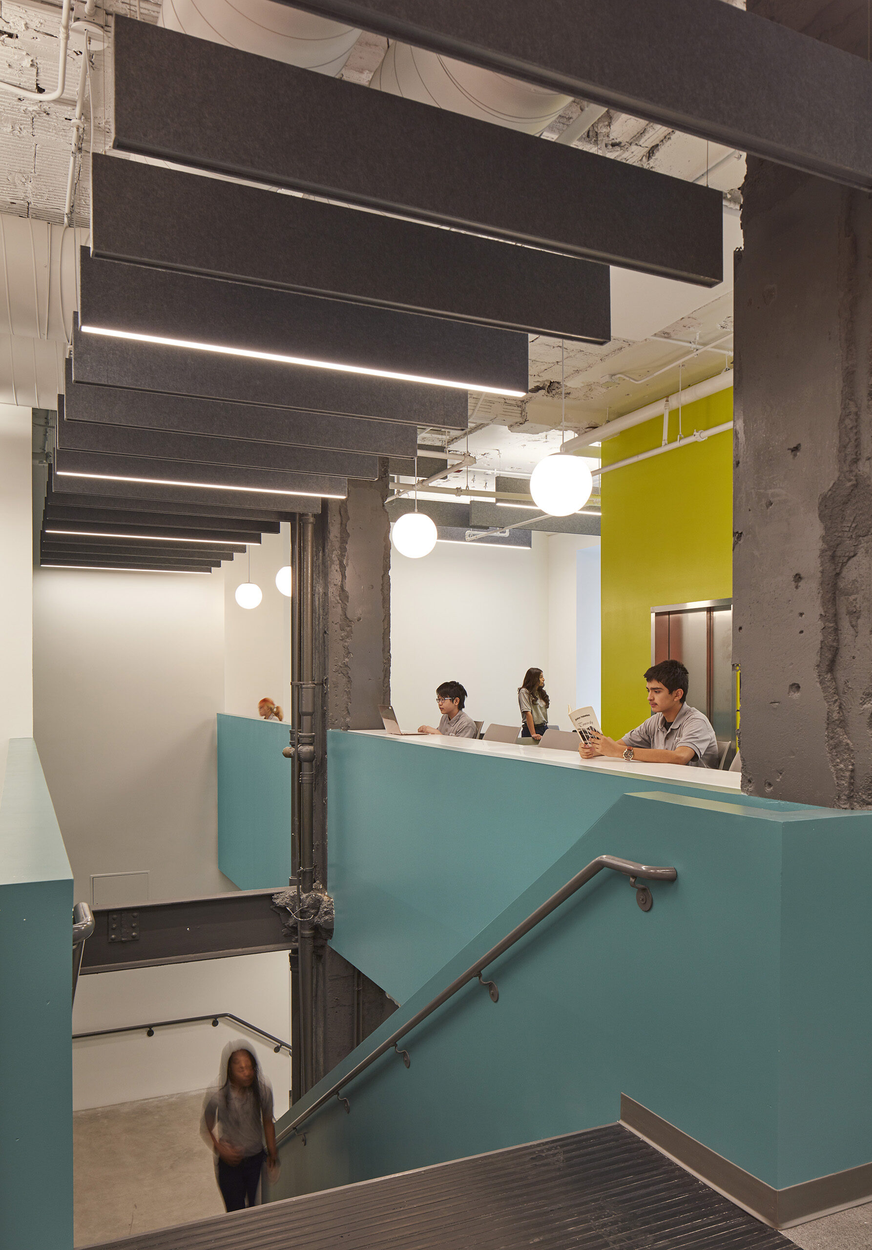 Students enter a secure, dedicated entrance at the street level, with both stairs and an elevator leading to the school’s main lobby on the second-floor. Here, students check-in, gather before class, and navigate to their different classes using a new centralized staircase.