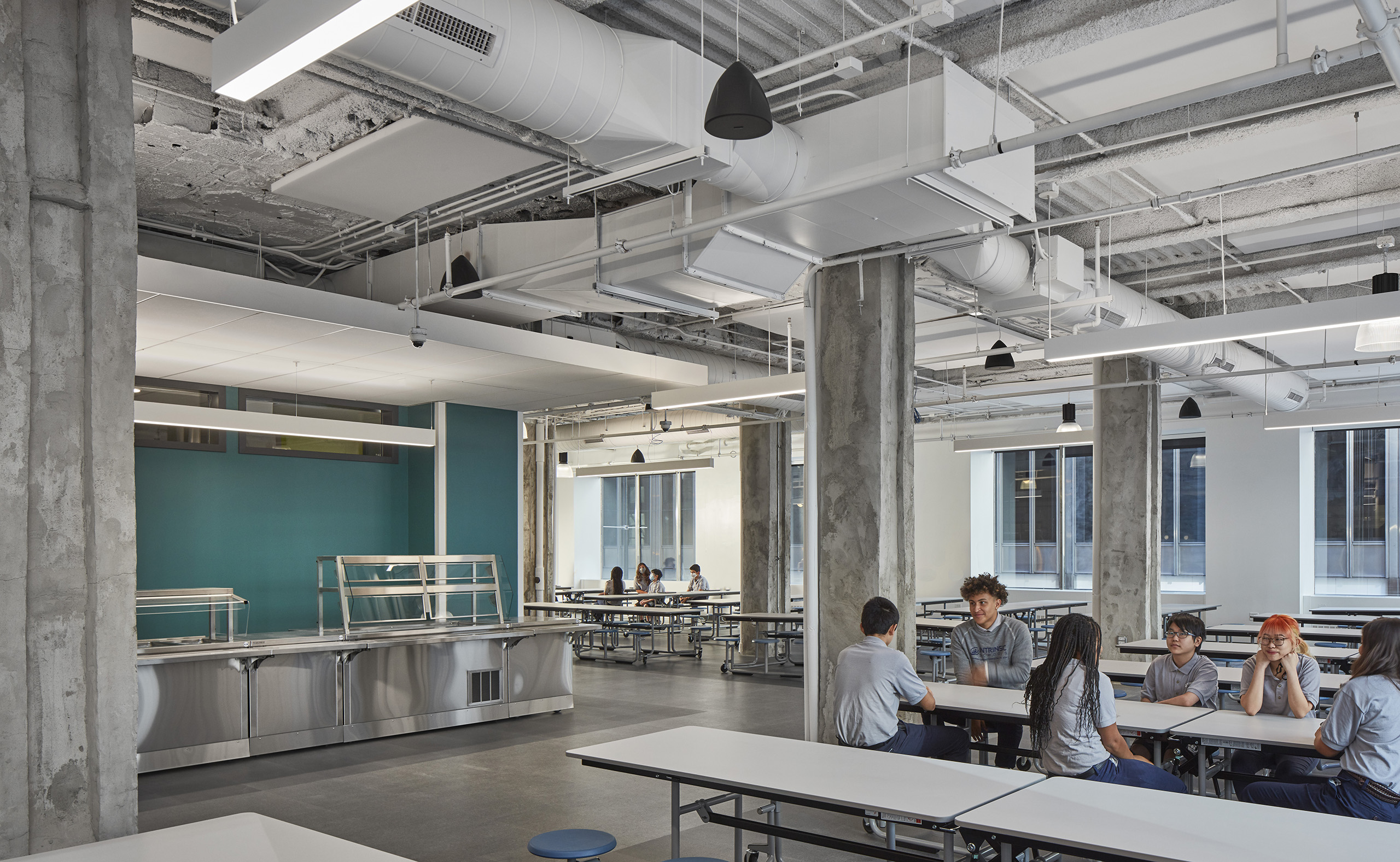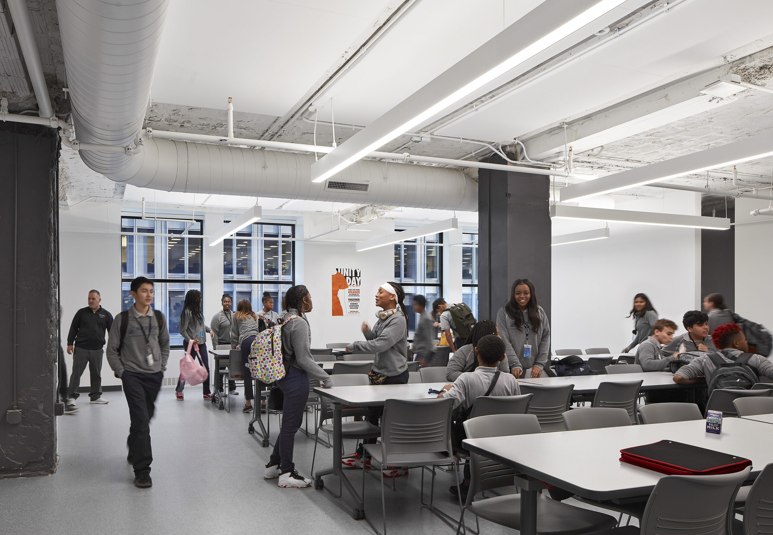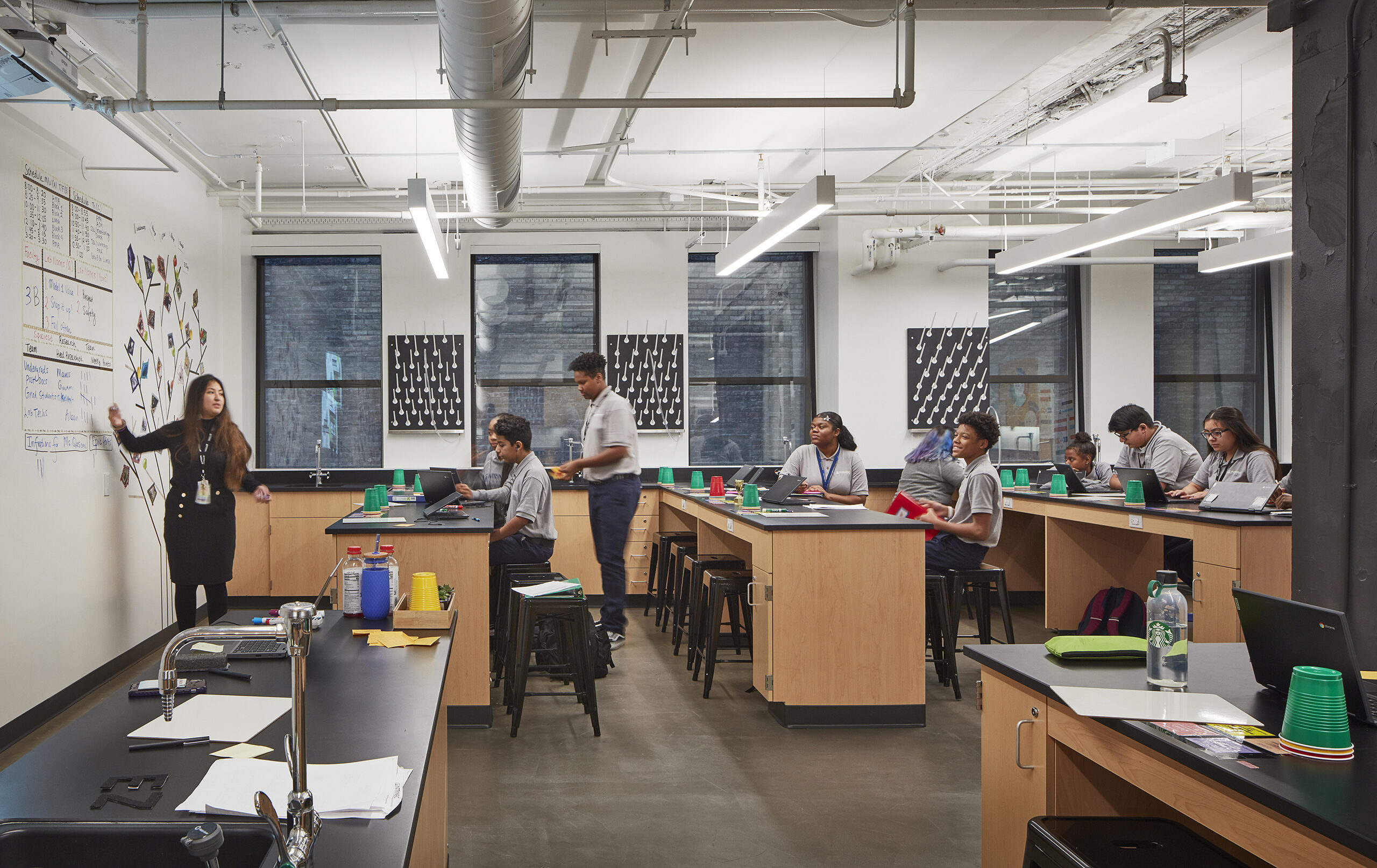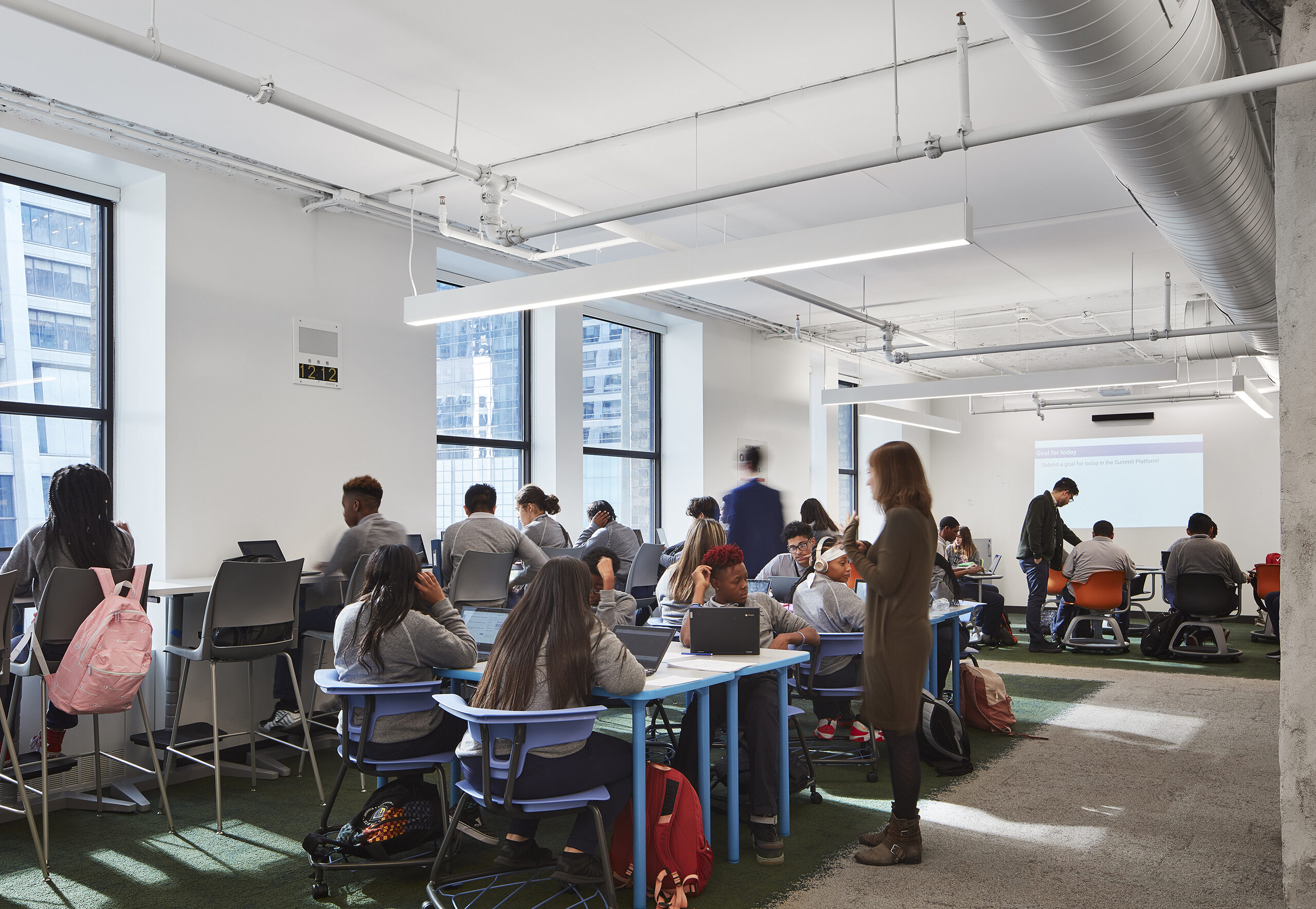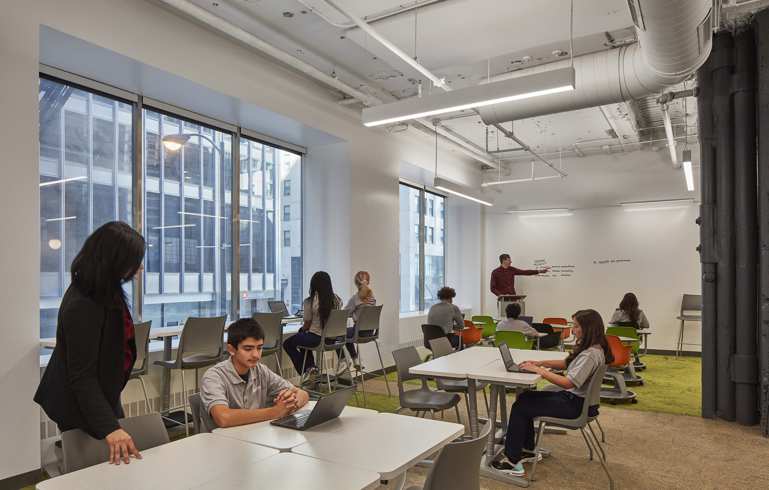Spanning five floors of the 1906 Rector (Bell Federal) Building in downtown Chicago, the high school leverages its central location to serve an intentionally diverse student body. In its first year, students came from over 40 neighborhoods, enabled by the robust transit options nearby.