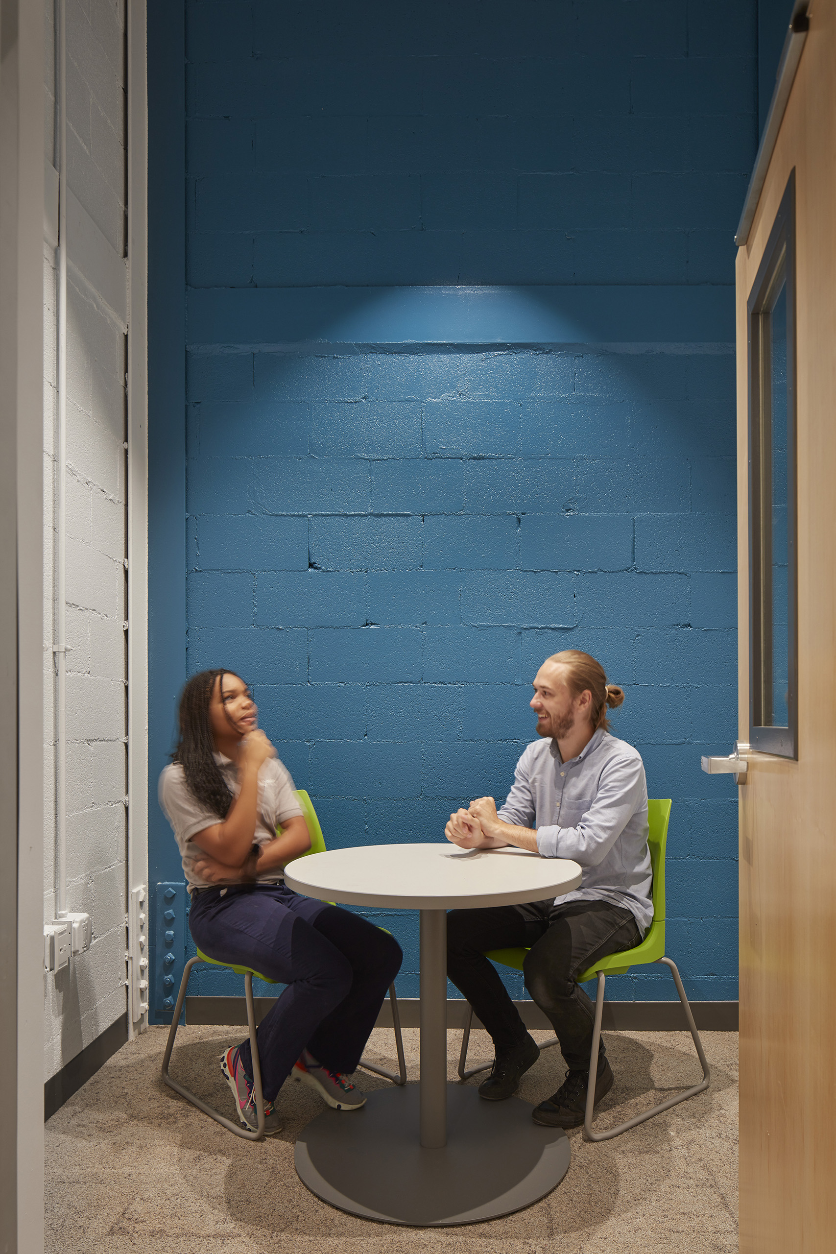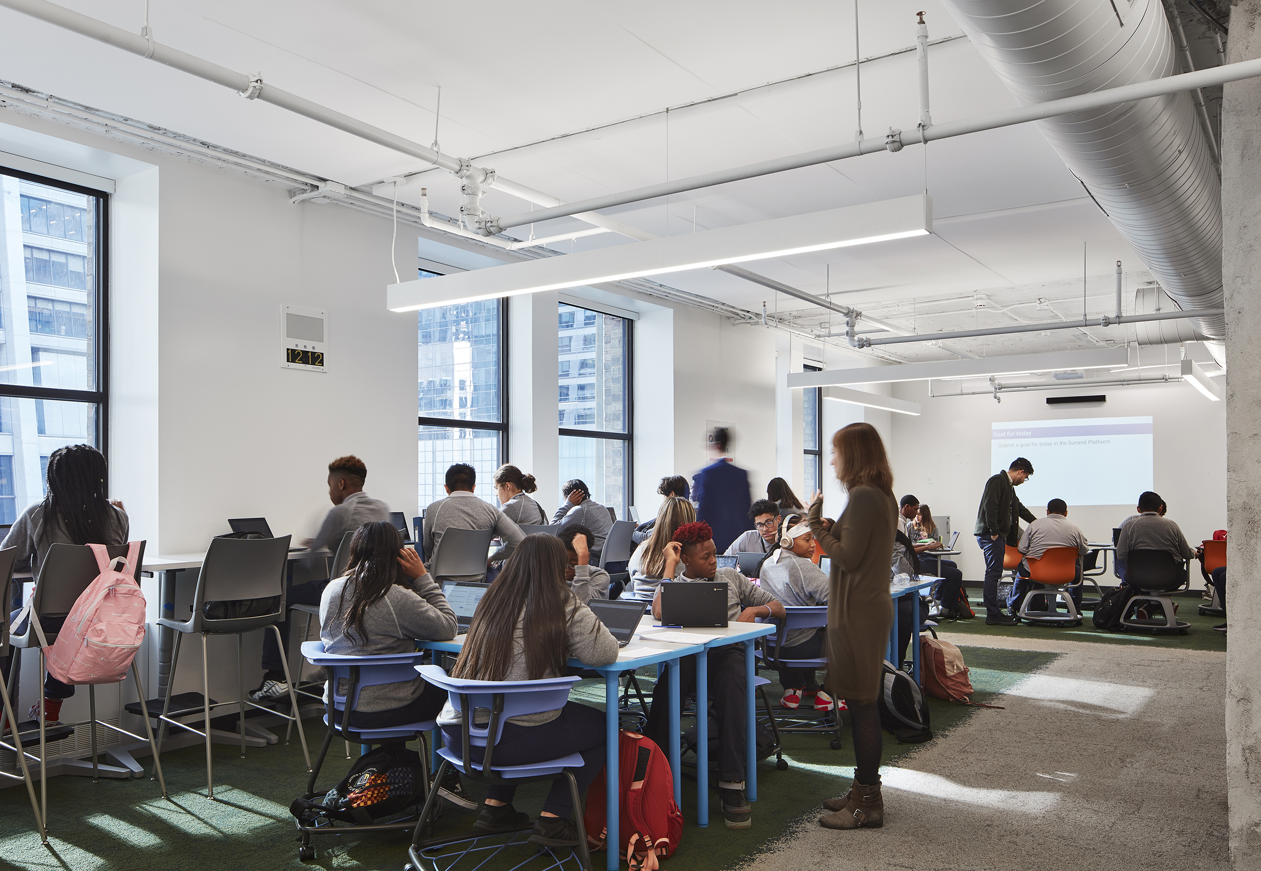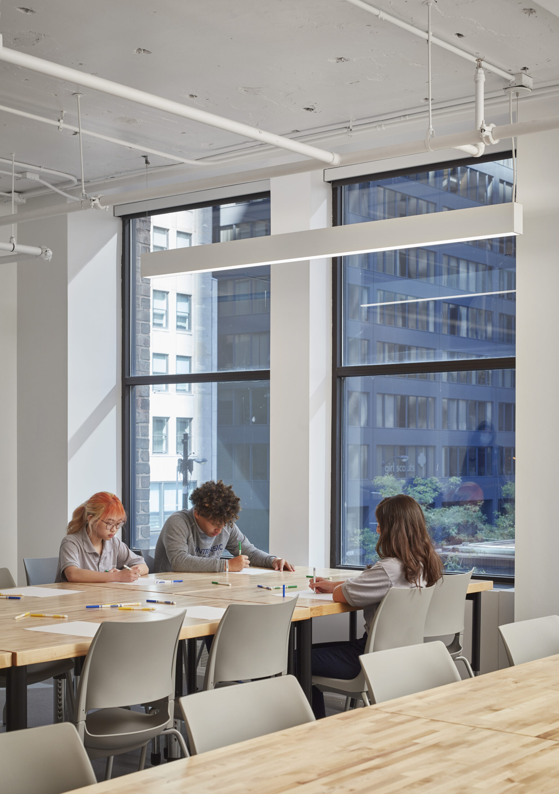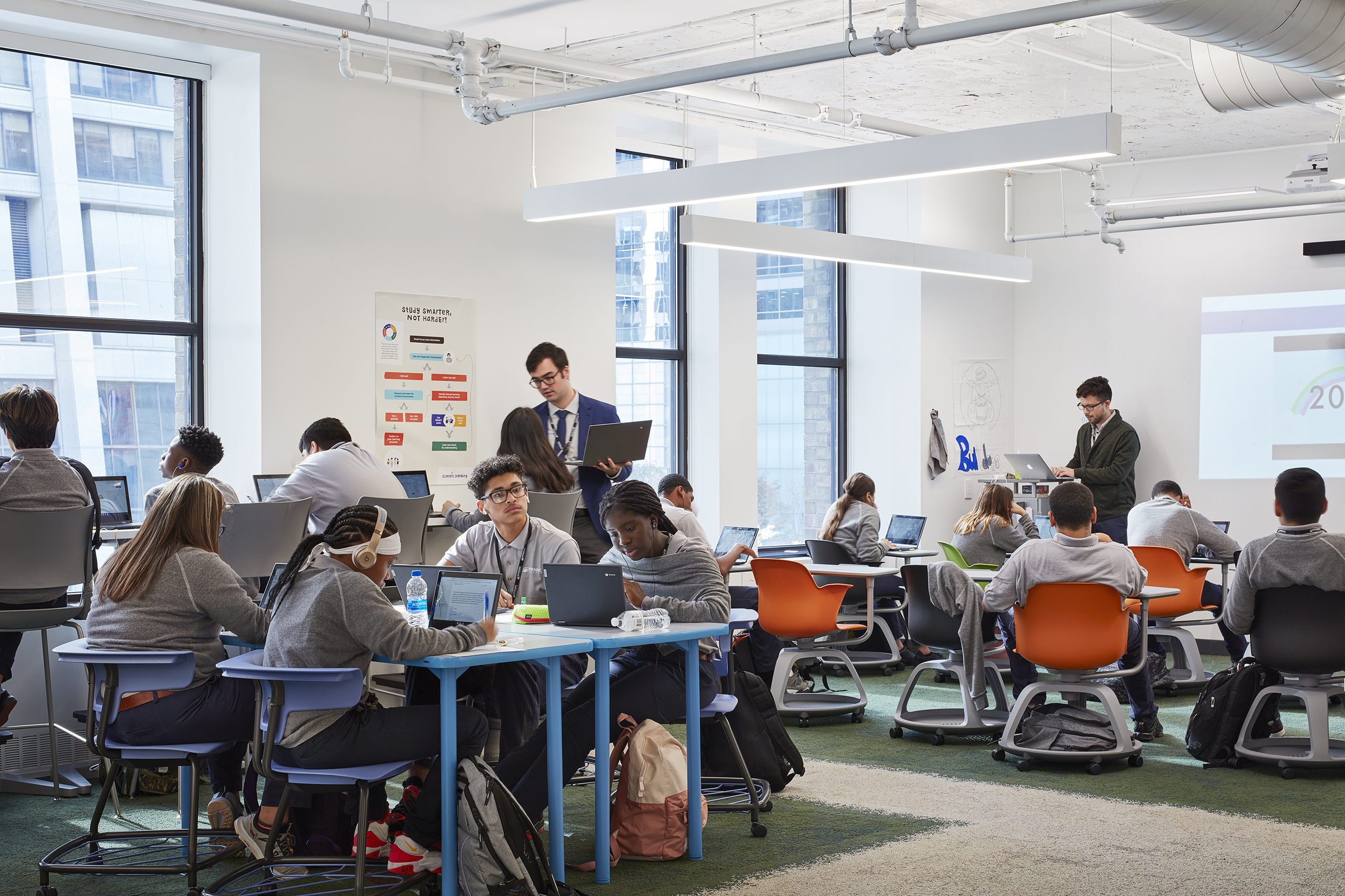 Building upon the successes of Intrinsic’s flagship Blended Learning campus on Chicago’s Northwest side, the Downtown Campus design reinforces the school’s unique 21st-century learning styles and adapts them to fit a completely different context in a downtown high-rise structure.