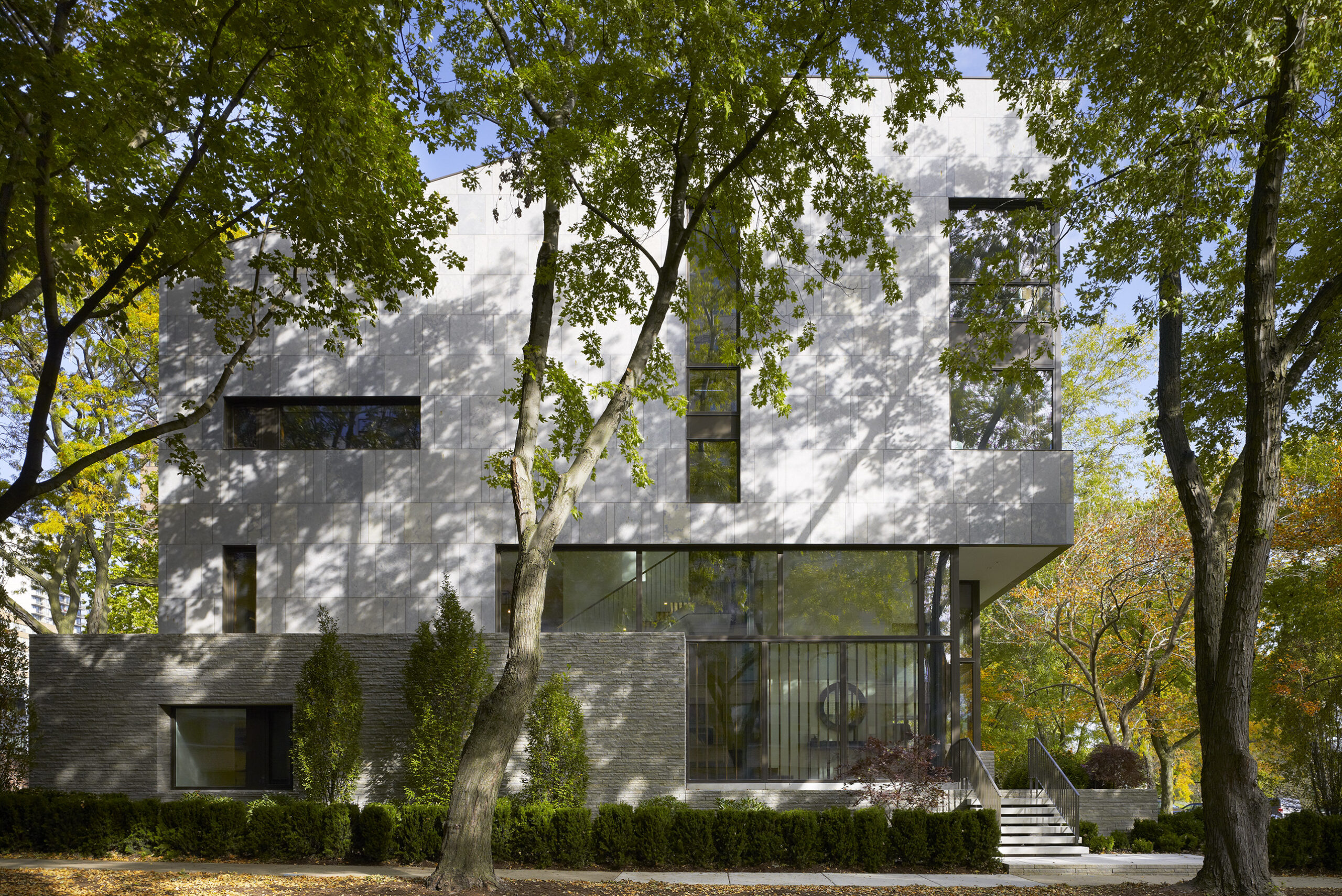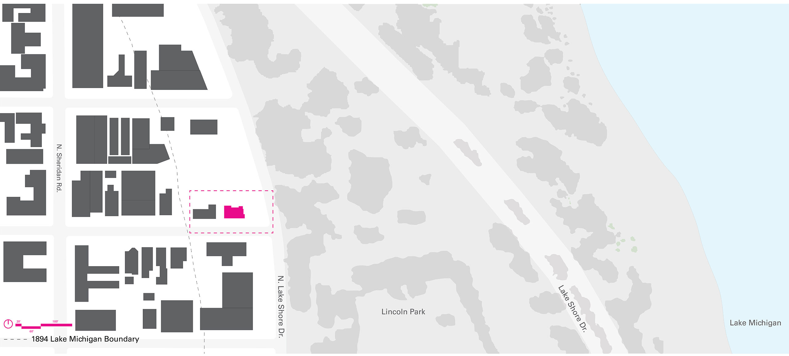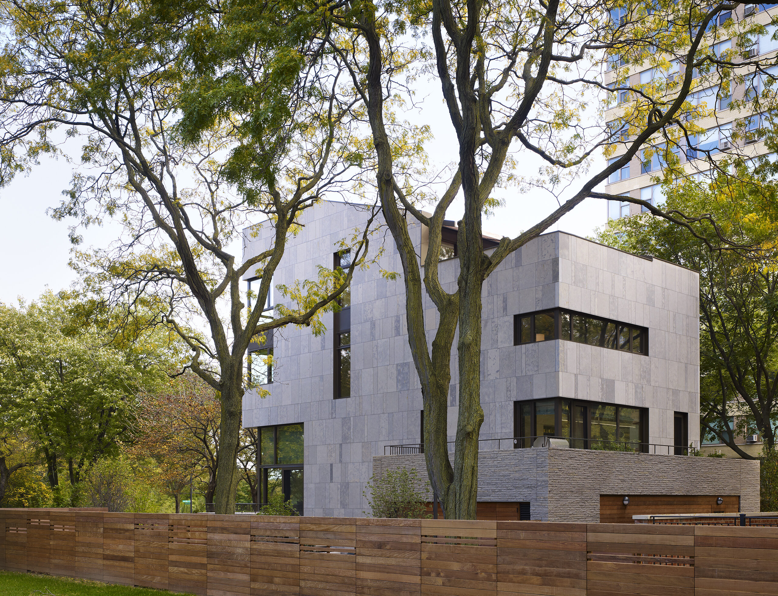 Overlooking a park with Lake Michigan to the east, Lake Shore Drive Residence sits on a prominent corner site, bounded to the south and west by residential buildings, and to the north by a wooded lot with mature trees.