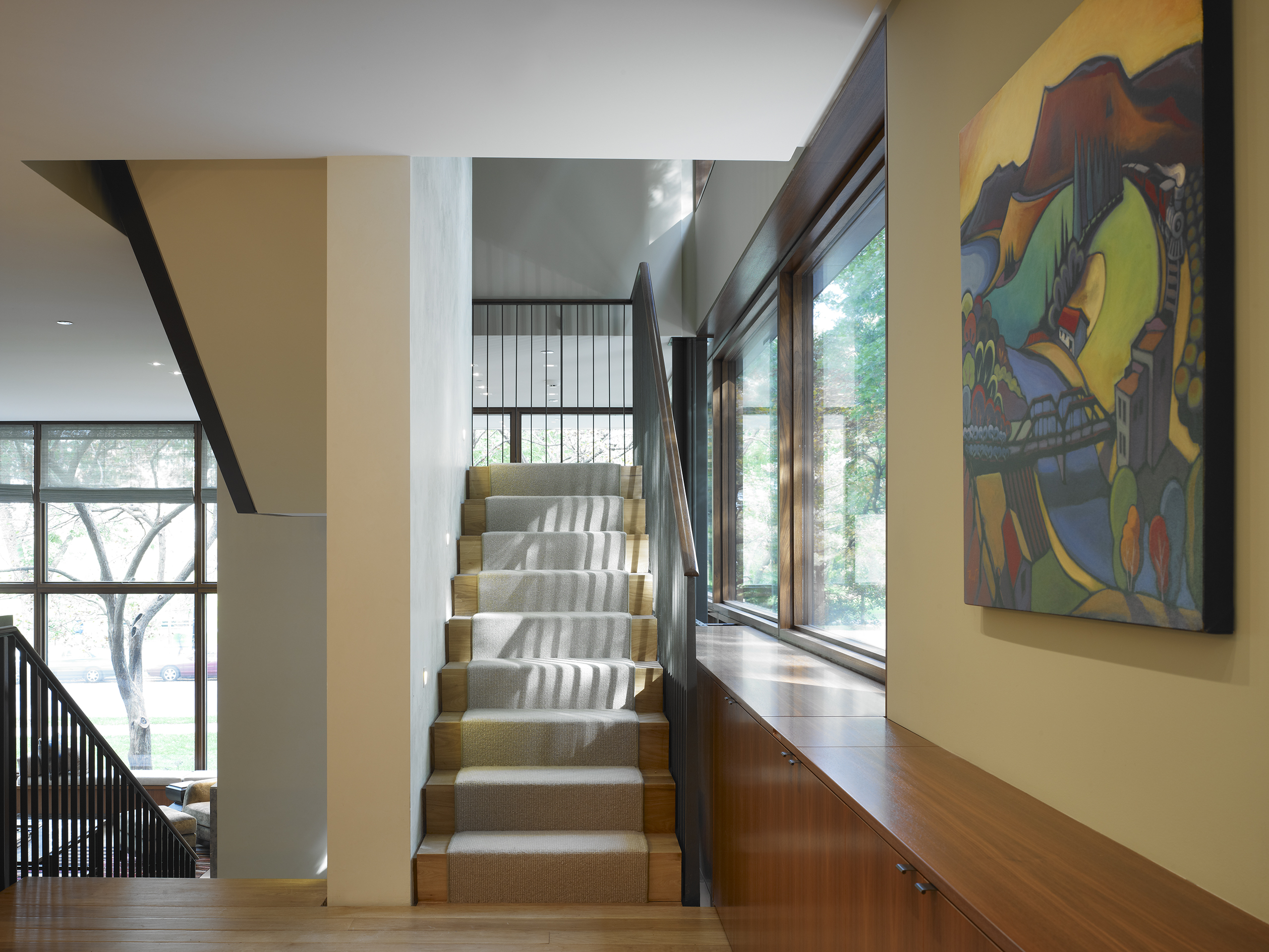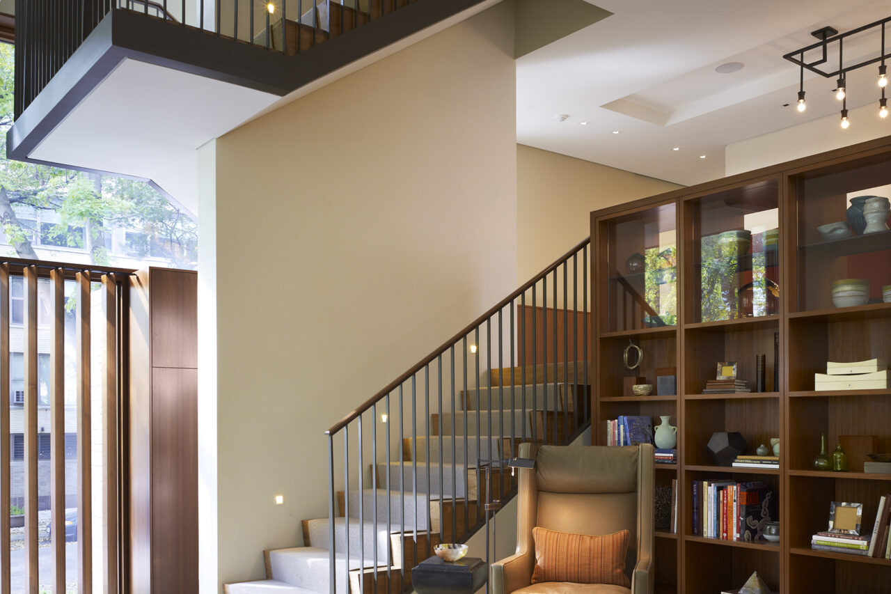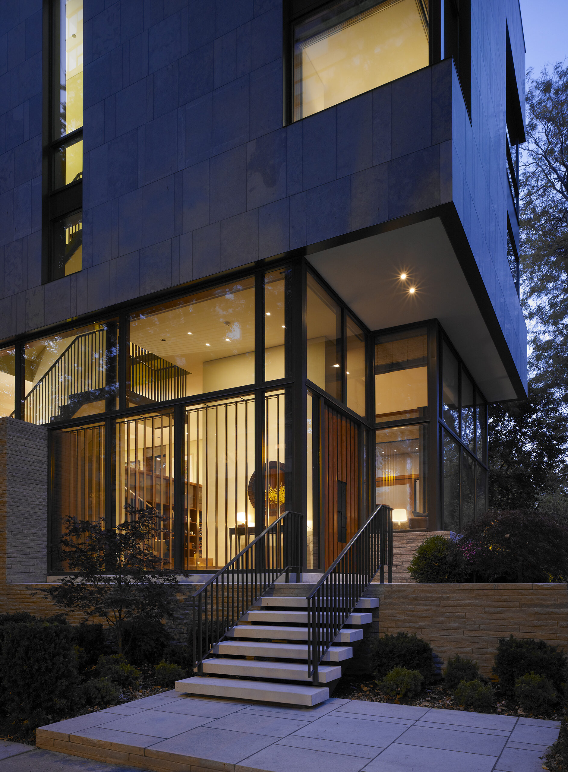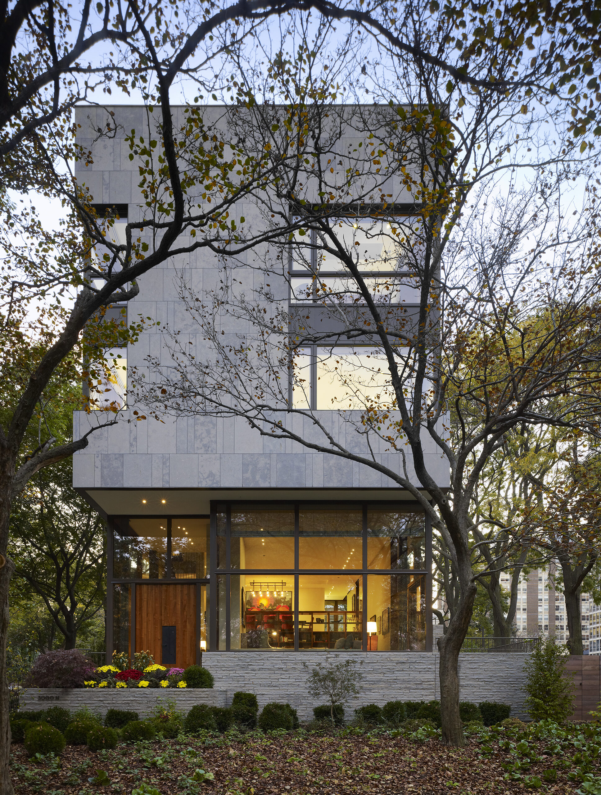 The formal composition of the house is derived from owner’s desire for expansive park/lake views, privacy from neighboring high-rise and integration of sustainable goals. Two solid masses make up the building’s form; a plinth anchors the house to its site, and a sculptural volume rises from the plinth towards the park and lake beyond.