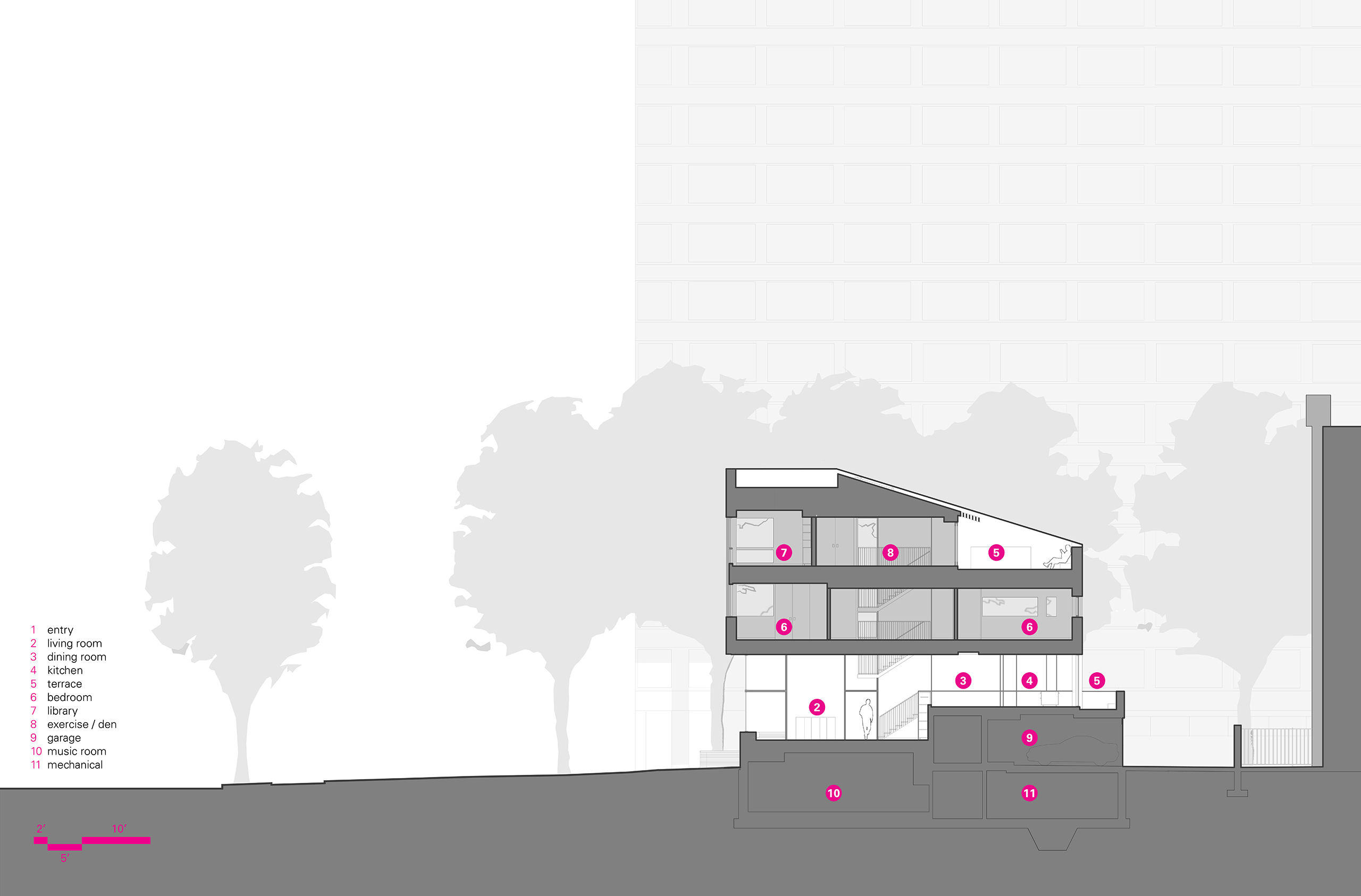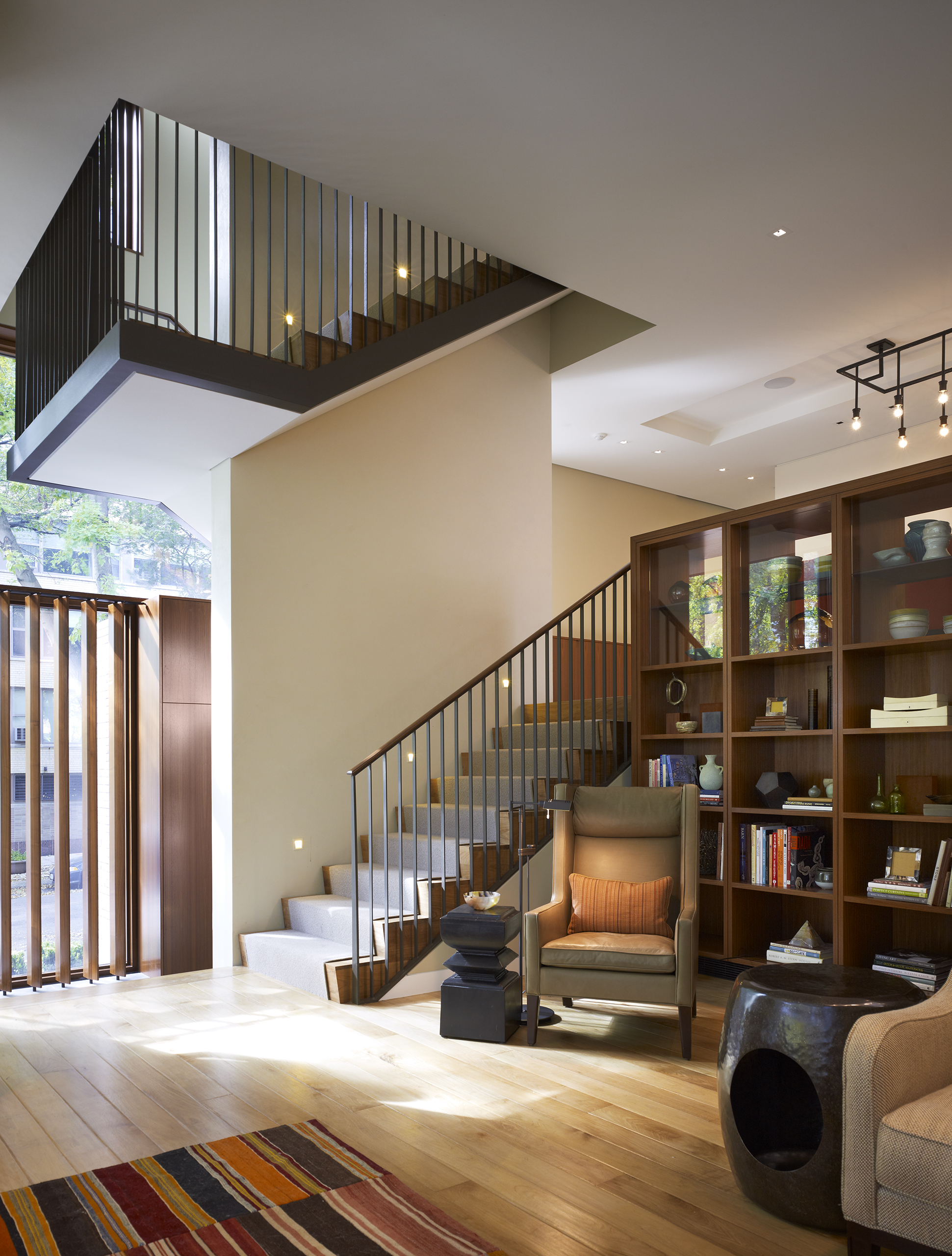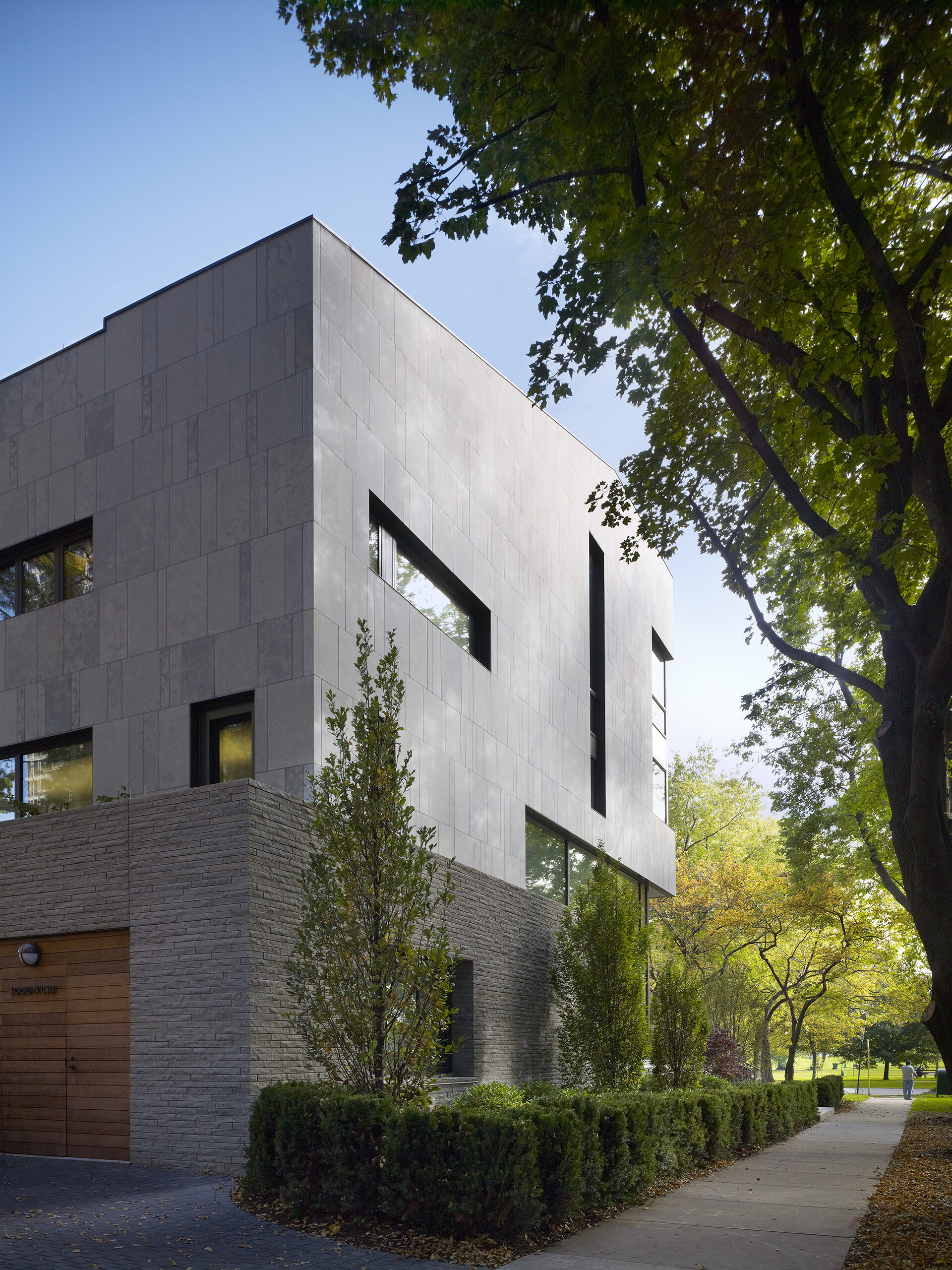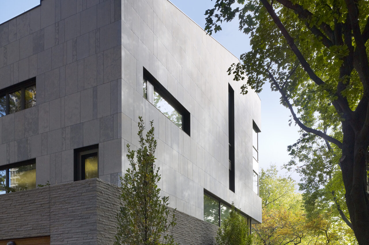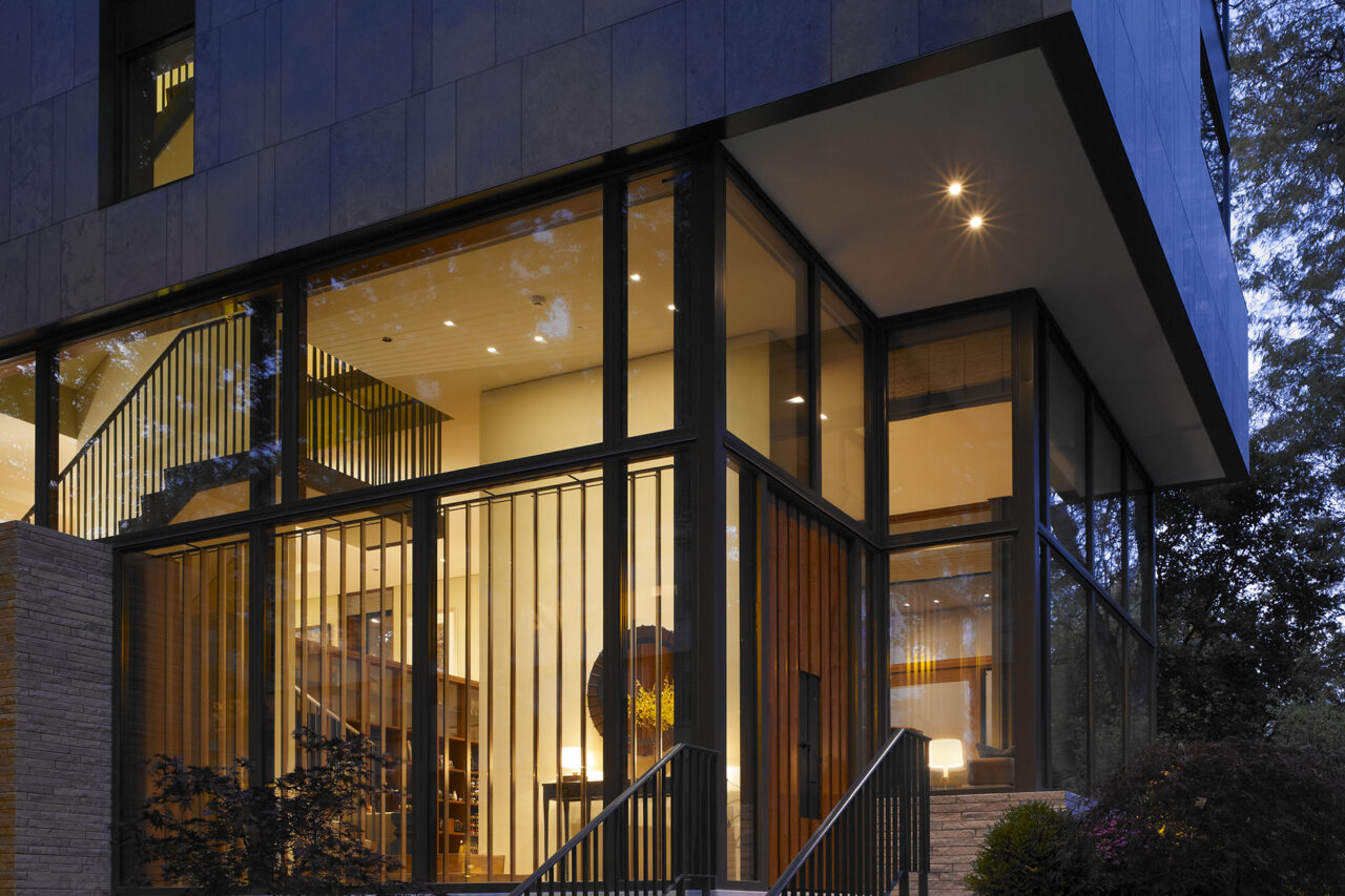 The formal composition of the house is derived from owner’s desire for expansive park/lake views, privacy from neighboring high-rise and integration of sustainable goals. Two solid masses make up the building’s form; a plinth anchors the house to its site, and a sculptural volume rises from the plinth towards the park and lake beyond.