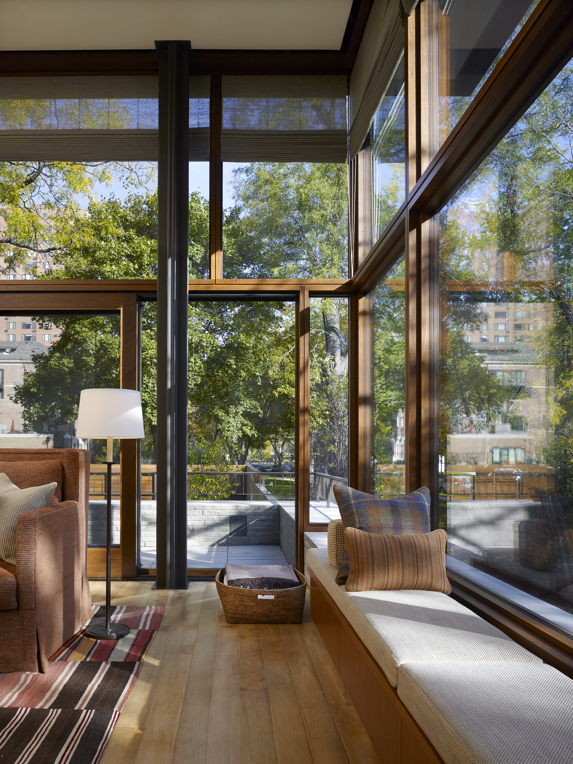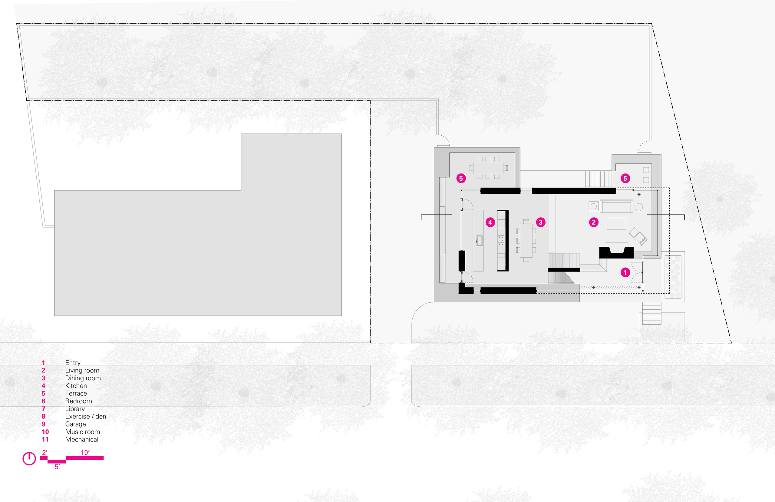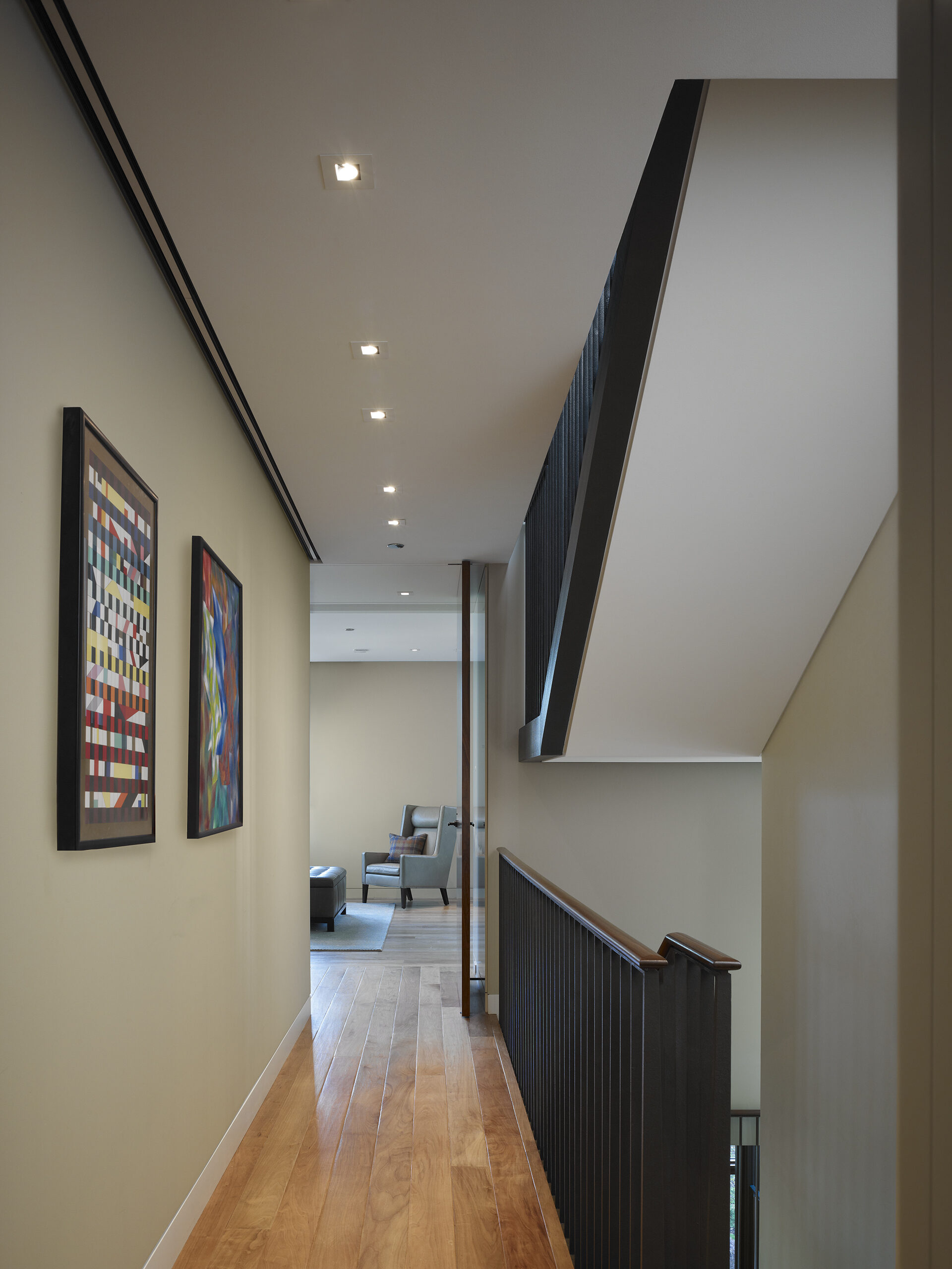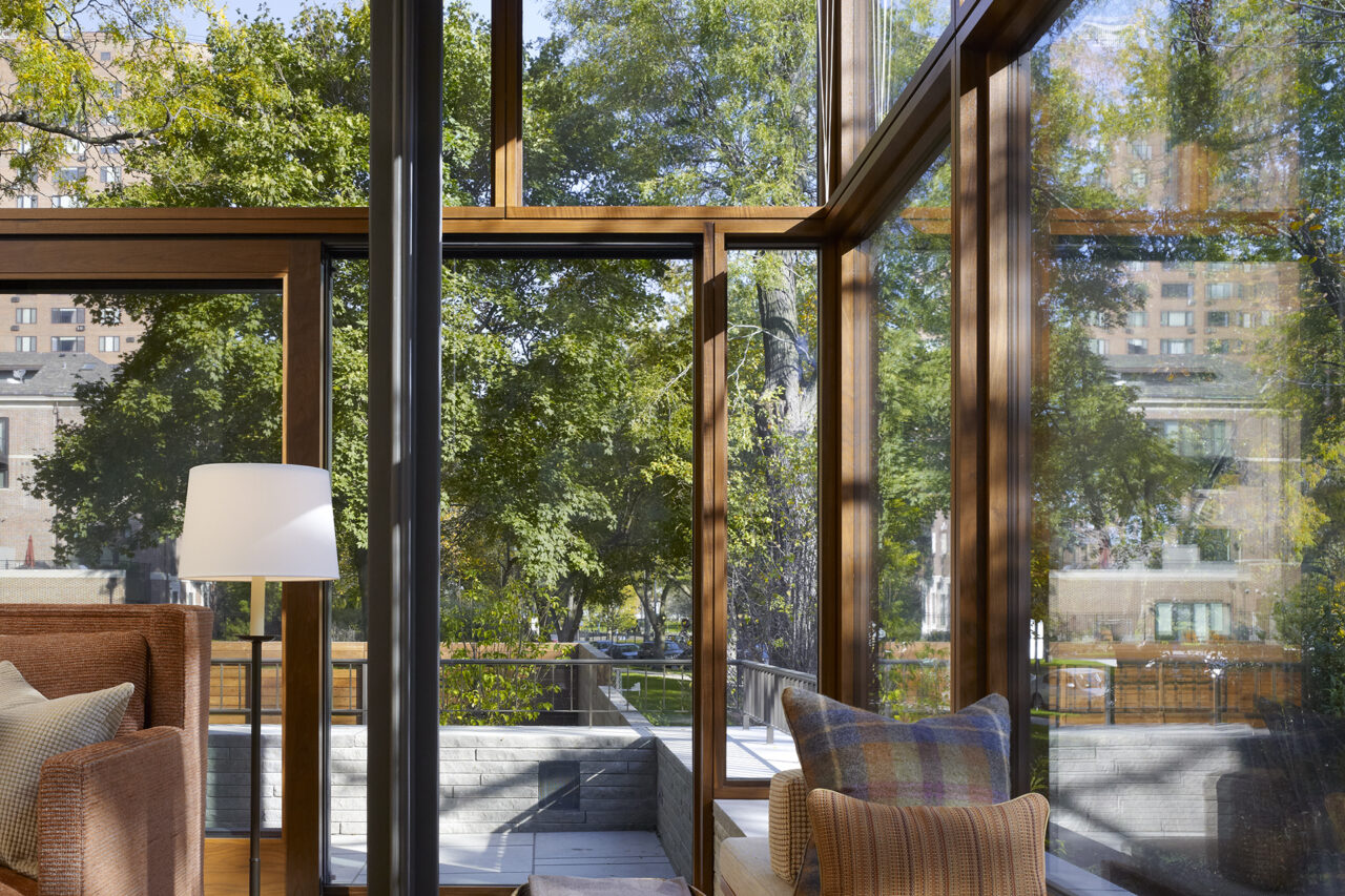 The formal composition of the house is derived from owner’s desire for expansive park/lake views, privacy from neighboring high-rise and integration of sustainable goals. Two solid masses make up the building’s form; a plinth anchors the house to its site, and a sculptural volume rises from the plinth towards the park and lake beyond.