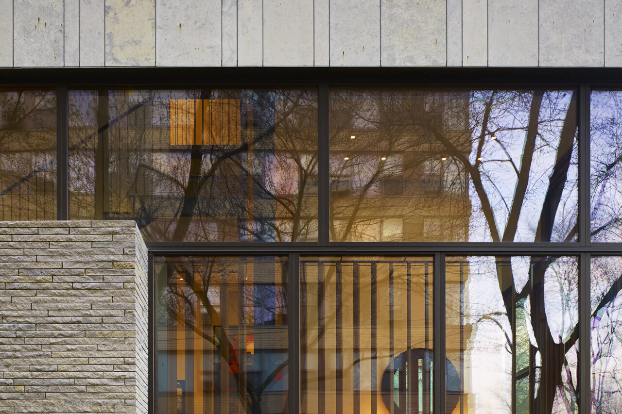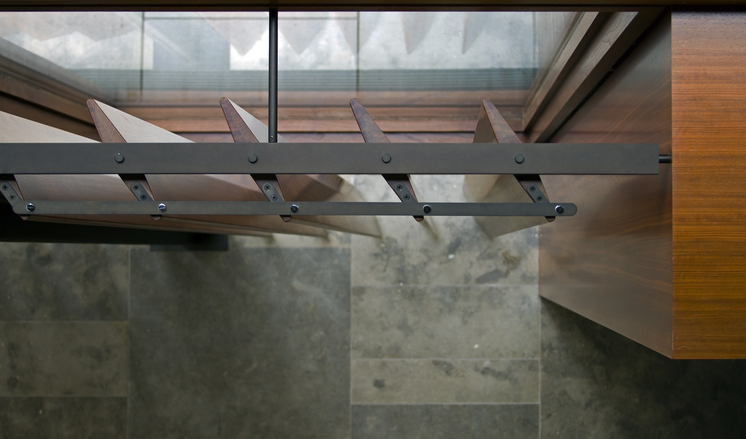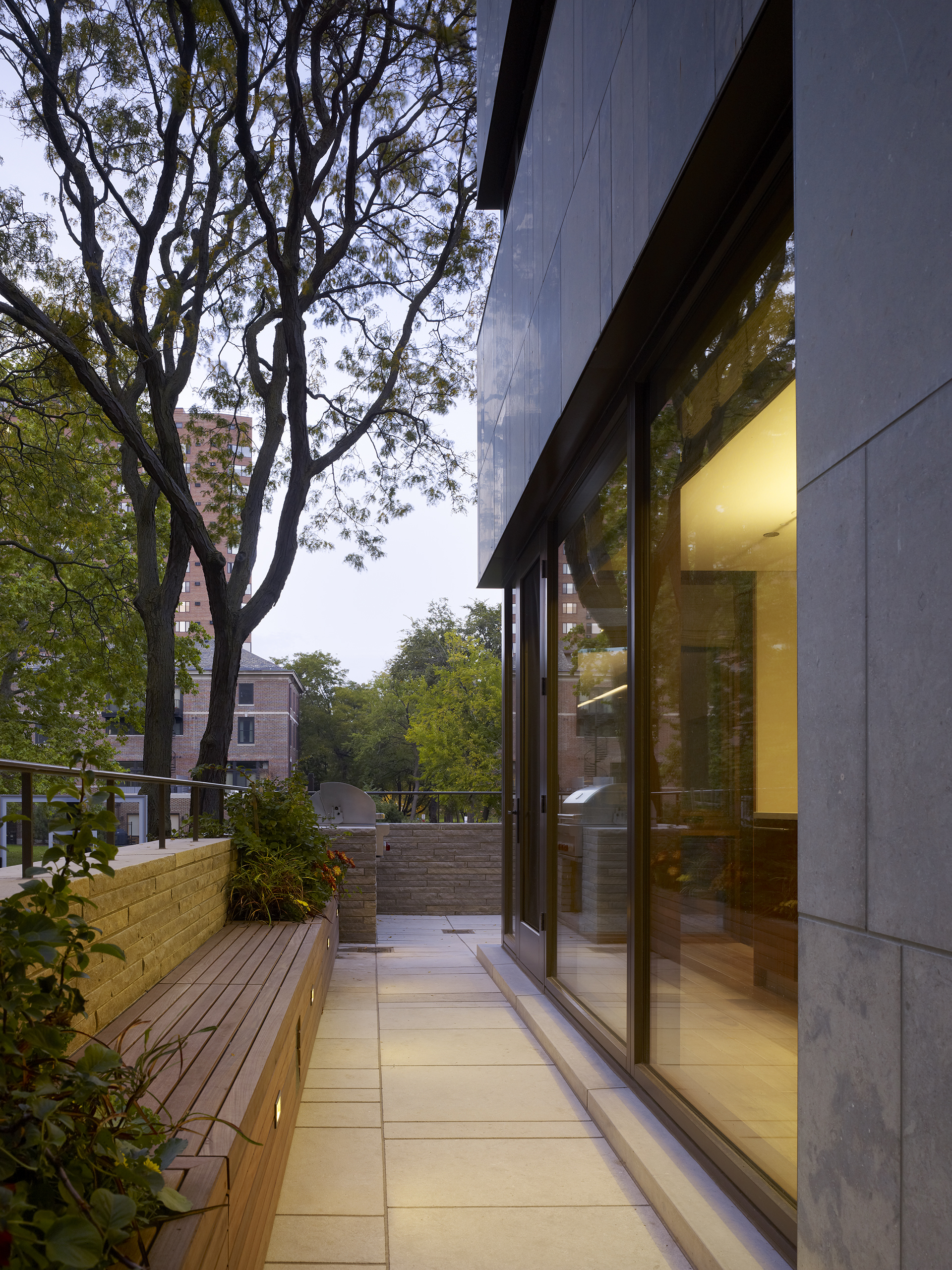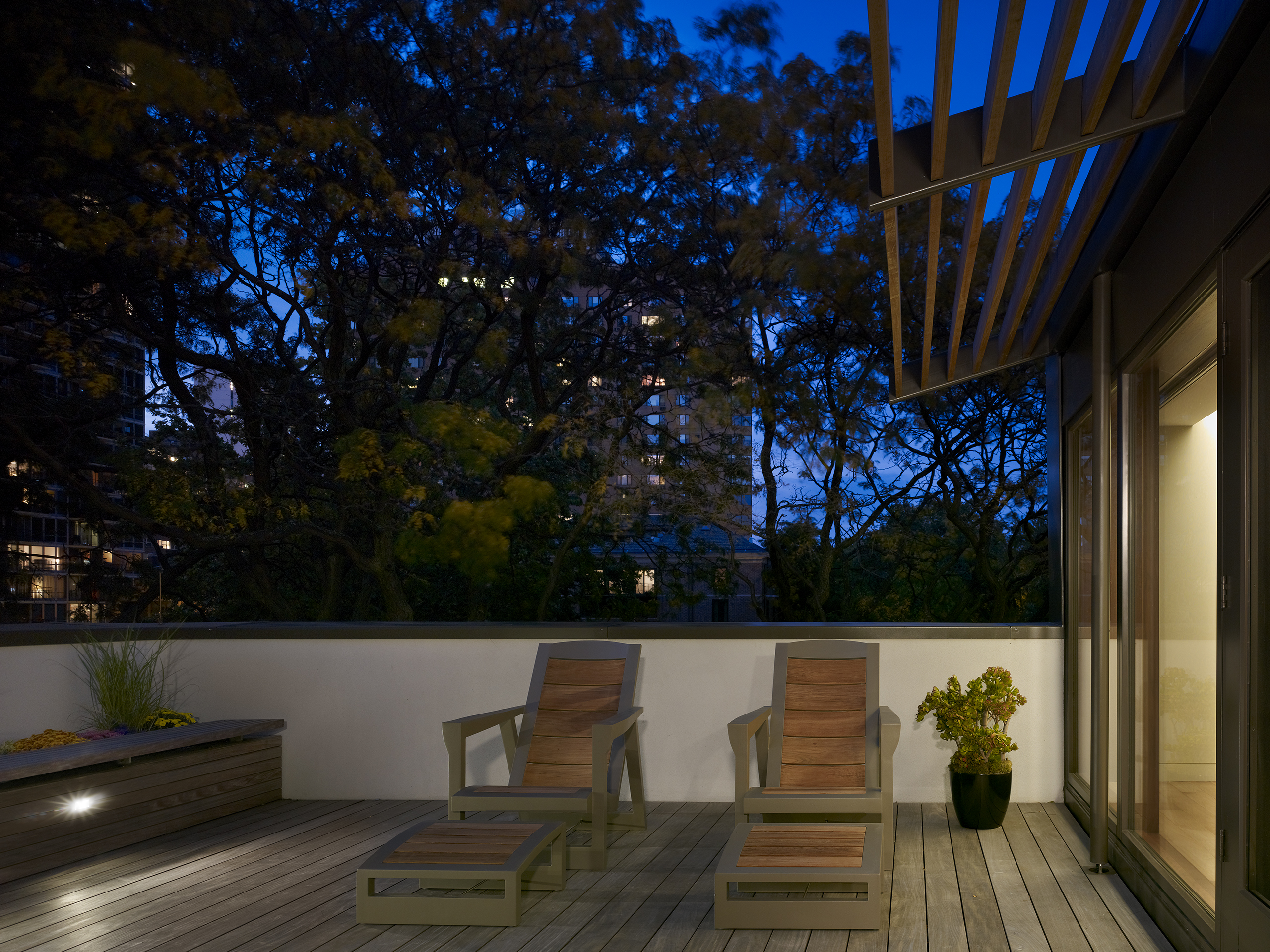 The resulting sloped roof is an optimum angle for the solar thermal panels, while a parapet wall continues to form a built-in screen shielding the exterior terrace from the neighboring high-rise building. The parapet continues to the building’s north façade, dropping to reveal the side-yard with a row of spectacular mature trees.