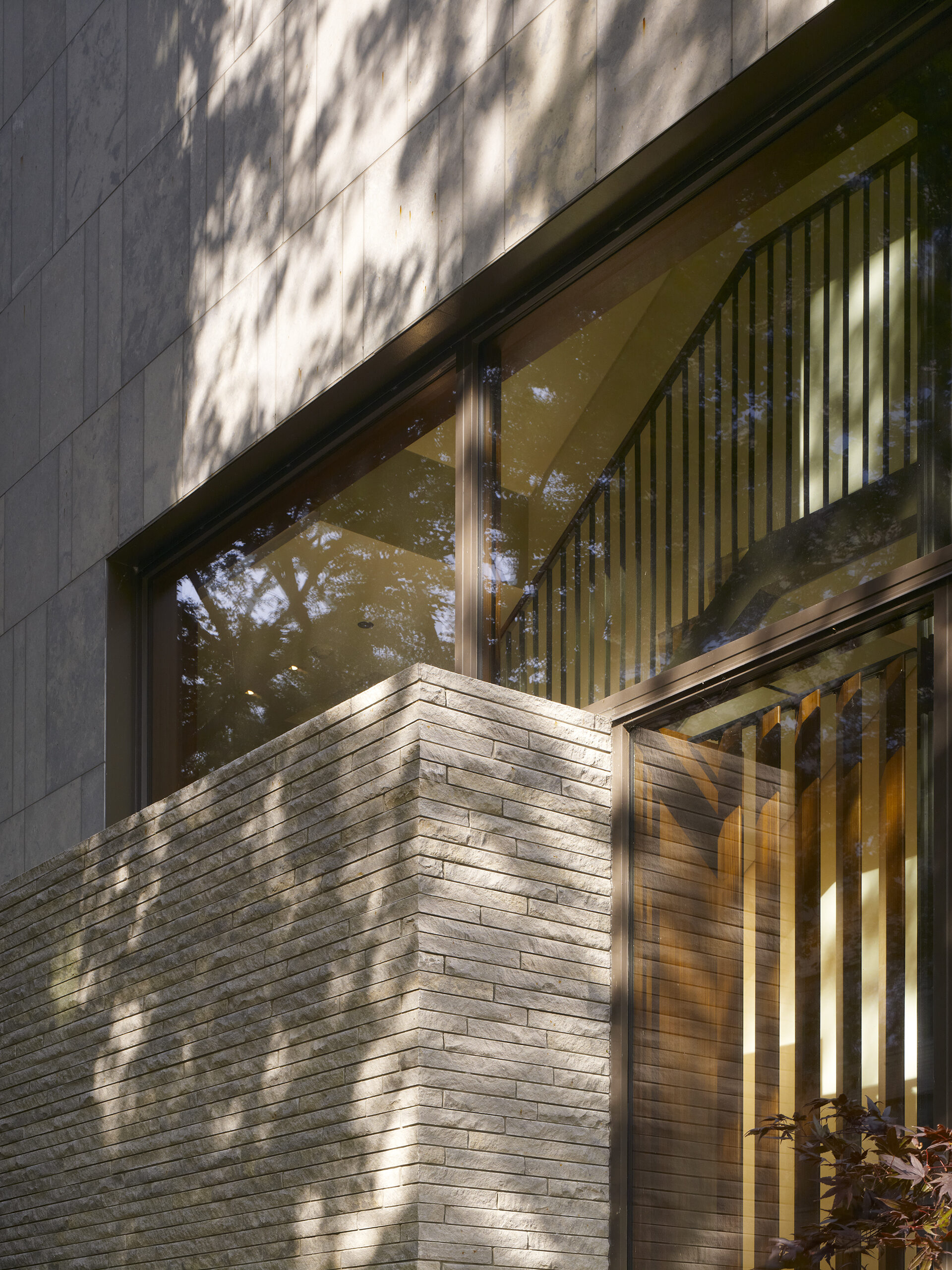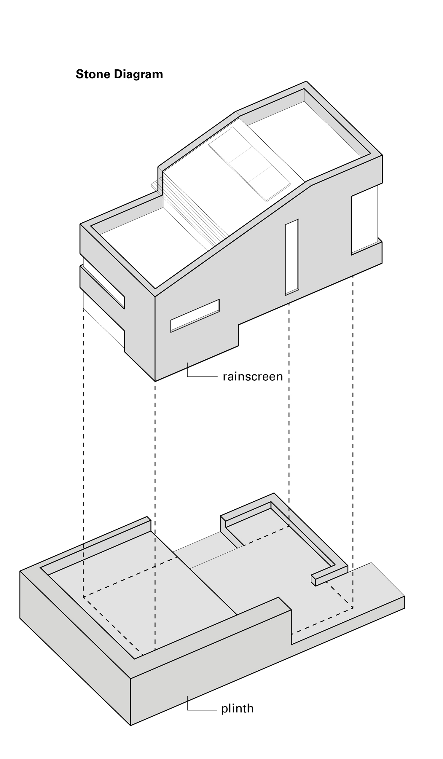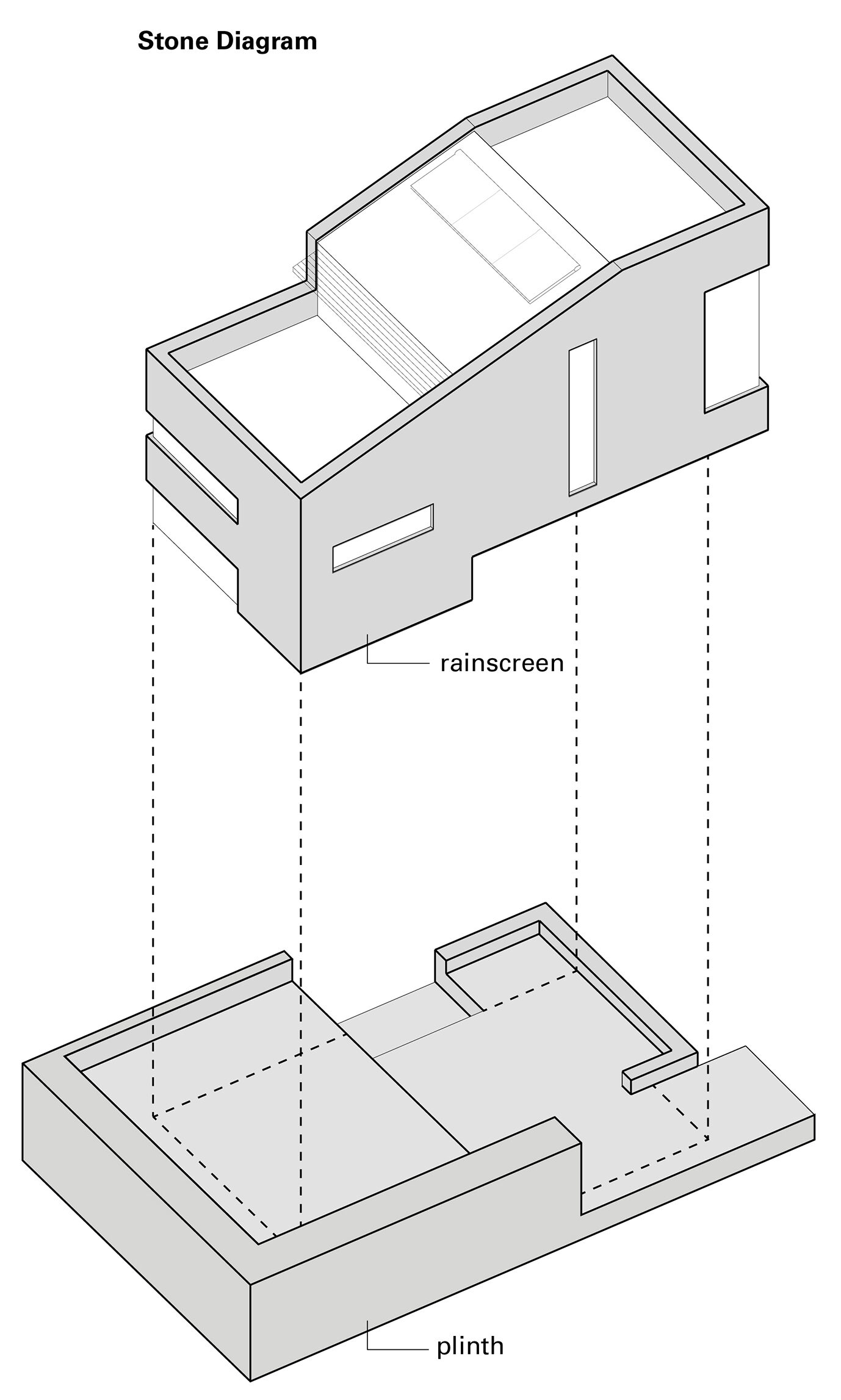 The exterior material palette reinforces the conceptual diagram. Volumes are expressed through the different use of one material, foreshadowing the projects attention to detail. The stepped plinth volume, laid up out of load bearing rock-faced Kansas limestone, emphasizes weight, mass and its earthen relationship. By contrast, the sculptural volume has a taut, honed exterior skin, employing the same limestone as rain-screen.