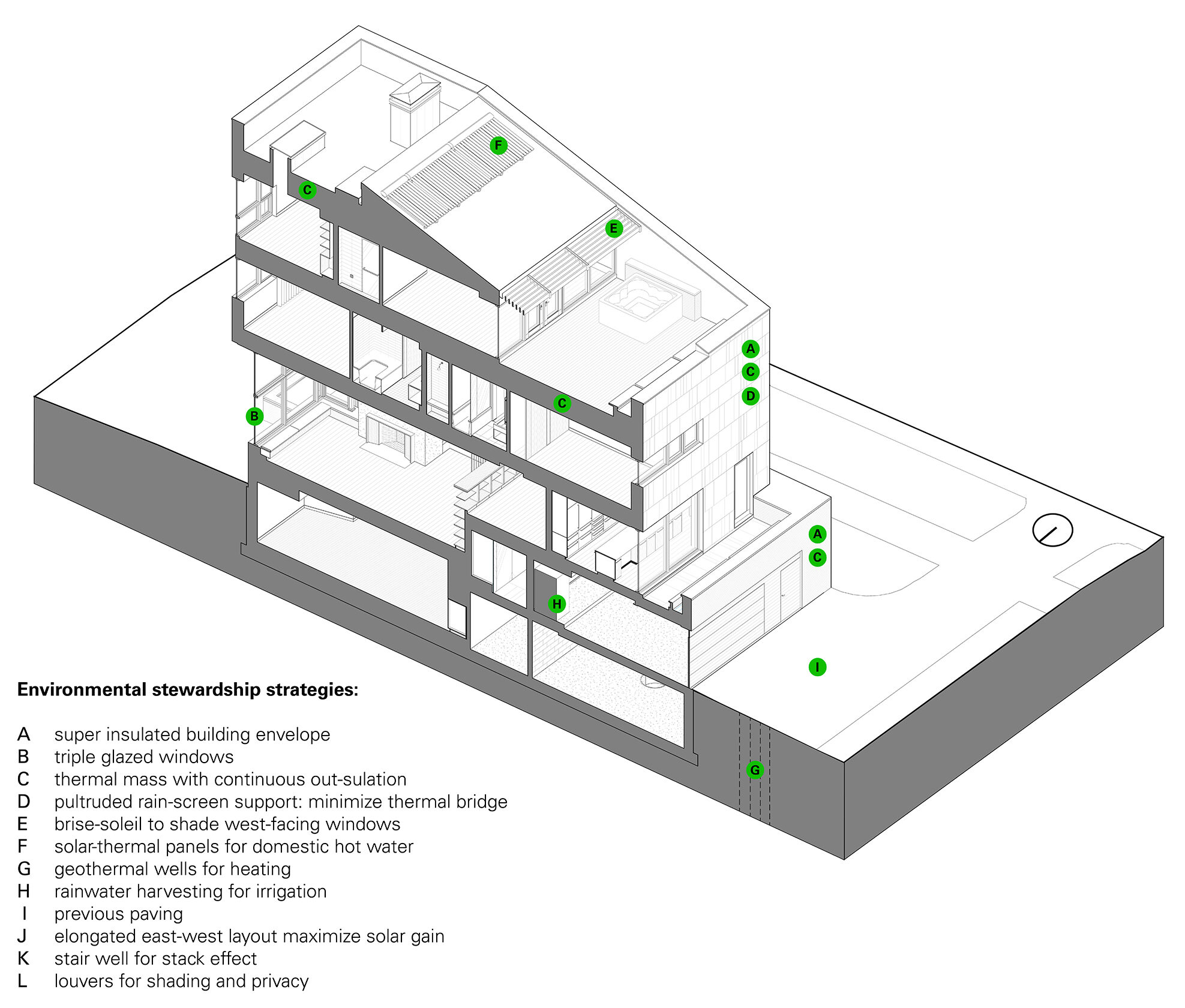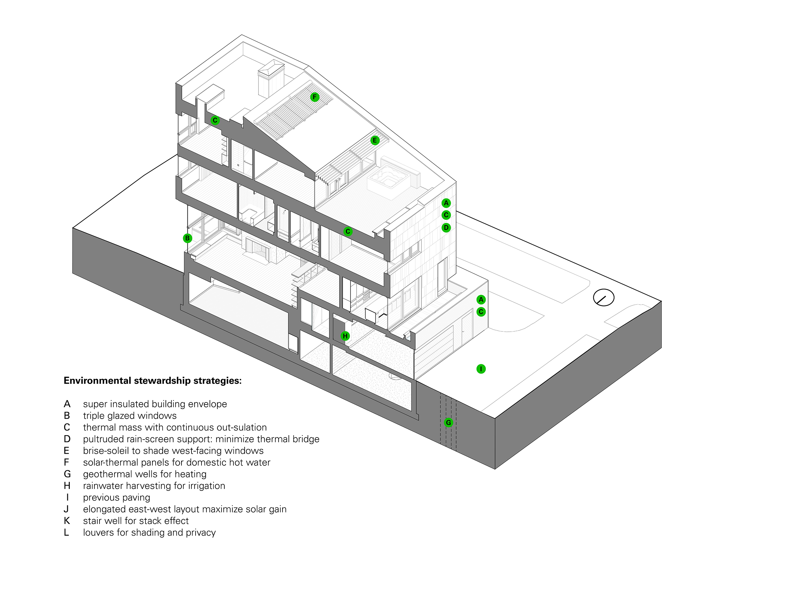 Sustainable measures were one of the highest priorities for the owner. The site footprint provides an elongated east-west layout maximizing passive solar gain. Other passive solar strategies include incorporating brise-soleil to shade west-facing windows from high angle summer sun/admission of low angle winter sun, the use of the stair well for stack effect, and thermal mass within the building envelope and floor.