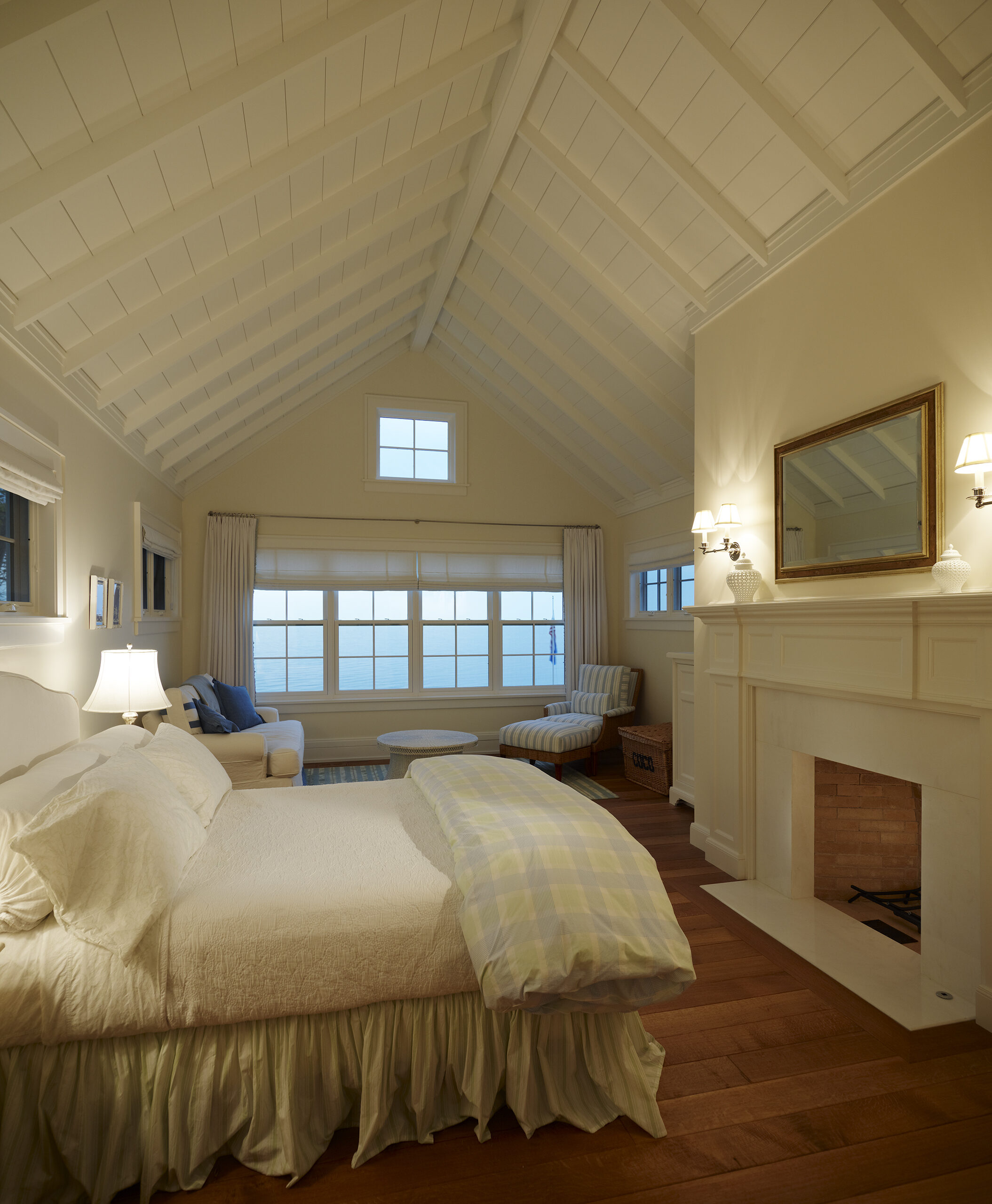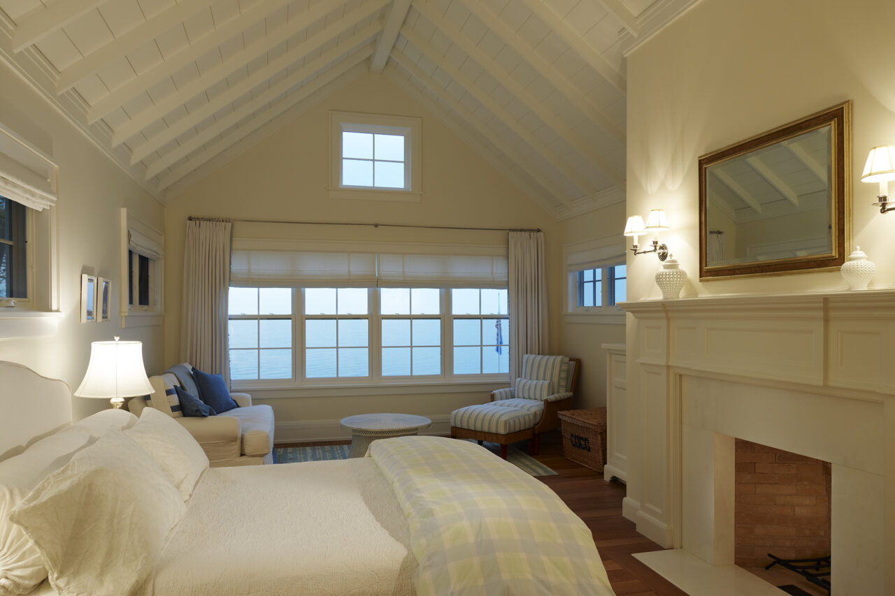 Family bedrooms are located off a shared open corridor on the second floor and each bedroom has its own large bank of windows. The Primary and Guest bedrooms have cathedral ceilings and a balcony to maximize access to natural light with private views to the lake and landscape.