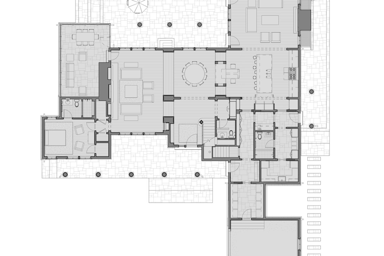 The exterior materials include limestone, cedar and lead coated copper, selected for their longevity and low maintenance characteristics as well as their beauty. The interior materials include hand scrapped oak floors, stone, tile and pine siding, selected for their durability and capacity to endure years of use gracefully.