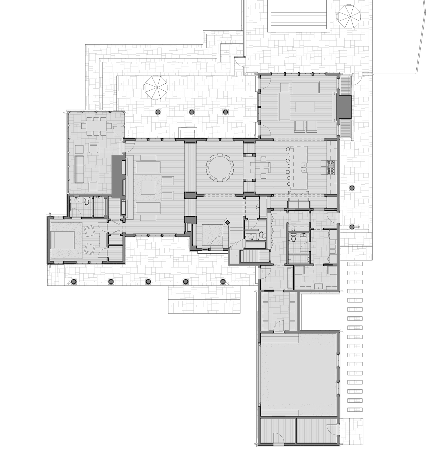 The exterior materials include limestone, cedar and lead coated copper, selected for their longevity and low maintenance characteristics as well as their beauty. The interior materials include hand scrapped oak floors, stone, tile and pine siding, selected for their durability and capacity to endure years of use gracefully.