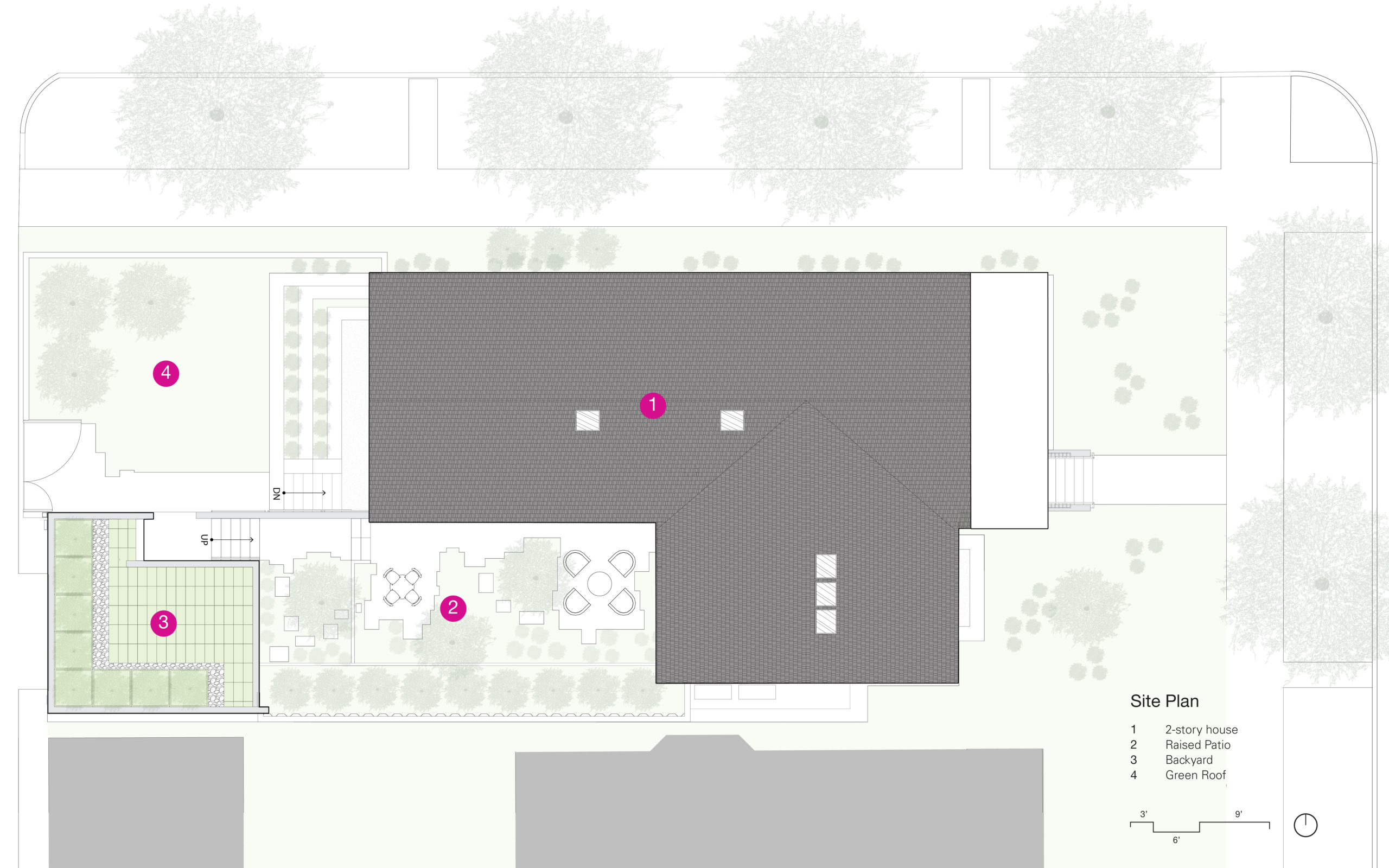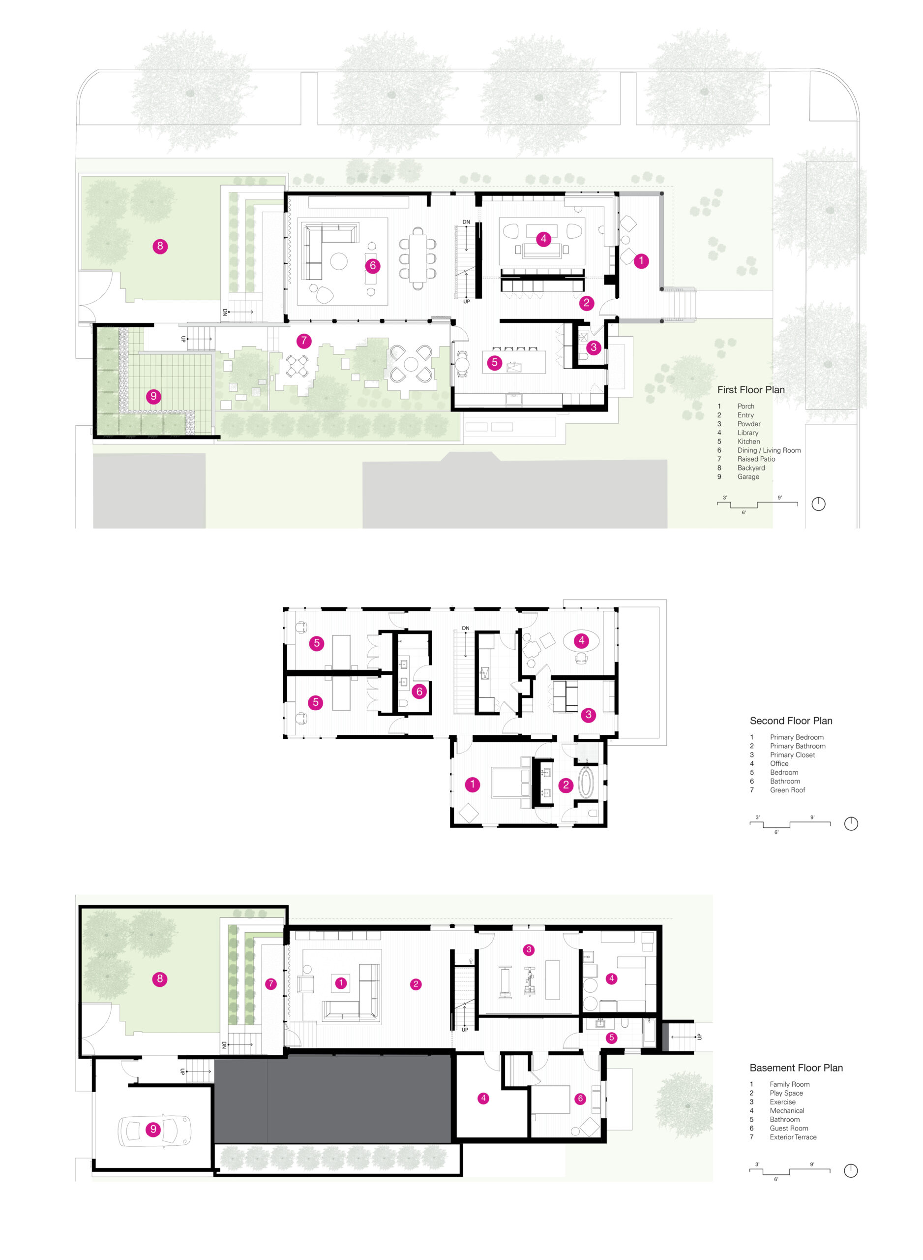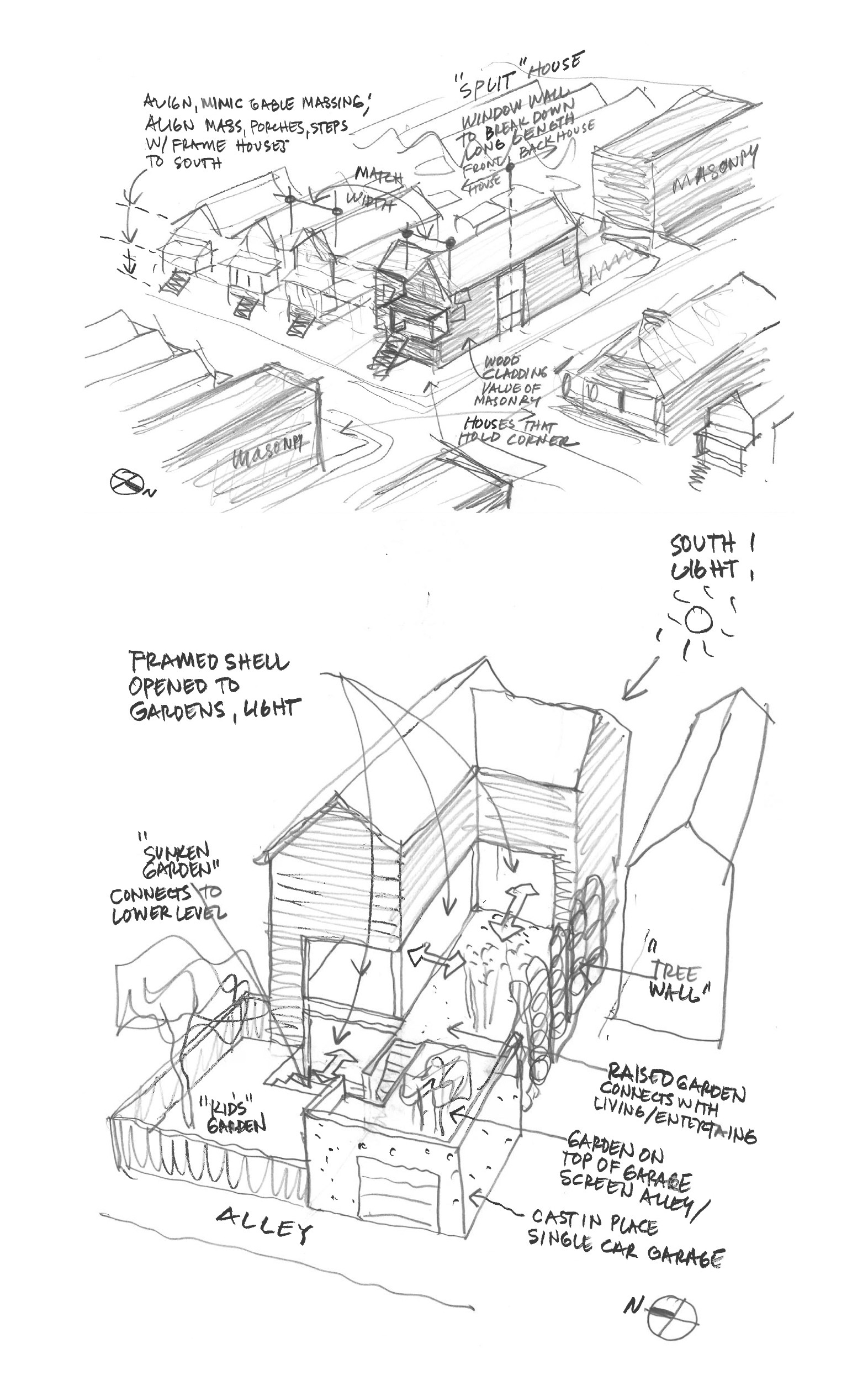 What first appears as a familiar form gradually reveals subtle mutations of the surrounding vernacular. The dark finish of the wood siding retains its natural figure, while nickel-gapped and mitered-corner details create a taut skin, punctuated by strategic apertures for light, view, and scale. The tone of the deep hued cladding reflects the masonry values around the intersecting streets, while the massing recalls the traditional forms of the southern neighbors.
