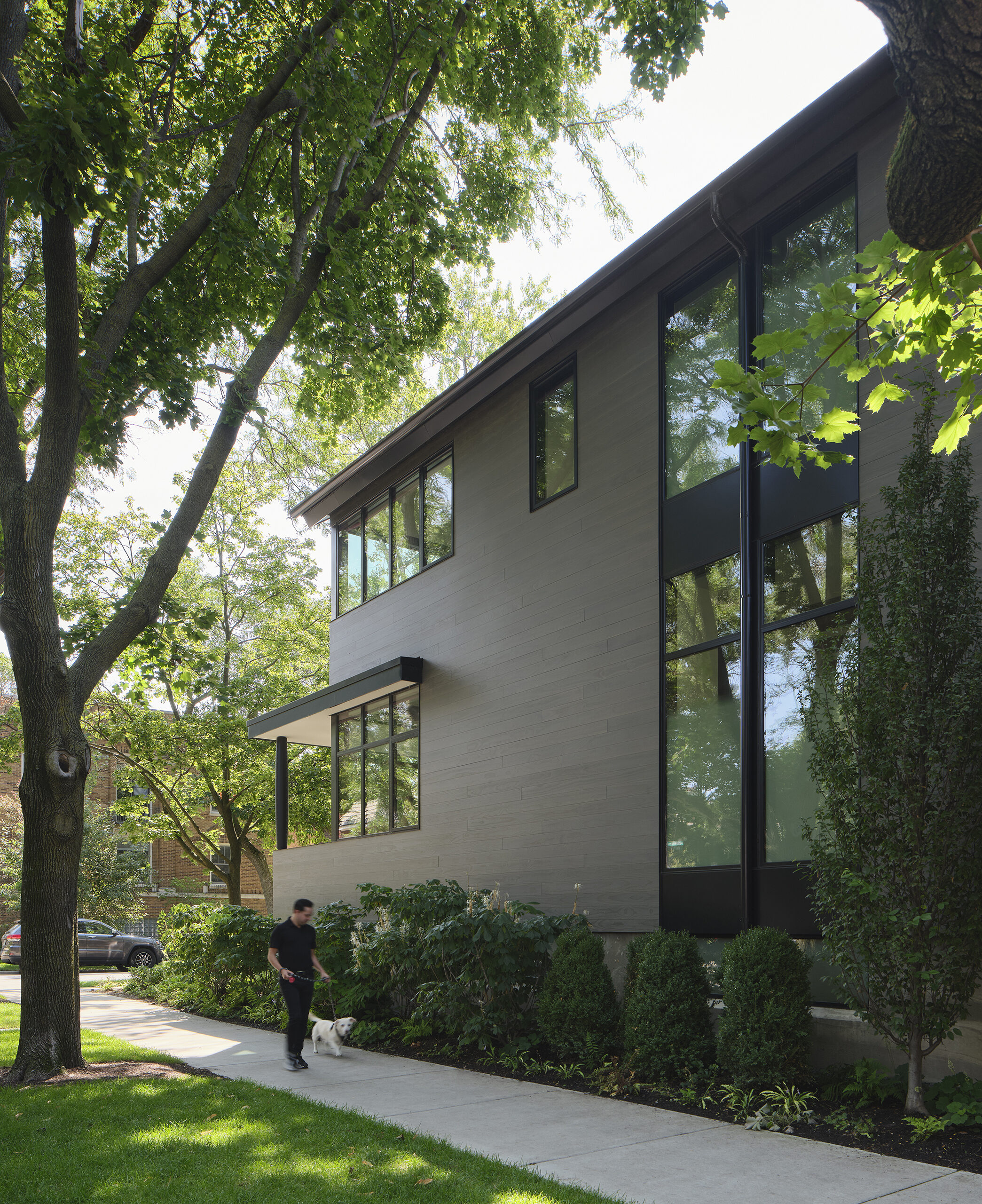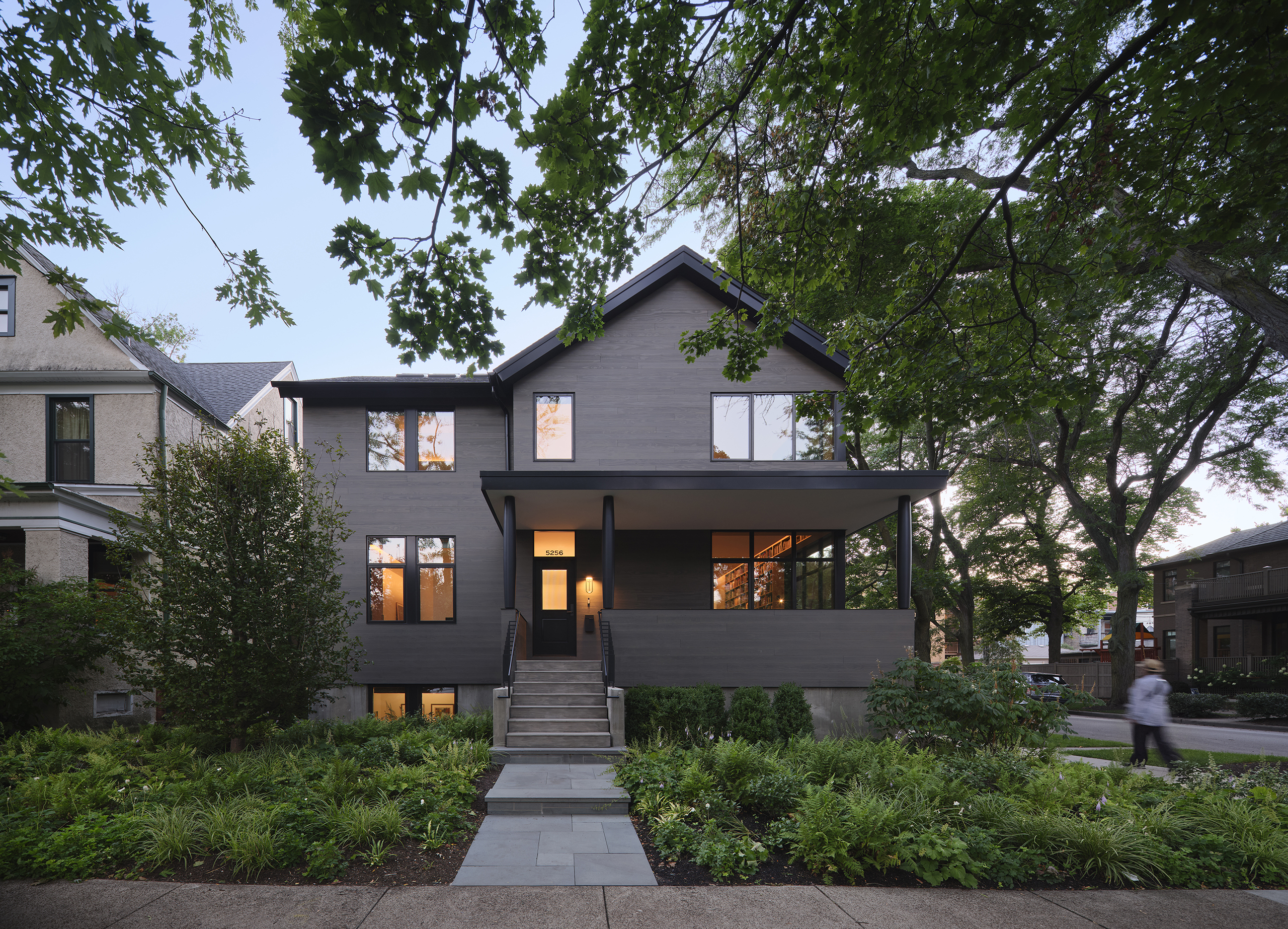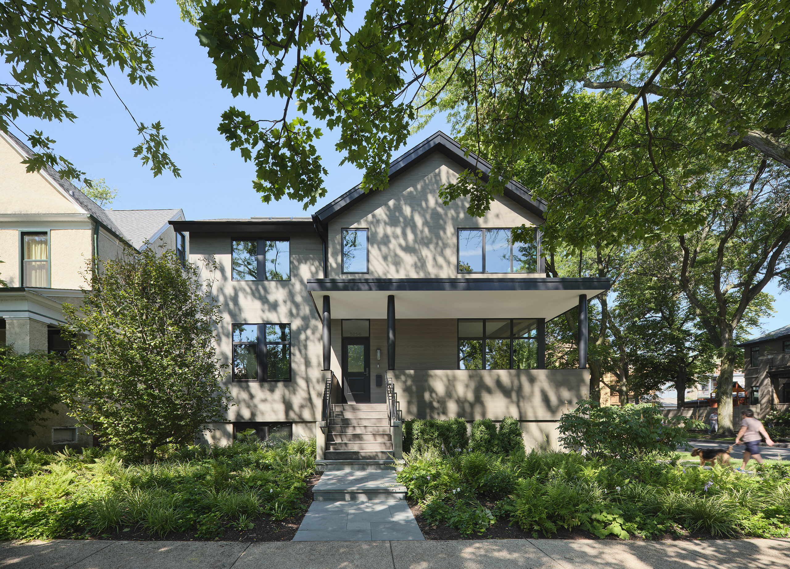 Lakewood Balmoral Residence celebrates thoughtful intersections. Located within a national Historic District on Chicago’s north side, it holds the corner with introspective presence, anchoring a line of wooden four-square homes with gabled roofs and front porches while engaging in dialogue with the juxtaposed brick corner buildings.