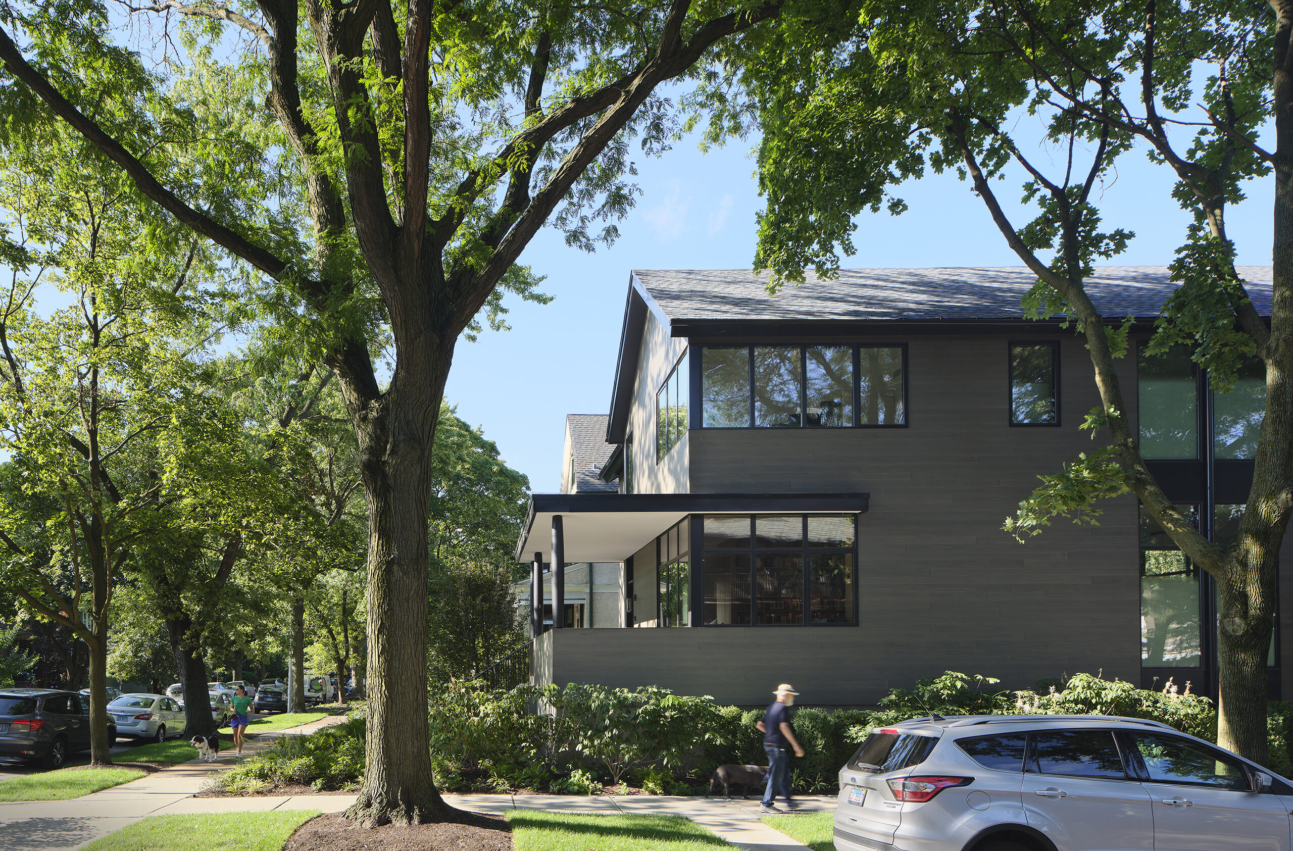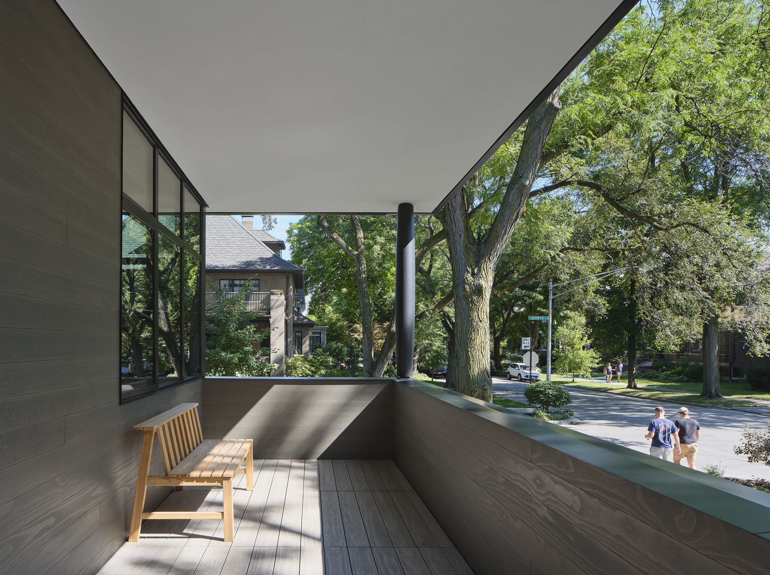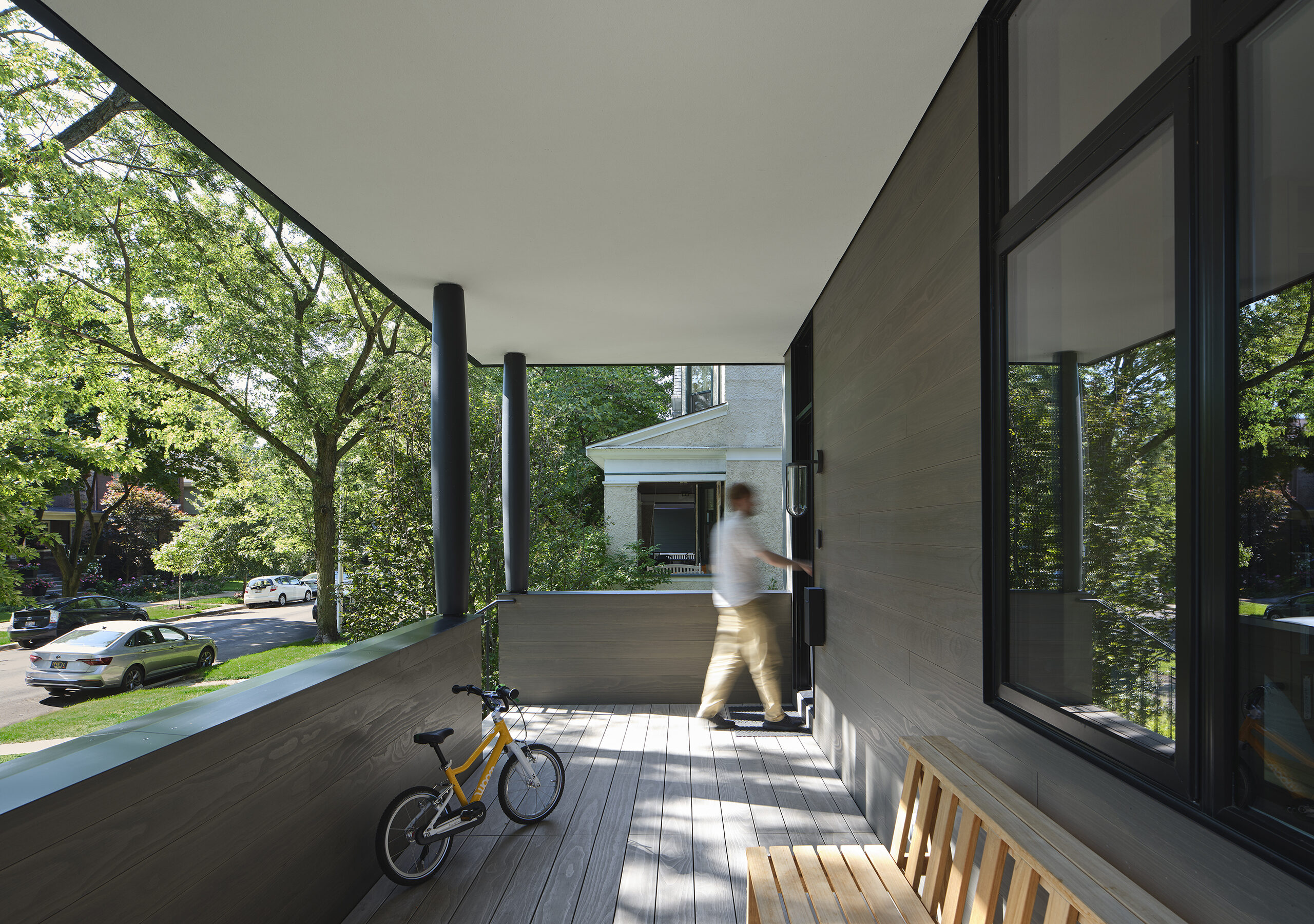 Lakewood Balmoral Residence celebrates thoughtful intersections. Located within a national Historic District on Chicago’s north side, it holds the corner with introspective presence, anchoring a line of wooden four-square homes with gabled roofs and front porches while engaging in dialogue with the juxtaposed brick corner buildings.