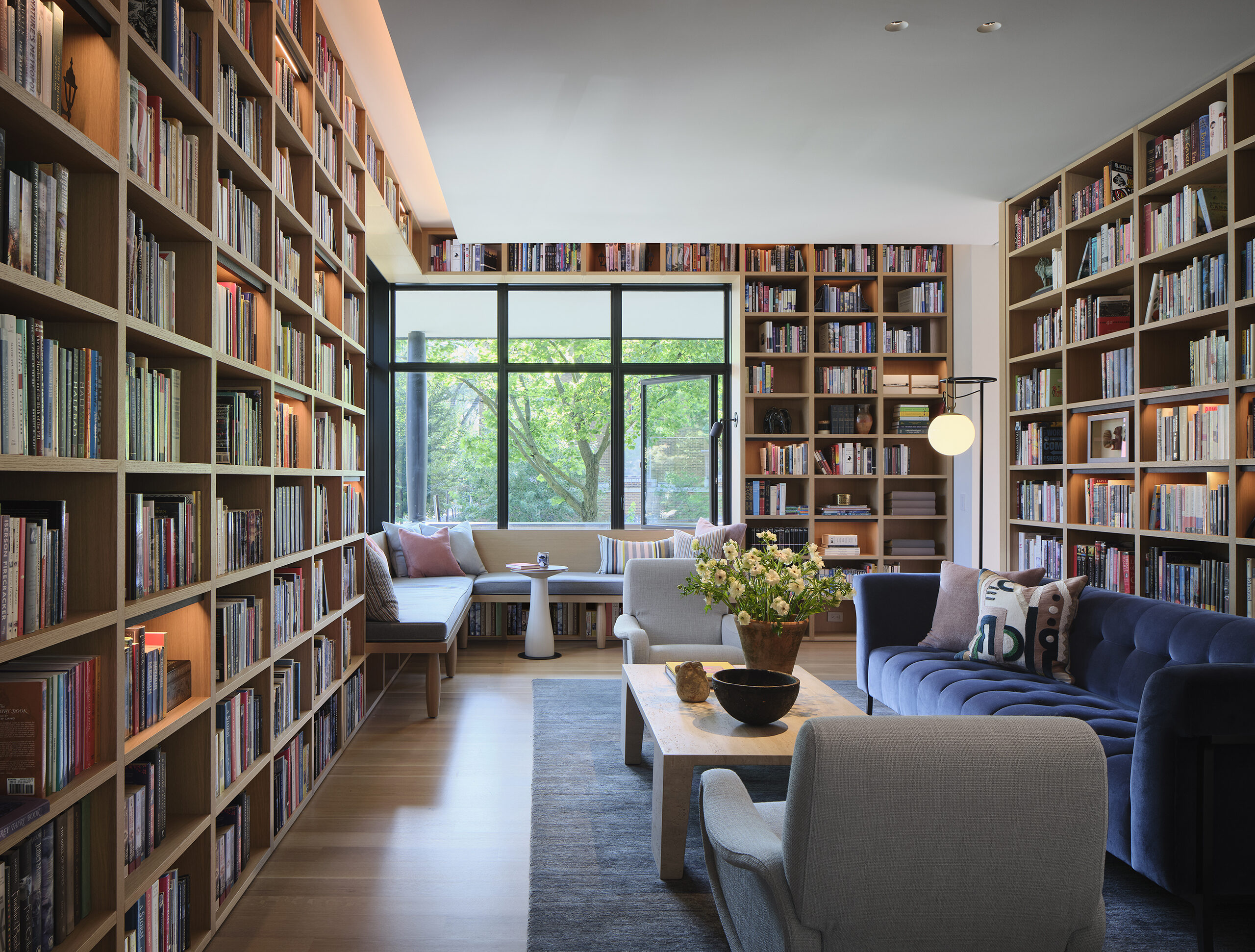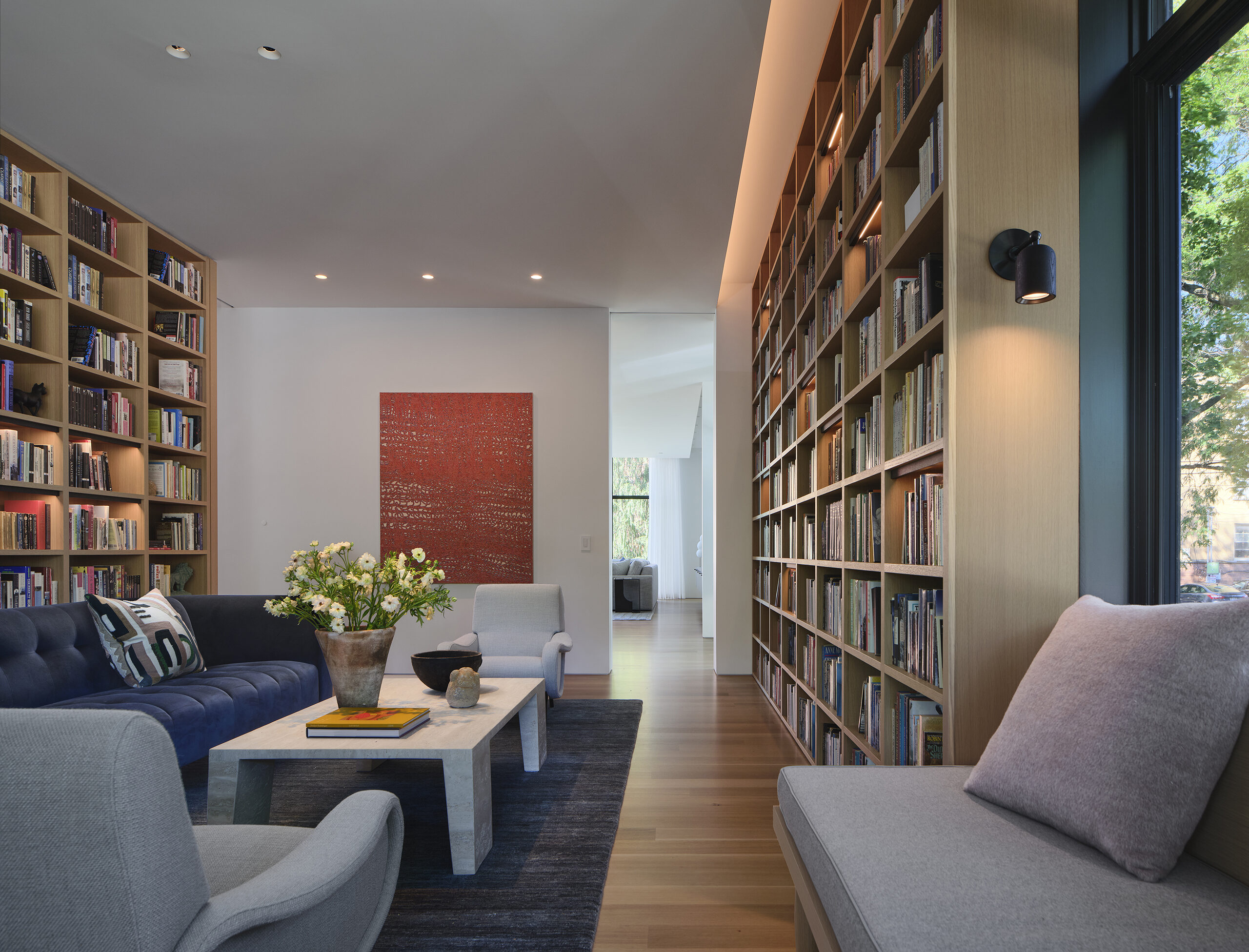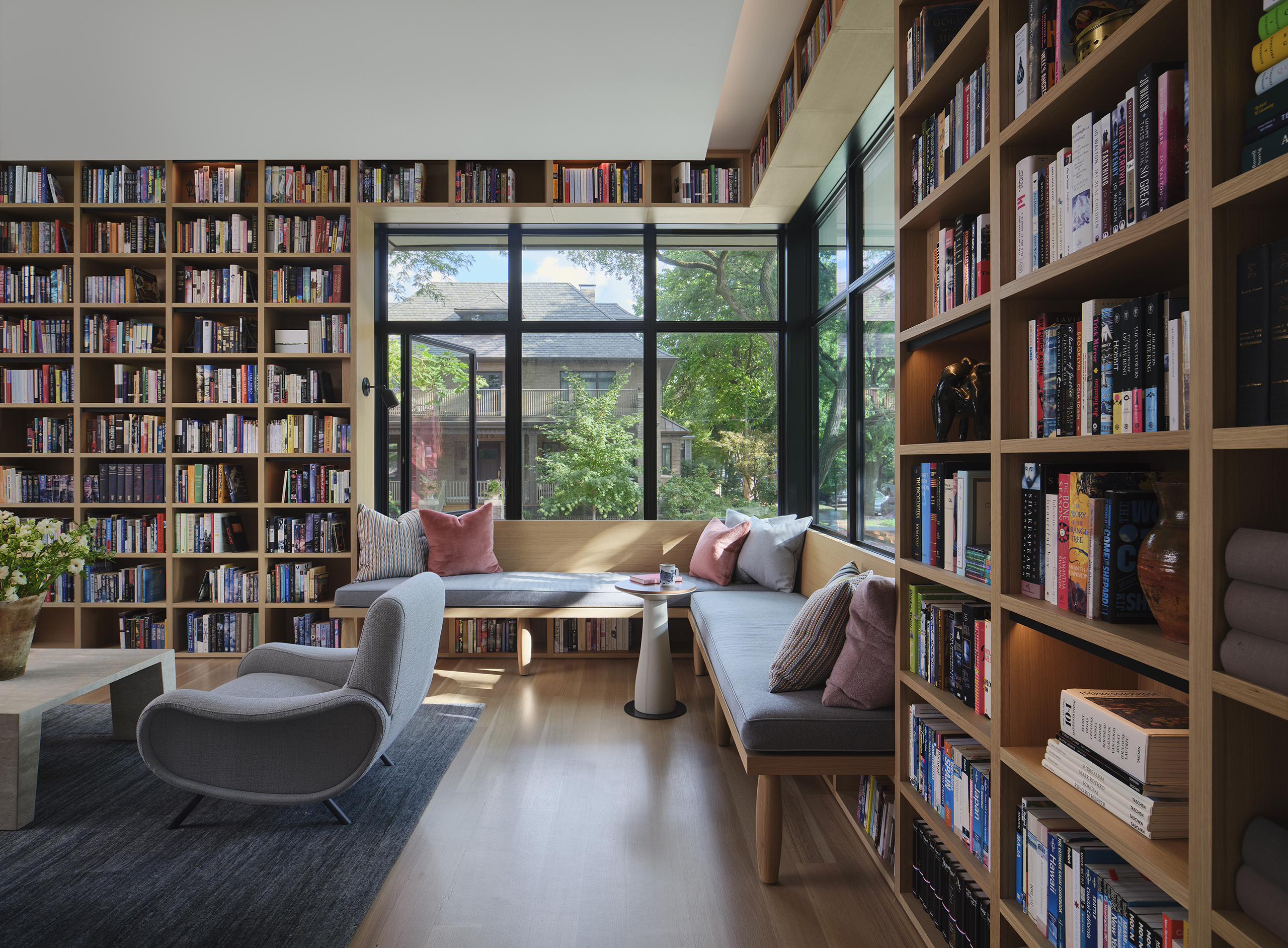 The turned columns of the front porch migrate within as window seat supports, connecting the interior with surroundings through the corner window. Floor-to-ceiling bookshelves slip past the ceiling to elevate scale in the heart of the home without loss of intimacy.