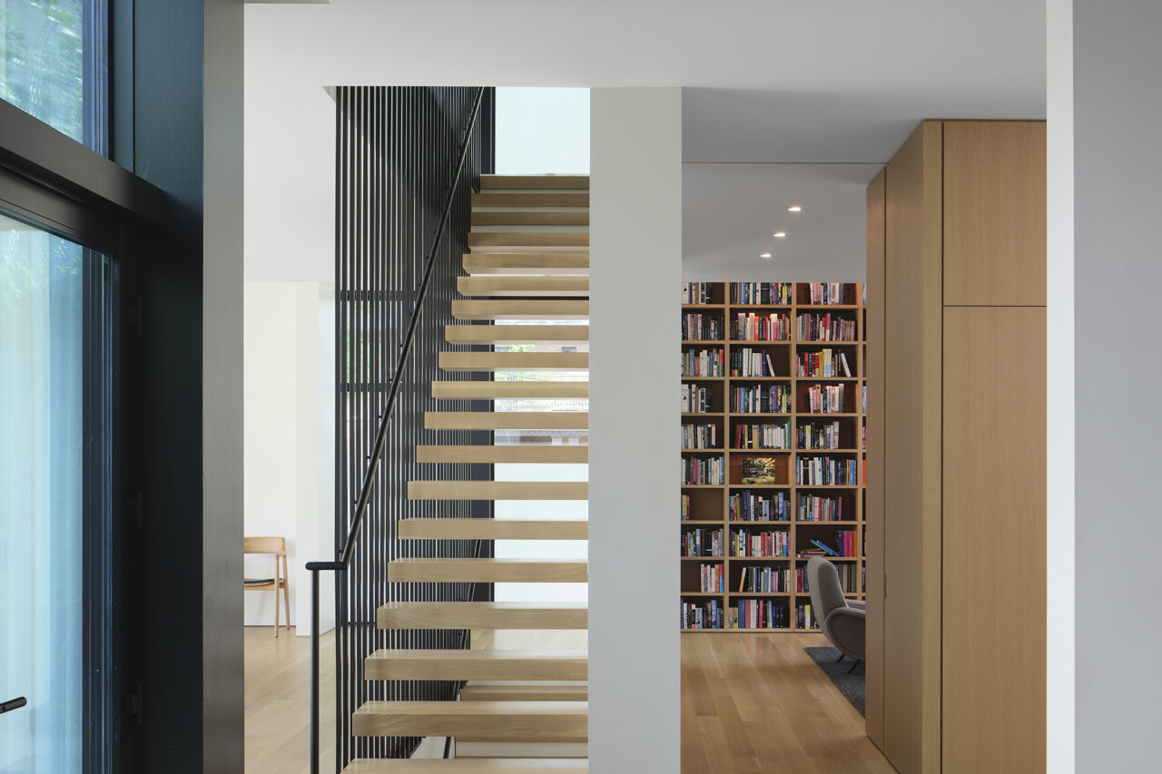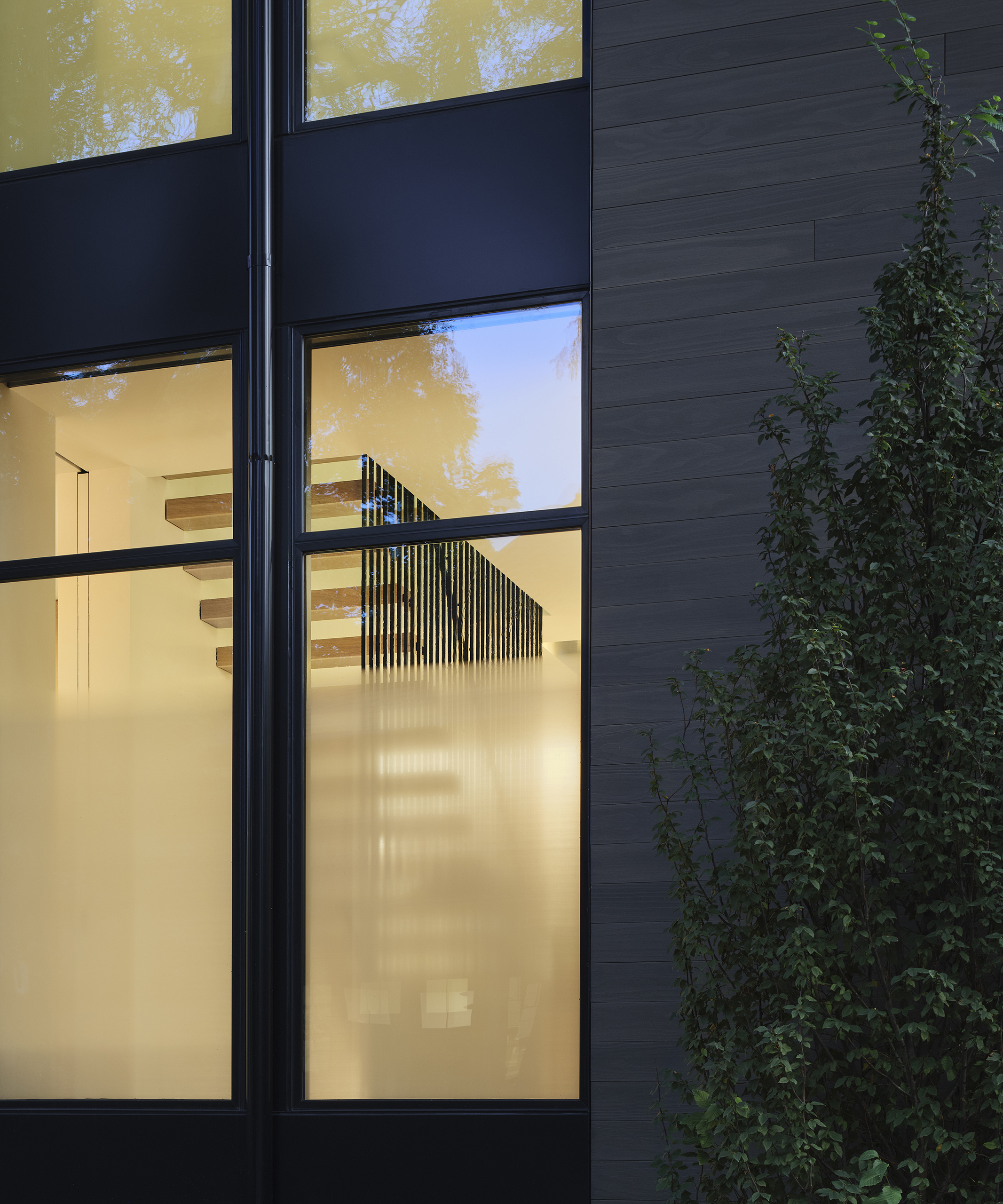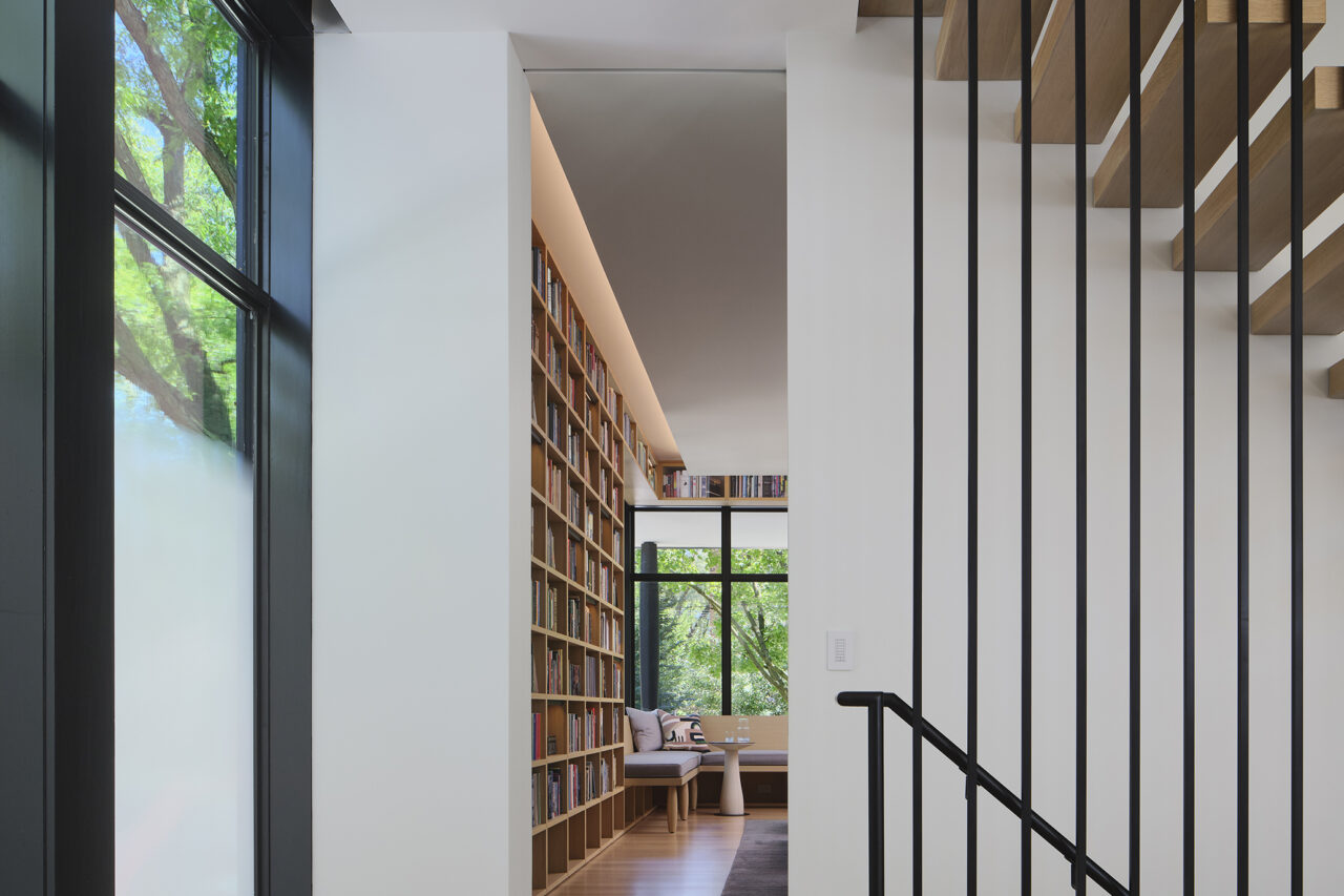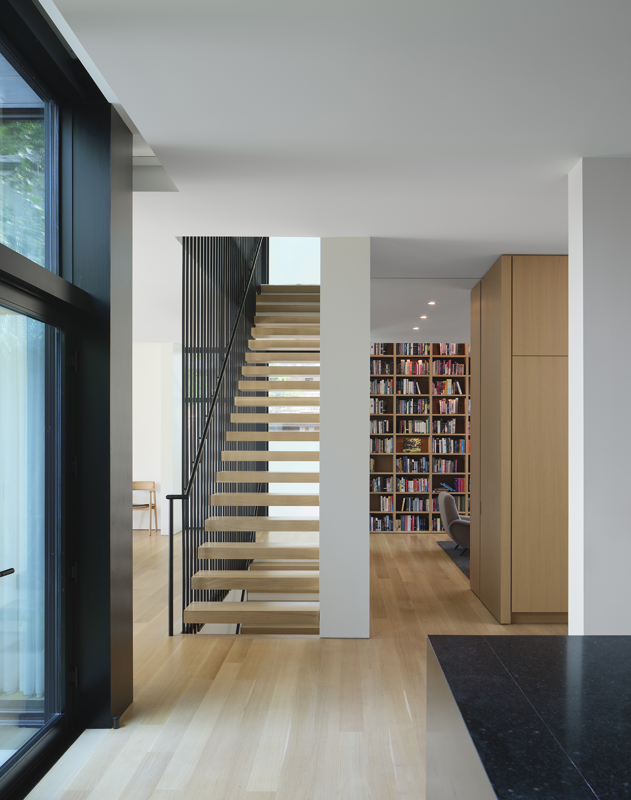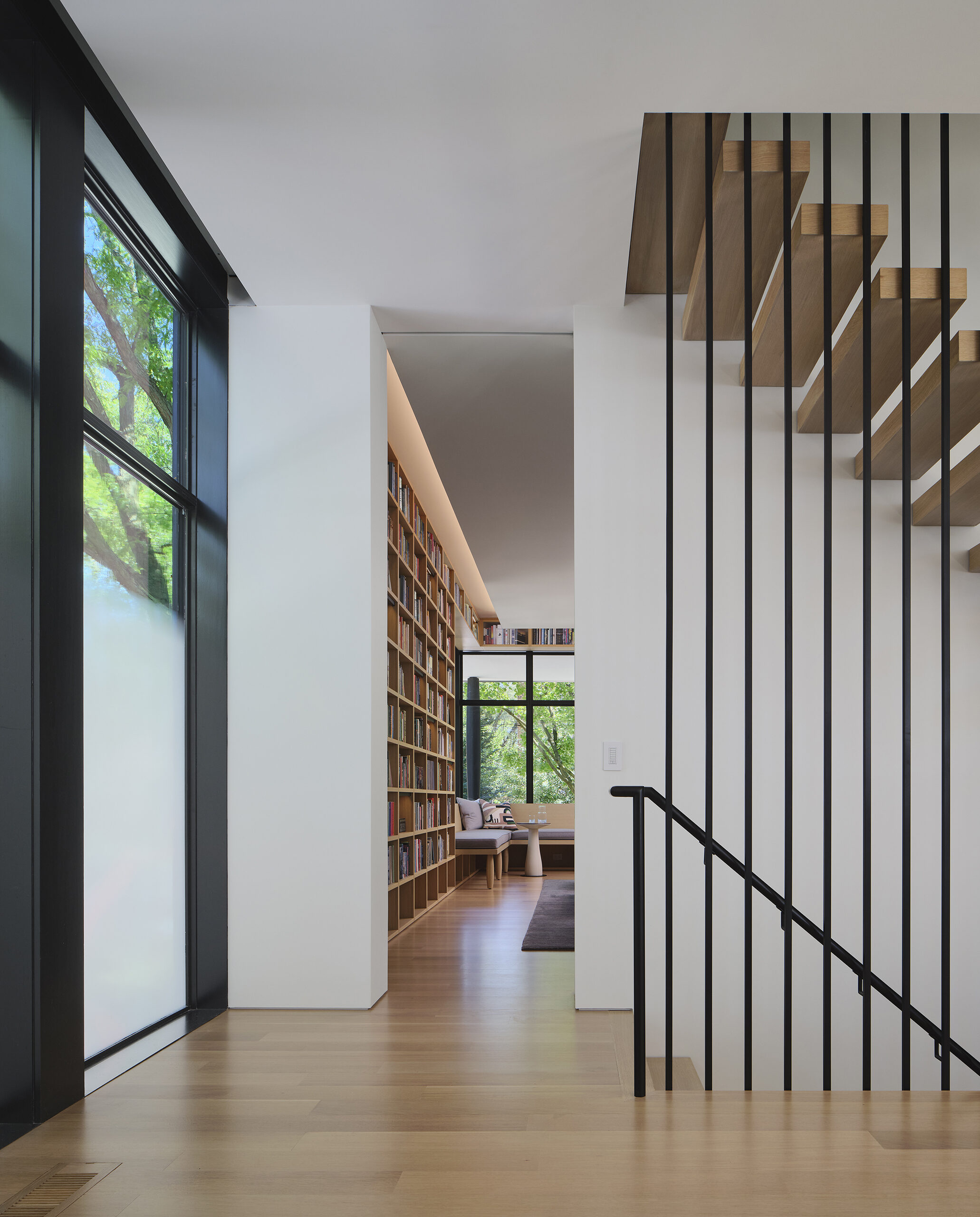 Thoughtful detailing enhances the home’s character: piano-string stair rails span vertically from the basement to the second floor, recalling exterior rails and window frames as they reinforce cantilevered white oak stair treads with a structural handrail.