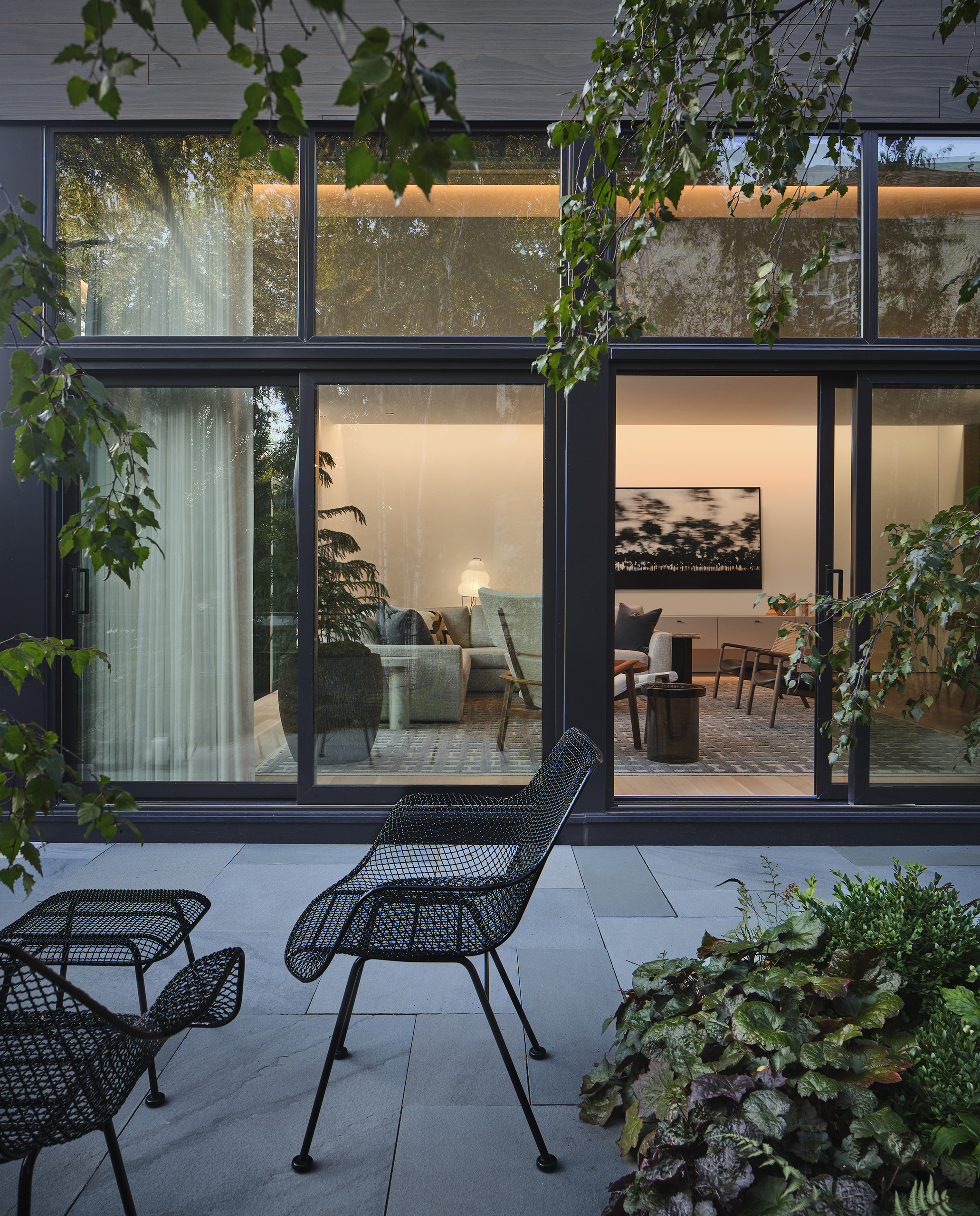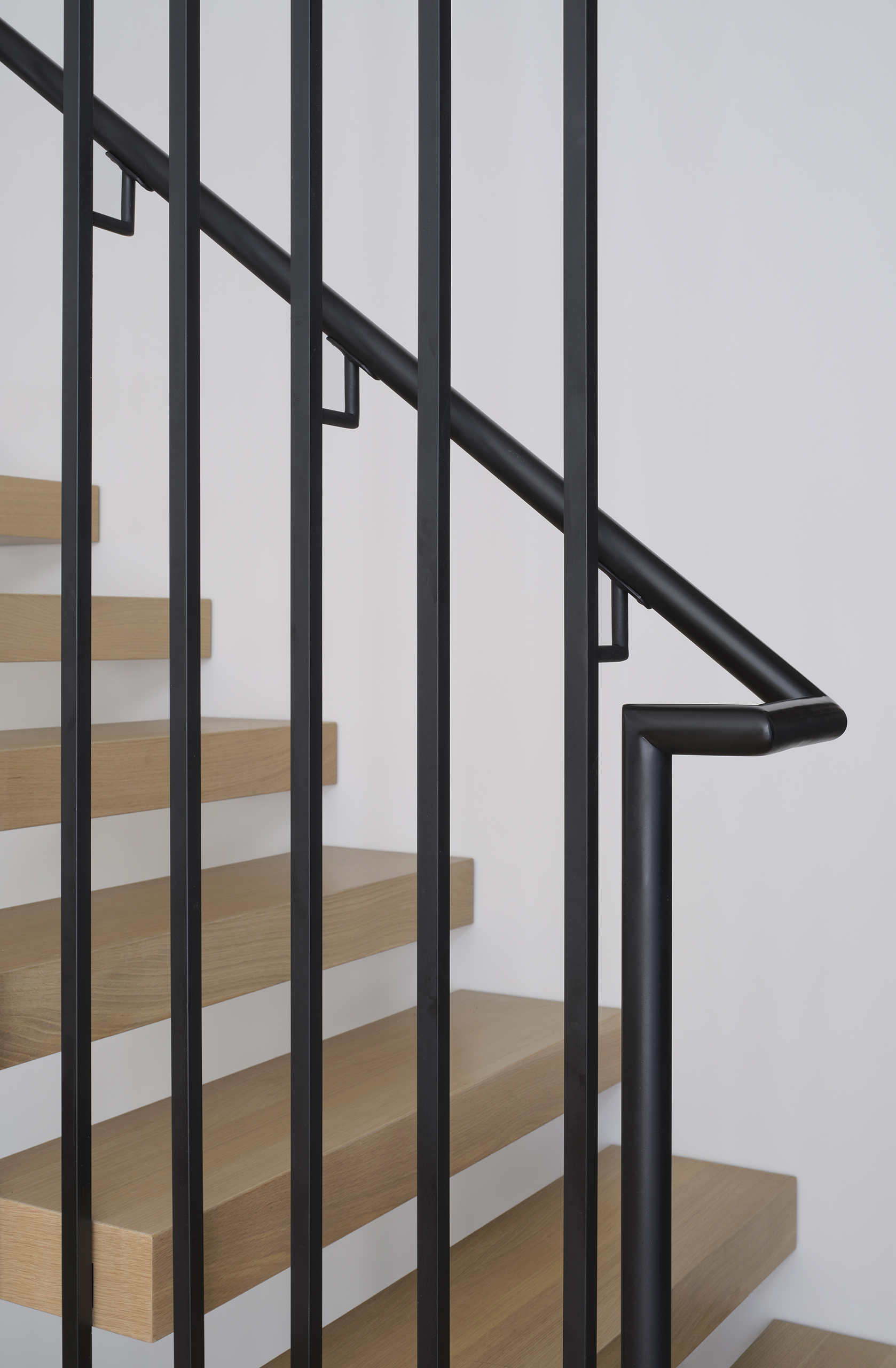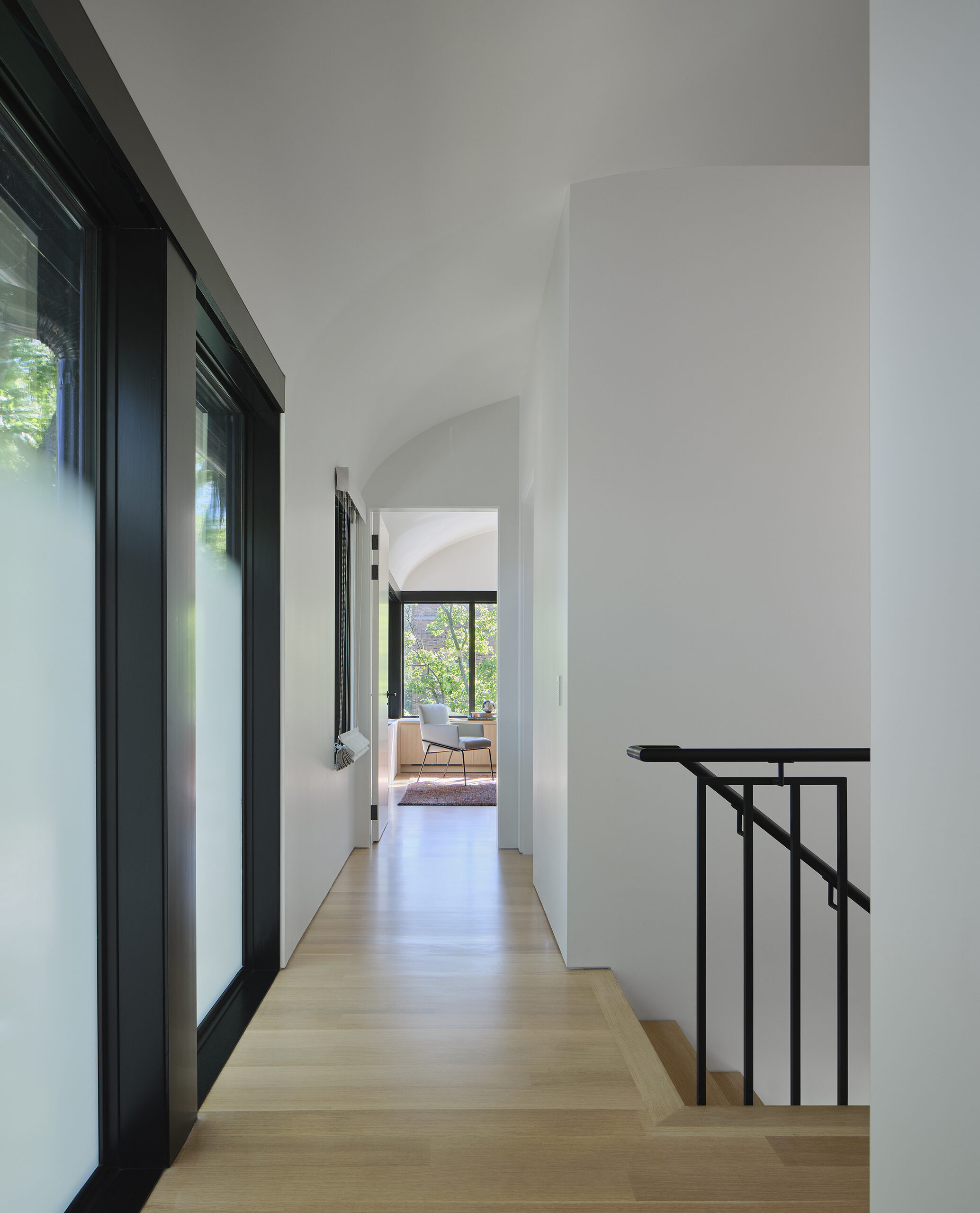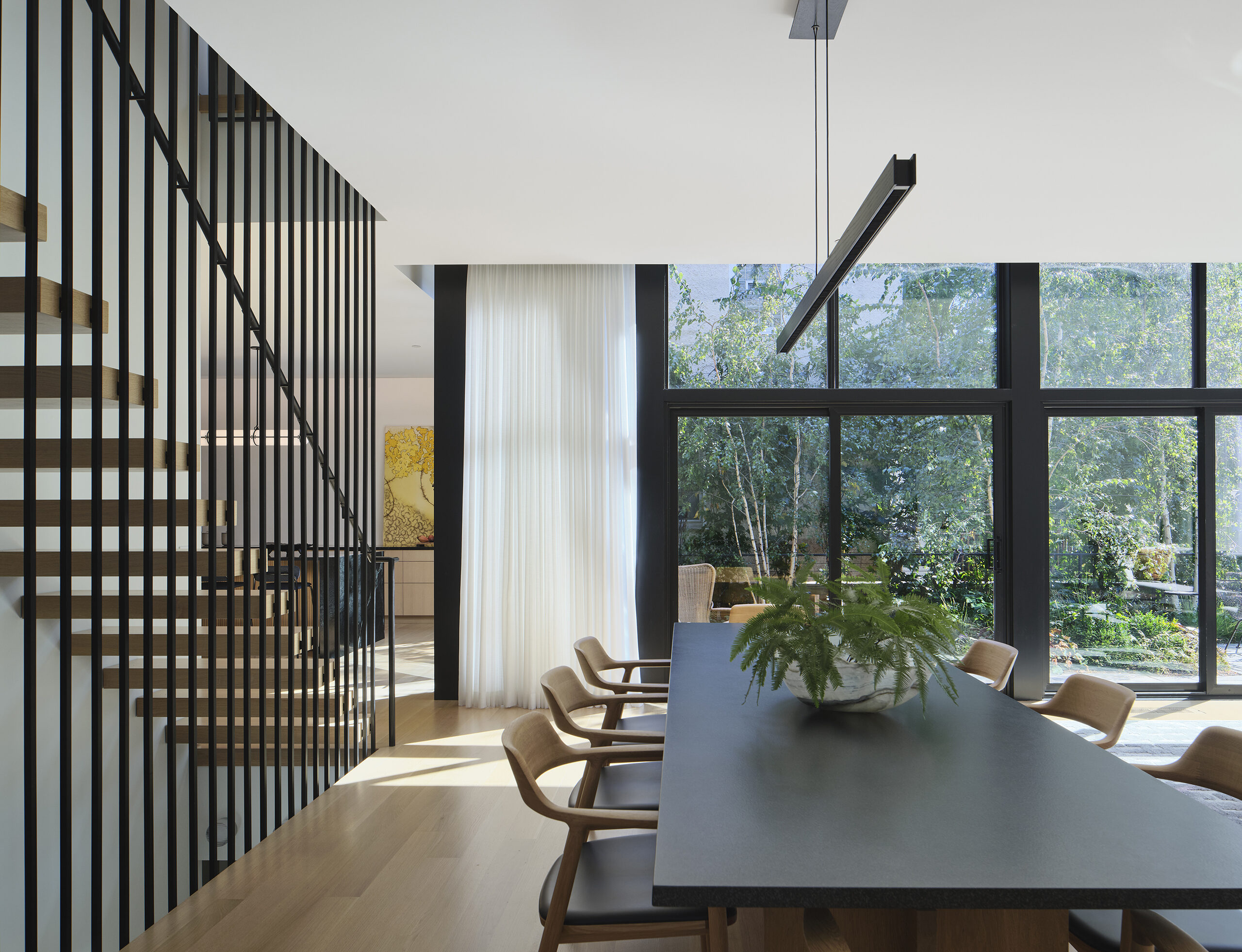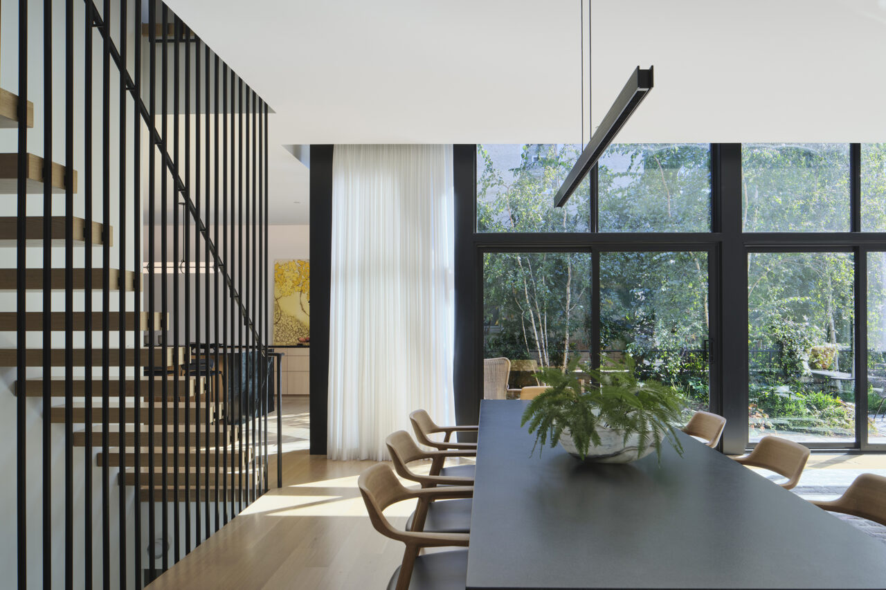 Thoughtful detailing enhances the home’s character: piano-string stair rails span vertically from the basement to the second floor, recalling exterior rails and window frames as they reinforce cantilevered white oak stair treads with a structural handrail.
