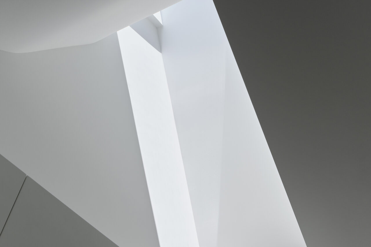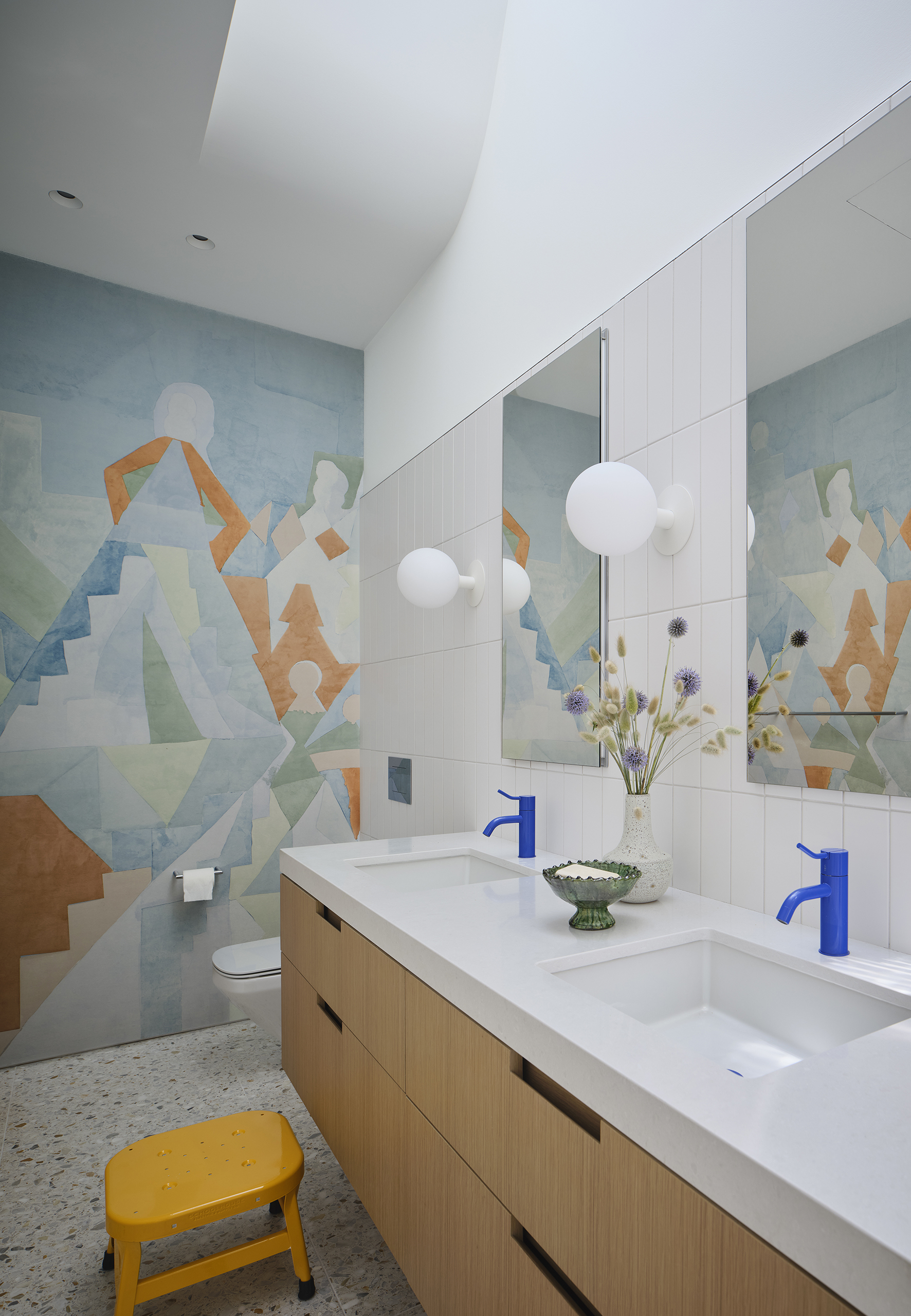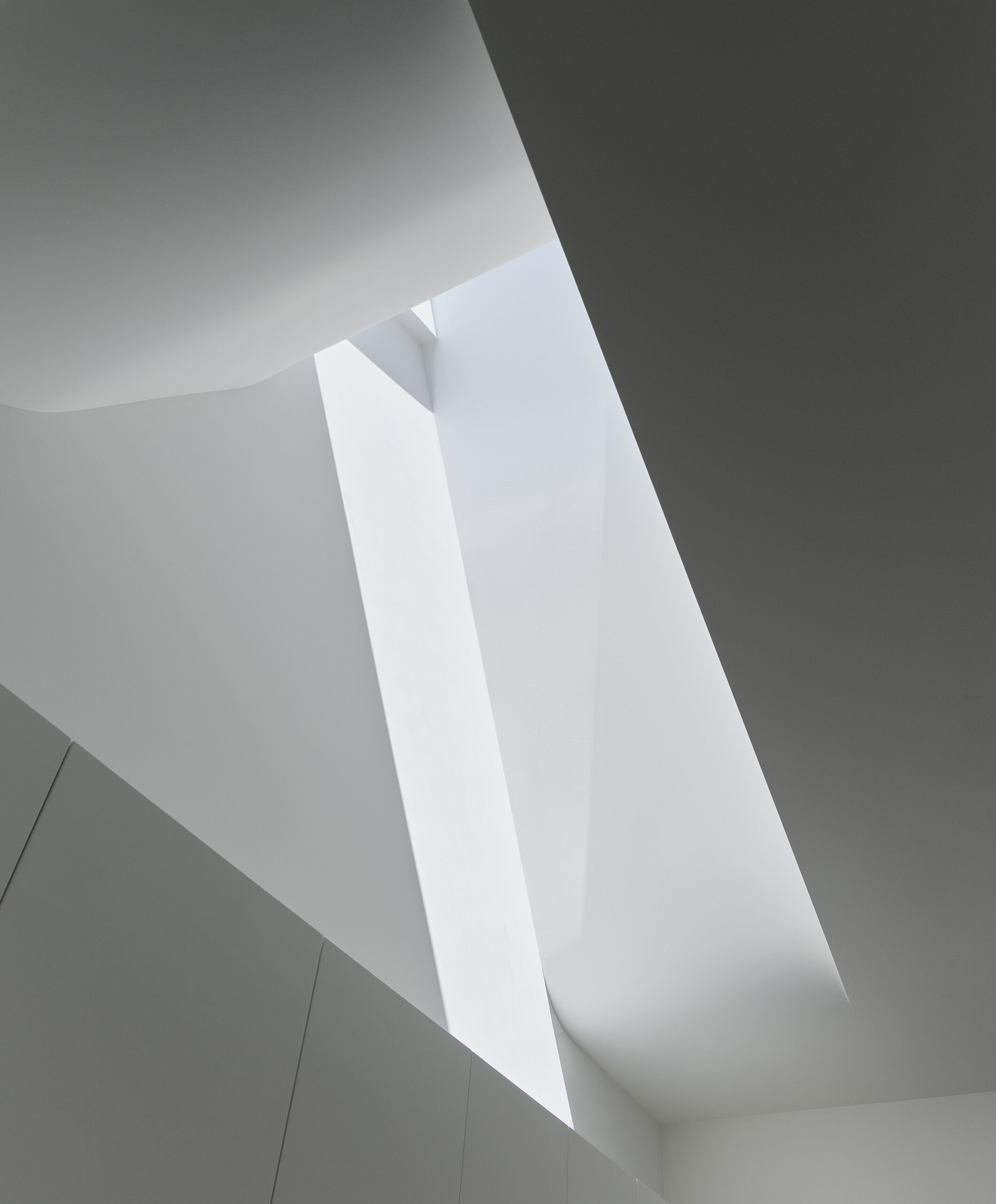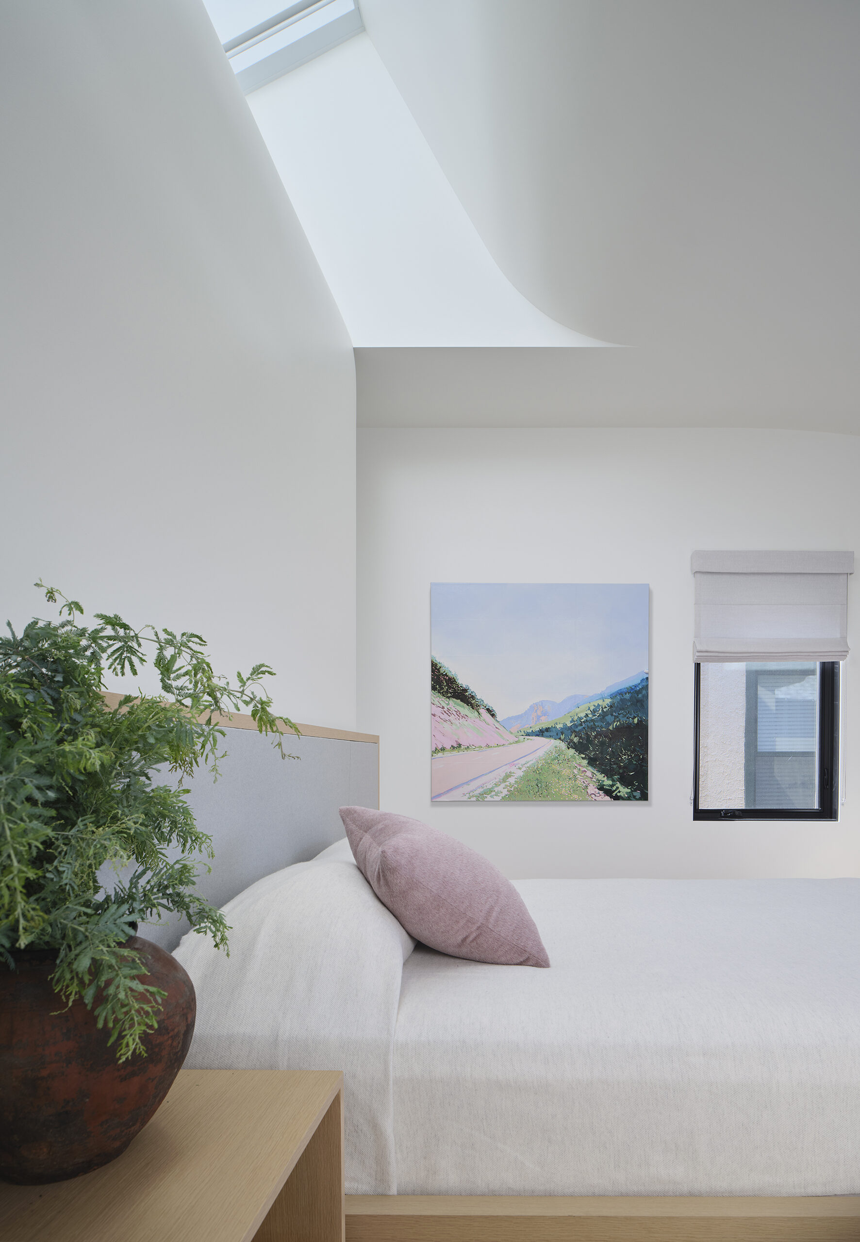 Upstairs, softly curving walls—an unexpected spatial gesture—softens transitions and shapes a distinctive upper floor. Light, too, is sculpted with intention: skylights draw natural light into the heart of the home, their surprising curved plaster reveals casting shifting patterns that celebrate changing weather and seasons.