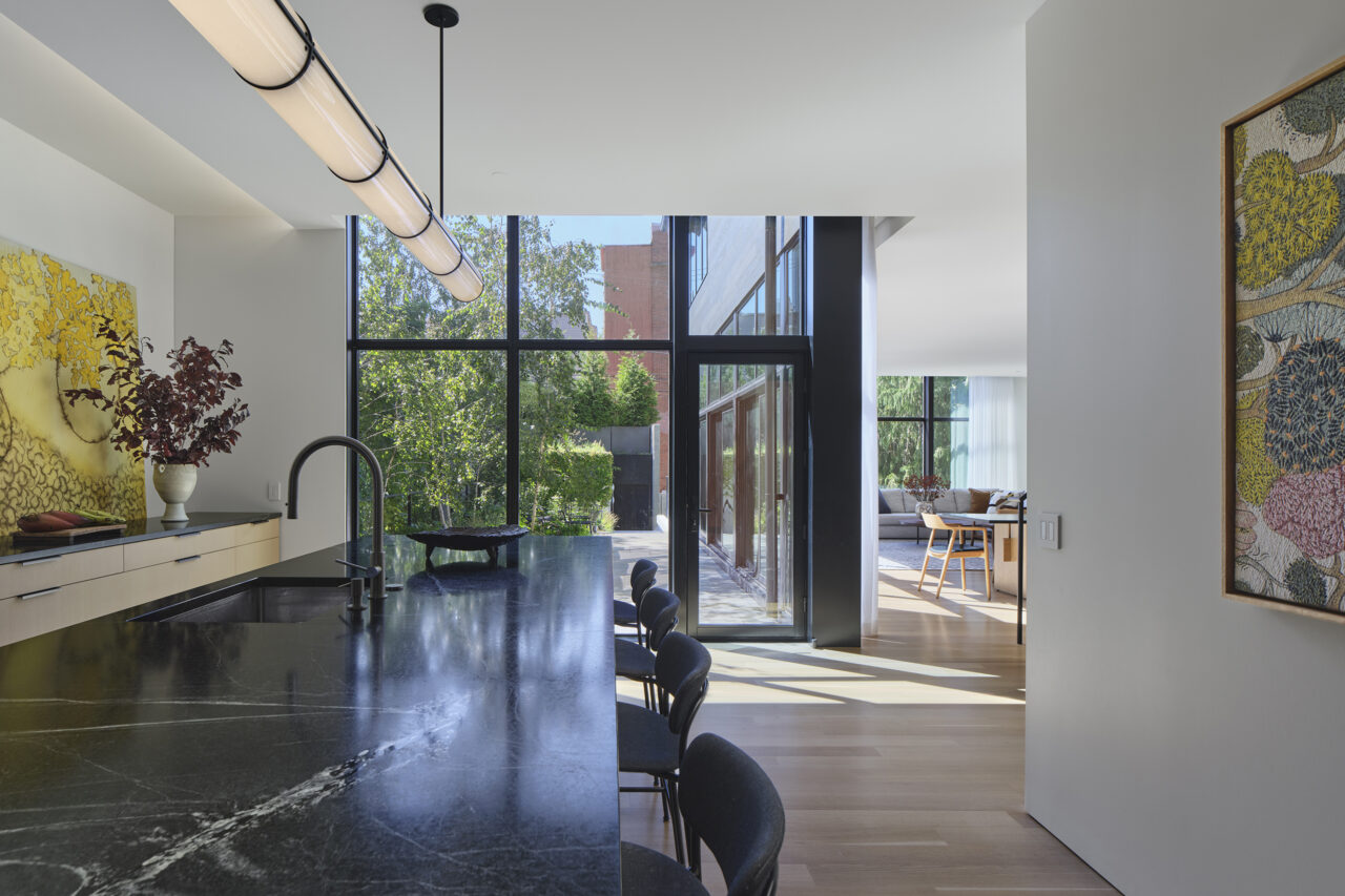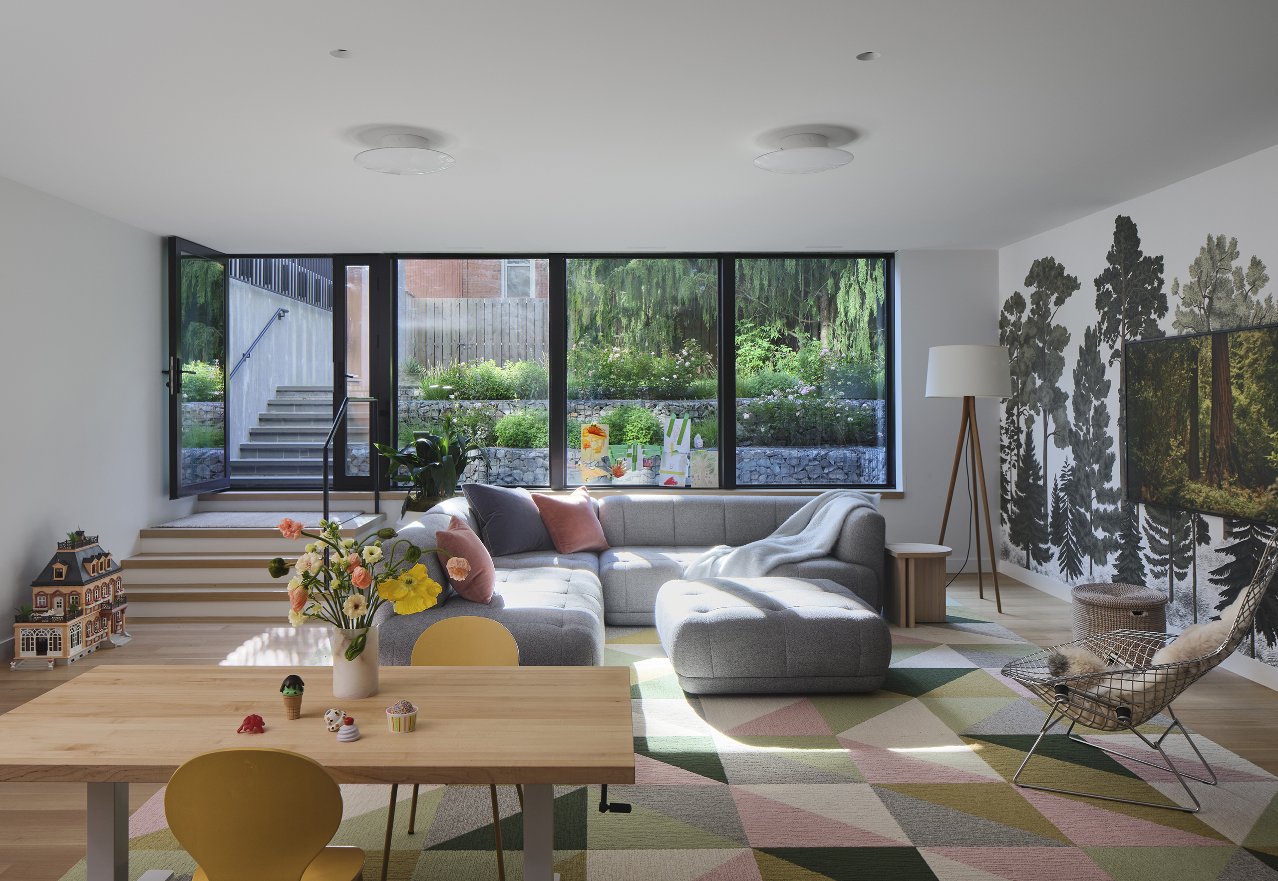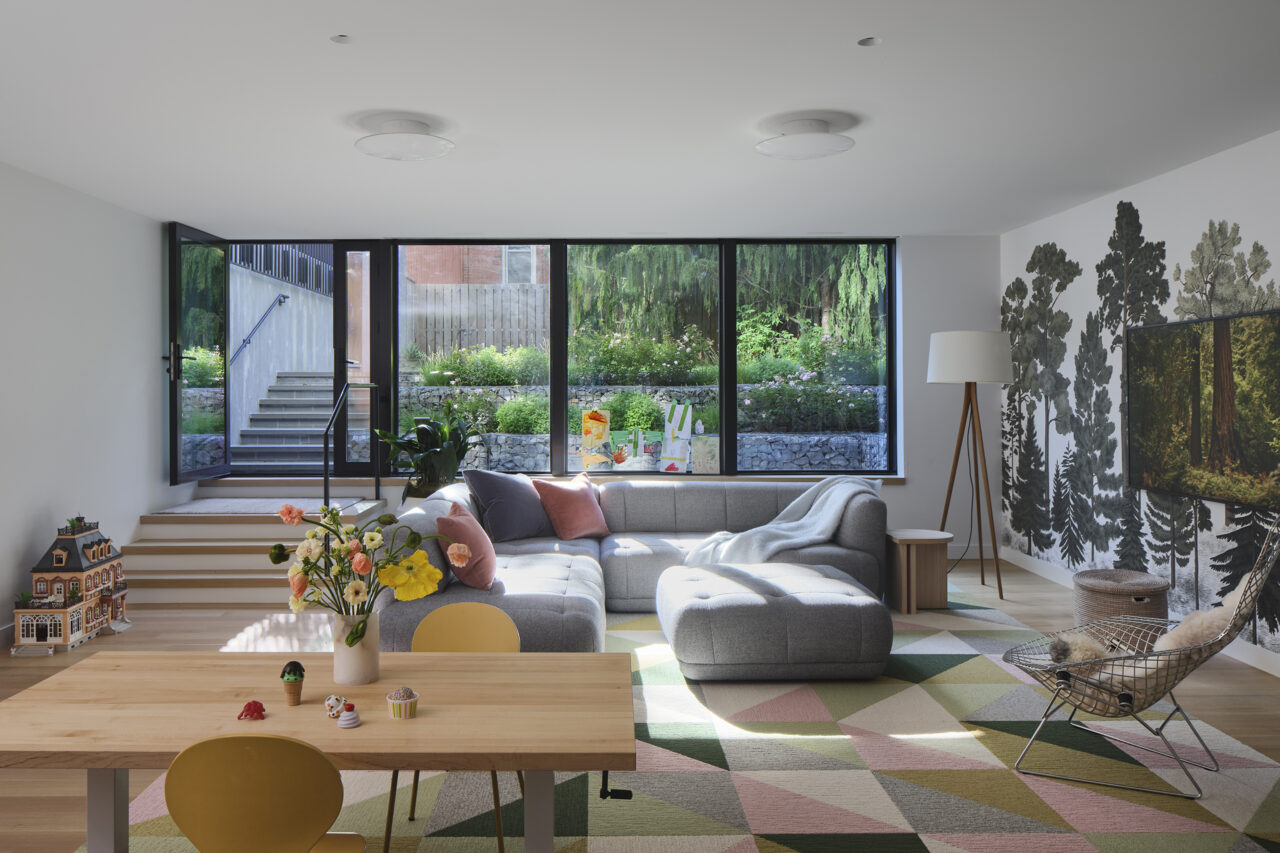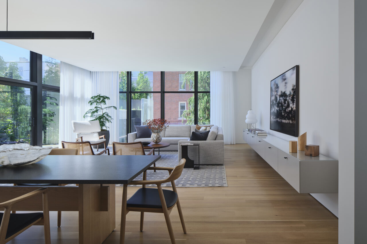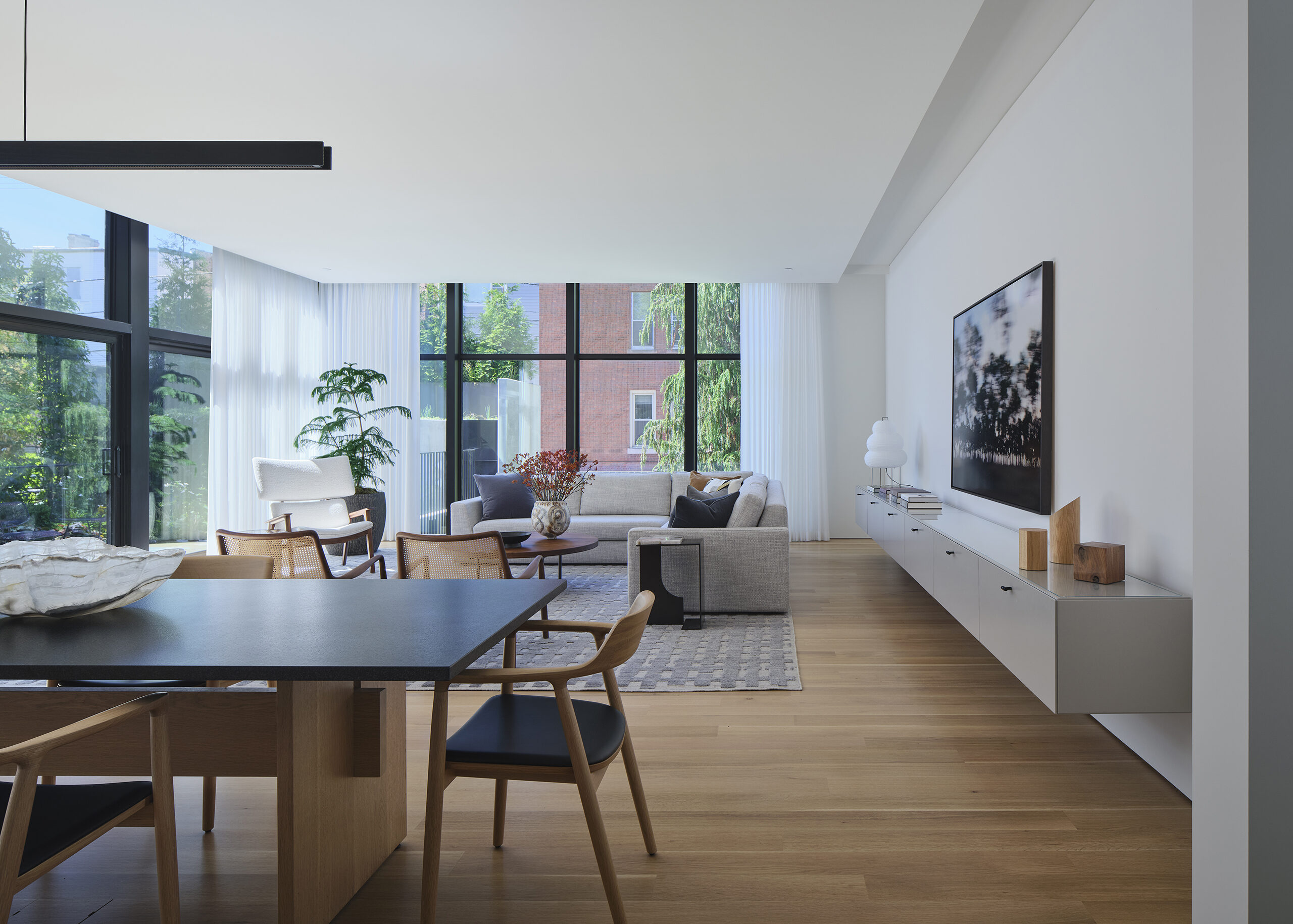 The home’s ‘L-shaped’ layout embraces sun and terraced gardens, spilling into the floor-to-ceiling windows of the open first floor with windows stretching past the ceiling to accentuate the connection to the yard. In the living/dining room, a “plastered” north wall (fabric stretched over acoustic insulation) dampens sound during gatherings, while drapery concealed behind a seamless ceiling frames views through the expansive windows.