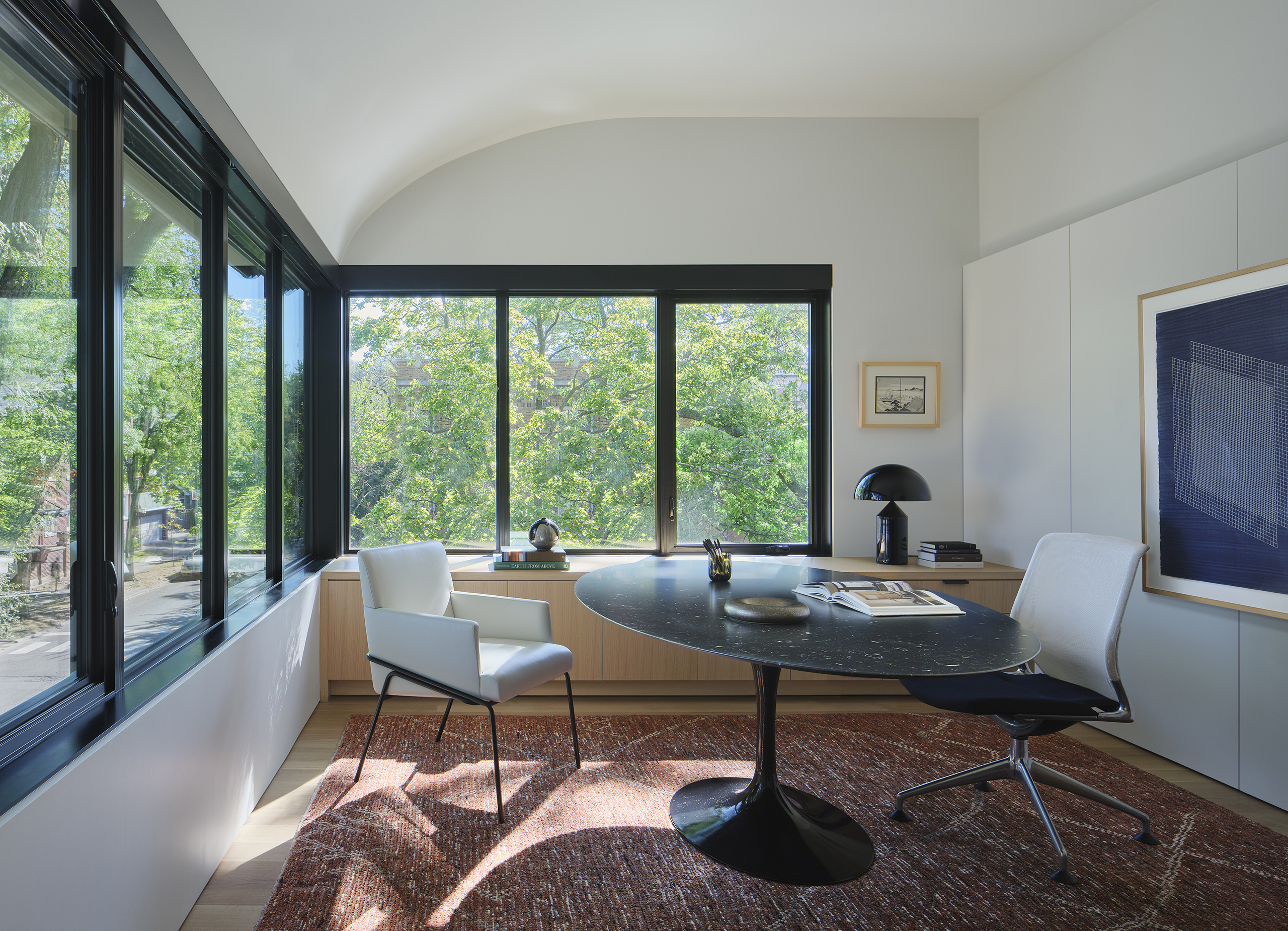 Minimal strategic placement of millwork volumes and drywall planes define interior spaces while preserving the scale of the building as a free-flowing open plan, with pocketing doors tuning privacy as needed.