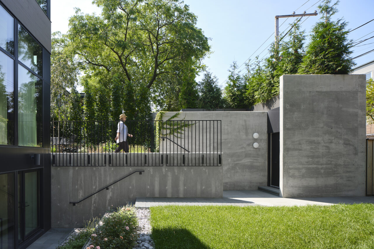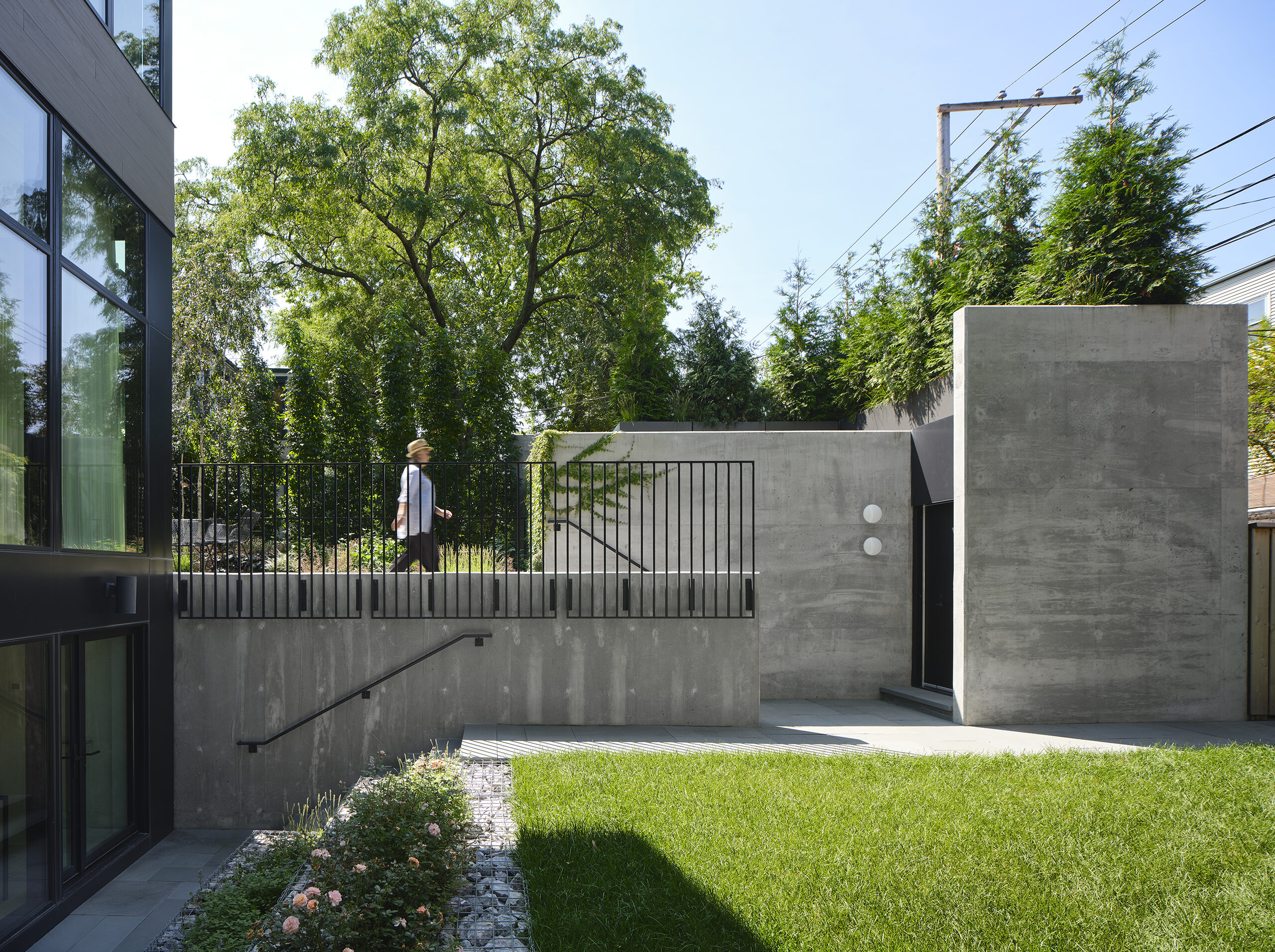 Shaping the pockets of varied elevation, low-carbon concrete planes extend from the building foundation out to a quiet garage. At the transition from the public facade to the private rear garden, the house opens up for light with expansive glass while climbing ivy reclaims the garage’s austere concrete planes.