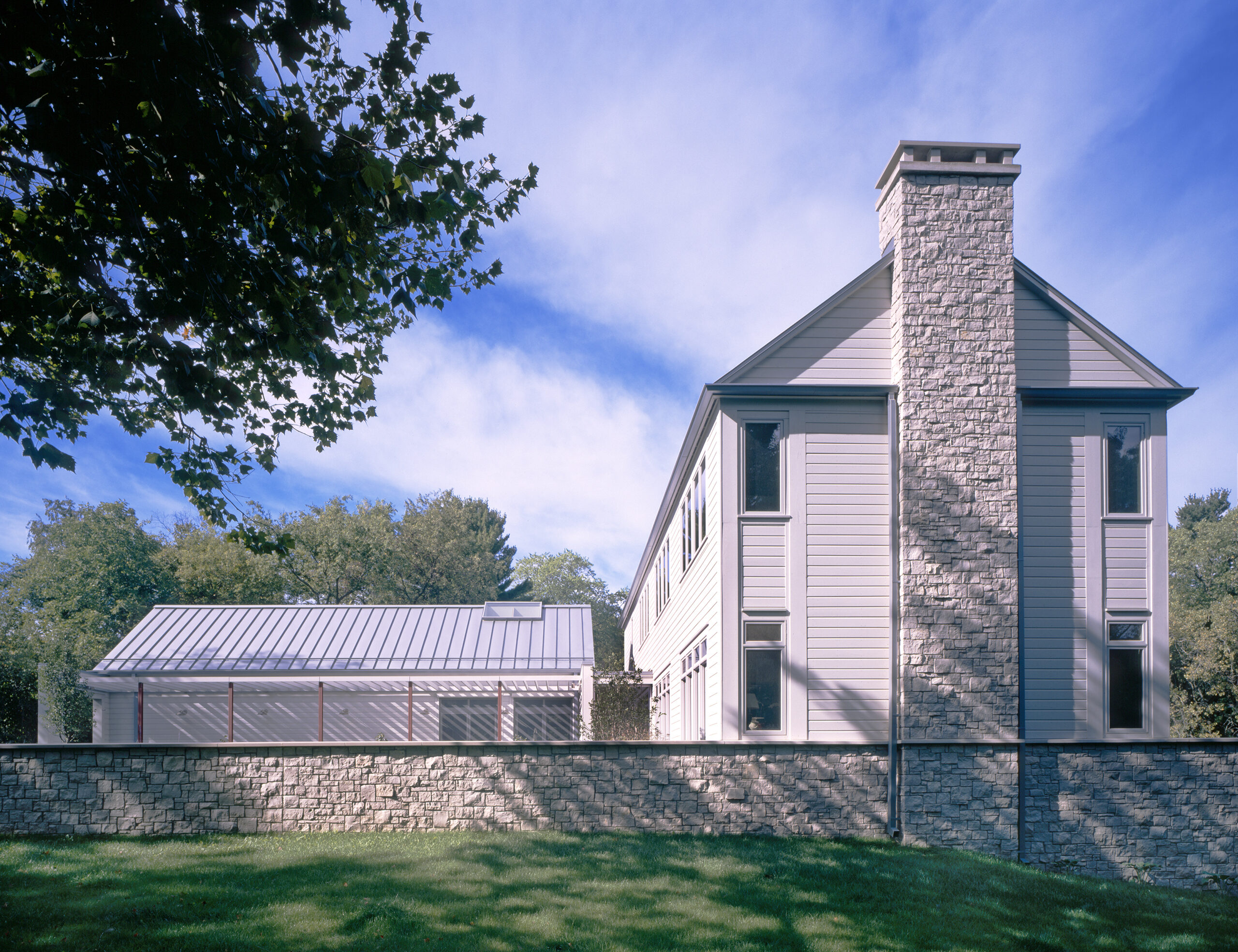 The building site is limited but augmented by sweeping vistas across neighboring properties. The compact volume of the main house is combined with the garage and a stone retaining wall opposite to carve a level entry court and garden from the rolling terrain.