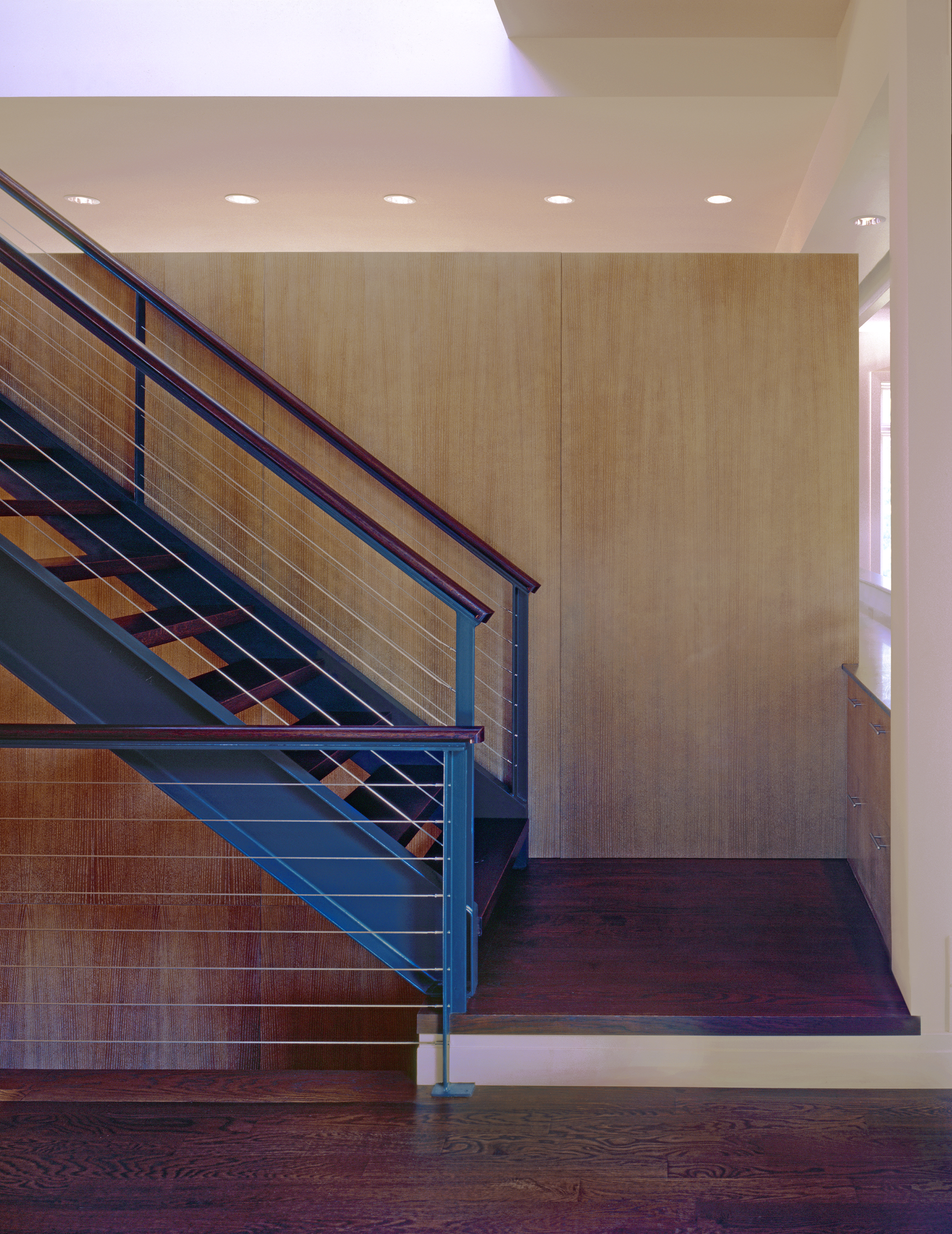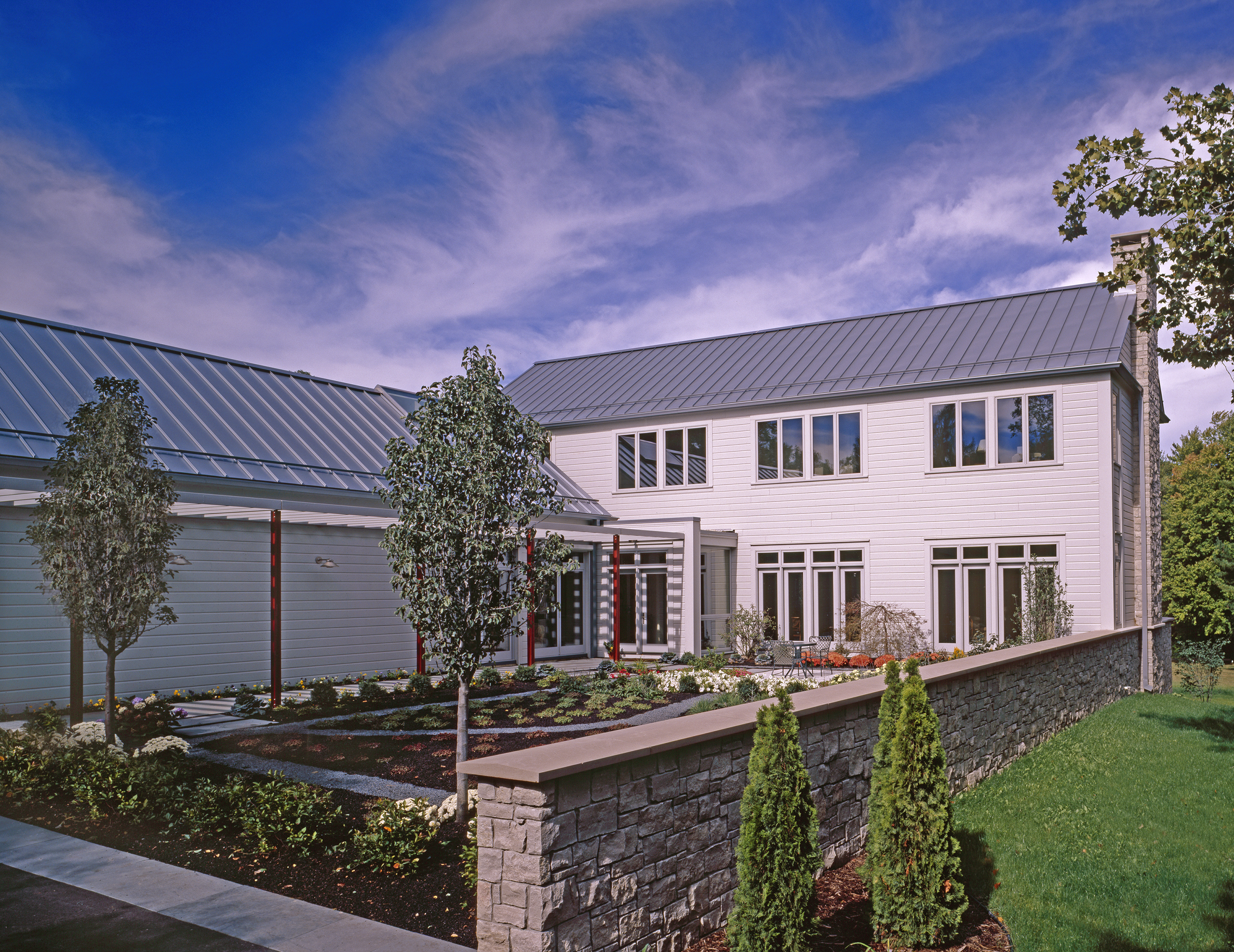 The building site is limited but augmented by sweeping vistas across neighboring properties. The compact volume of the main house is combined with the garage and a stone retaining wall opposite to carve a level entry court and garden from the rolling terrain.