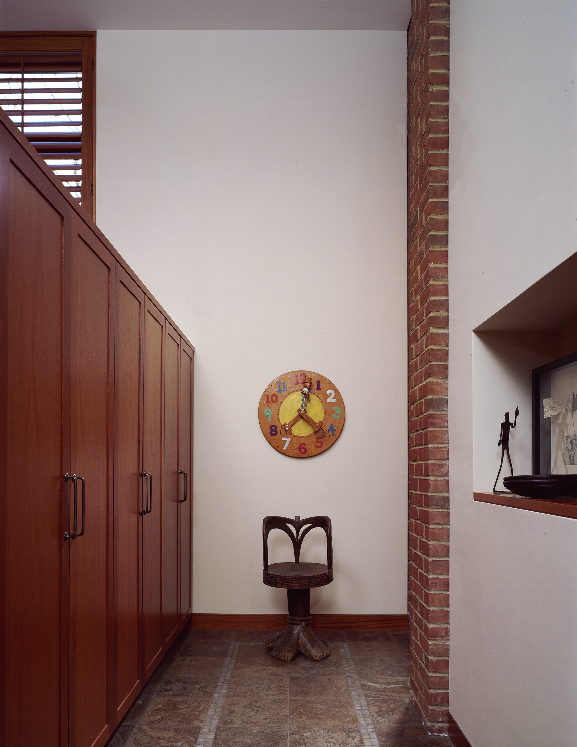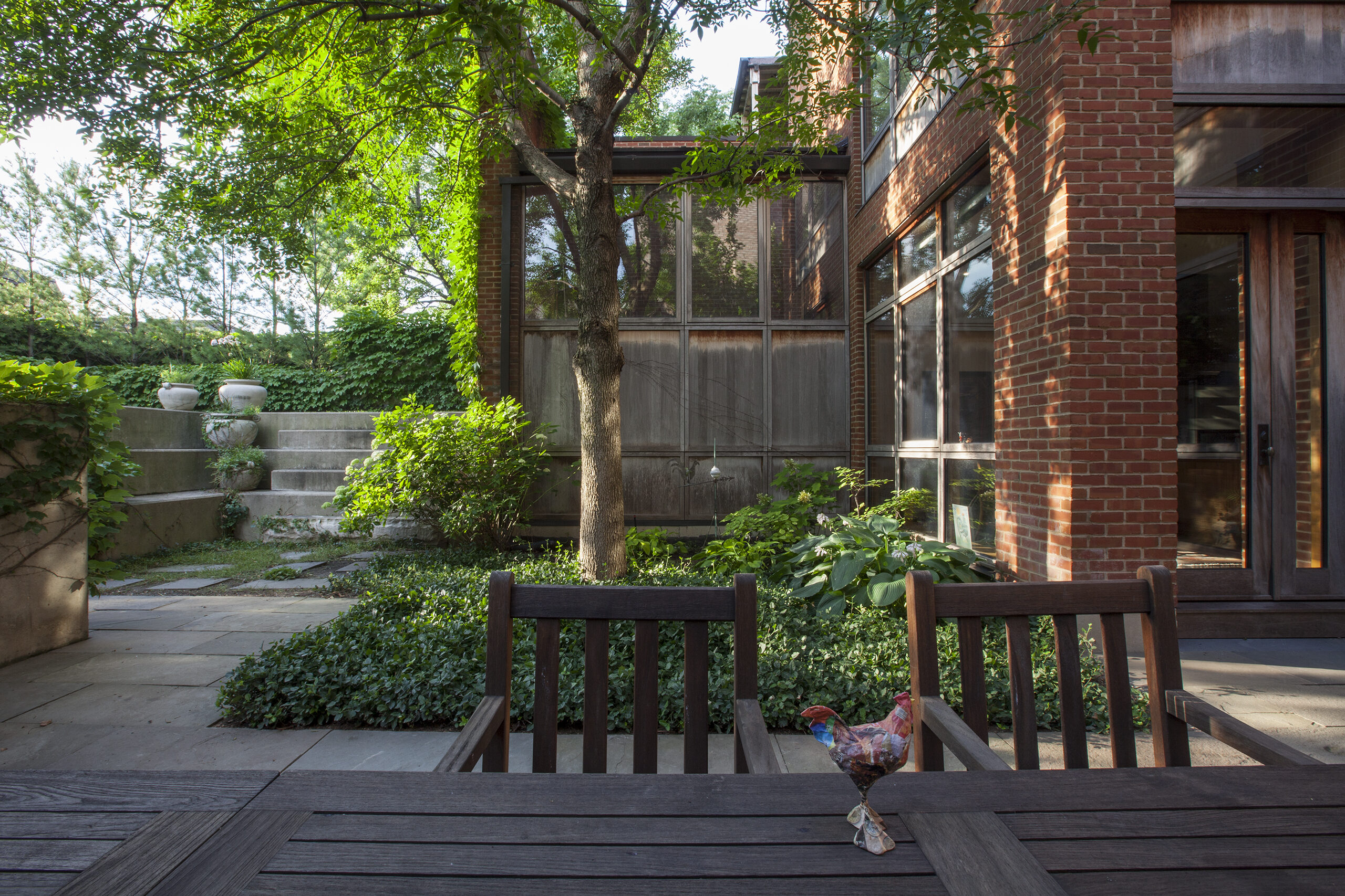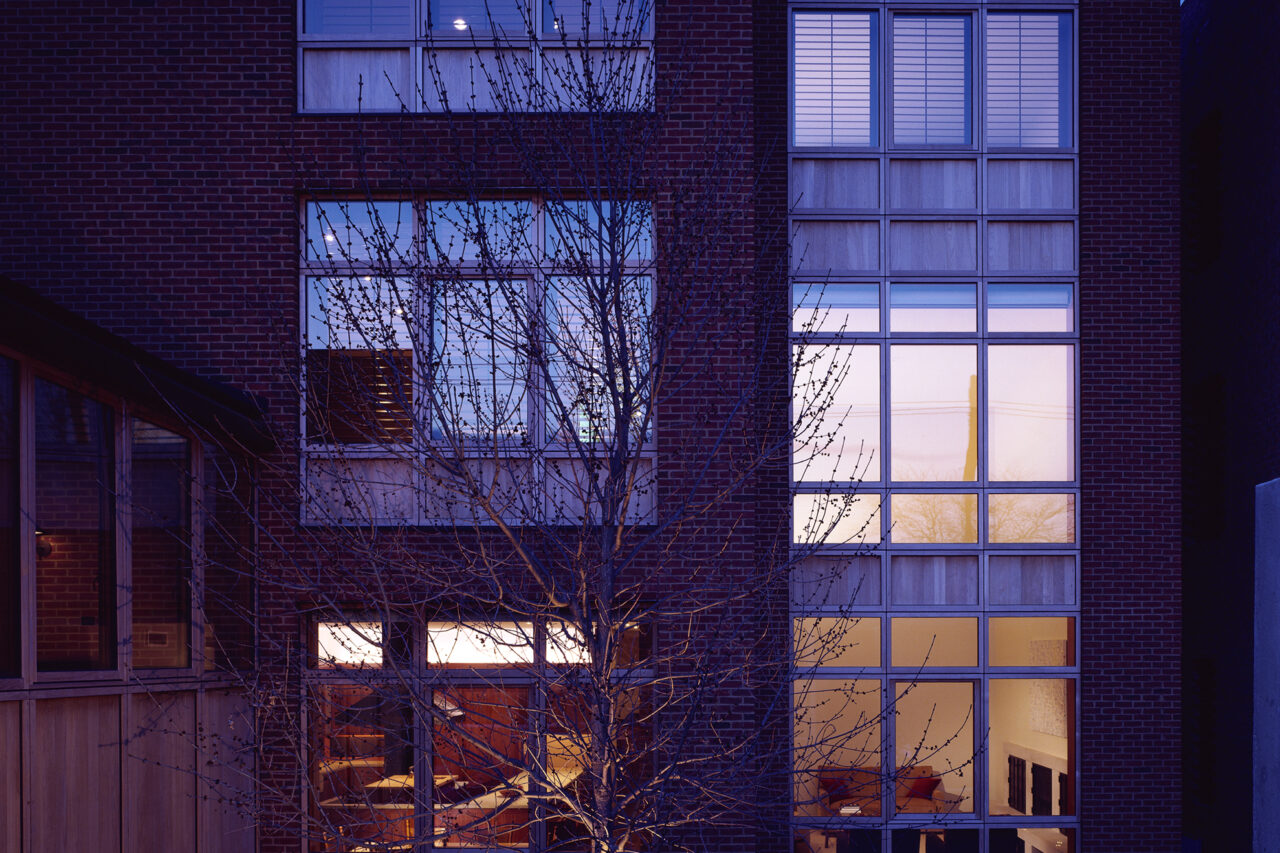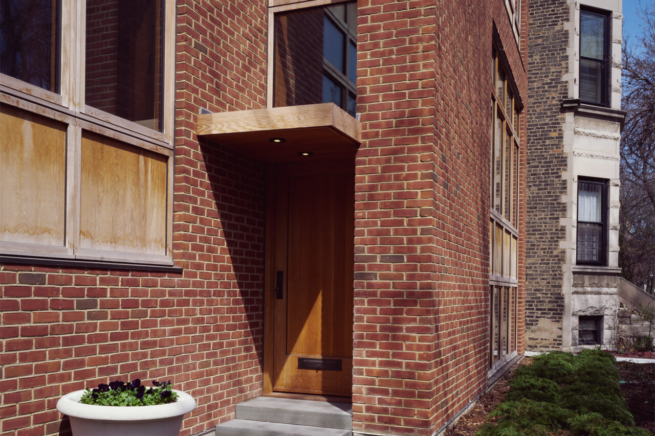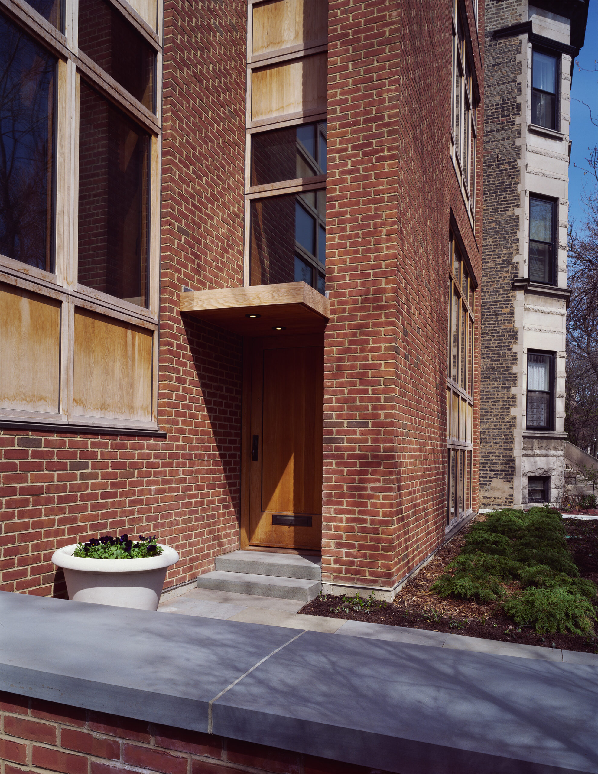 Two opposing U-shaped masonry walls enclose a new three-story residence in Chicago’s Lincoln Park neighborhood. In contrast to neighboring buildings, the rear and front entries are quietly introduced into the day lit slots between the nesting walls, leaving only sun-bleached teak windows to mark the facades.