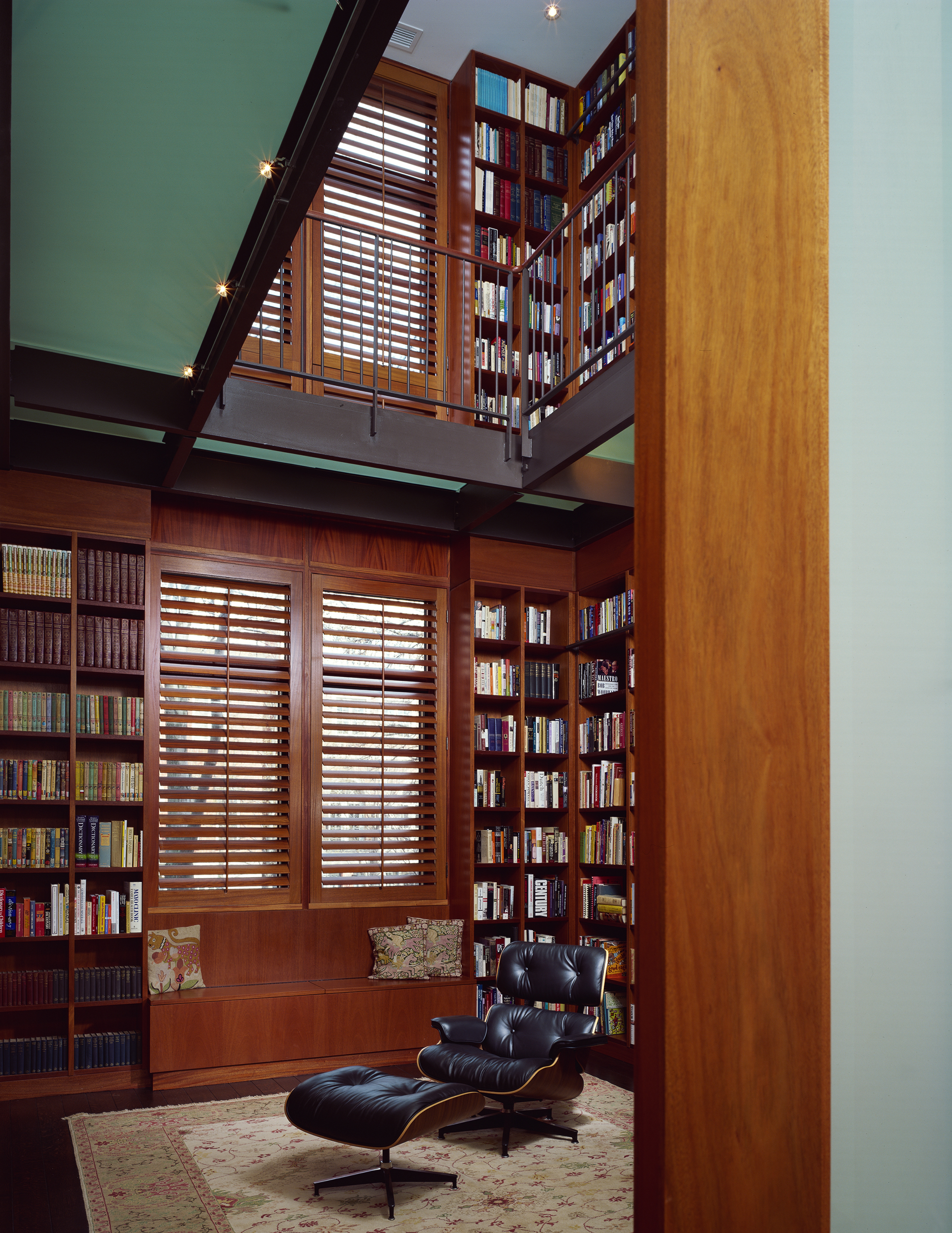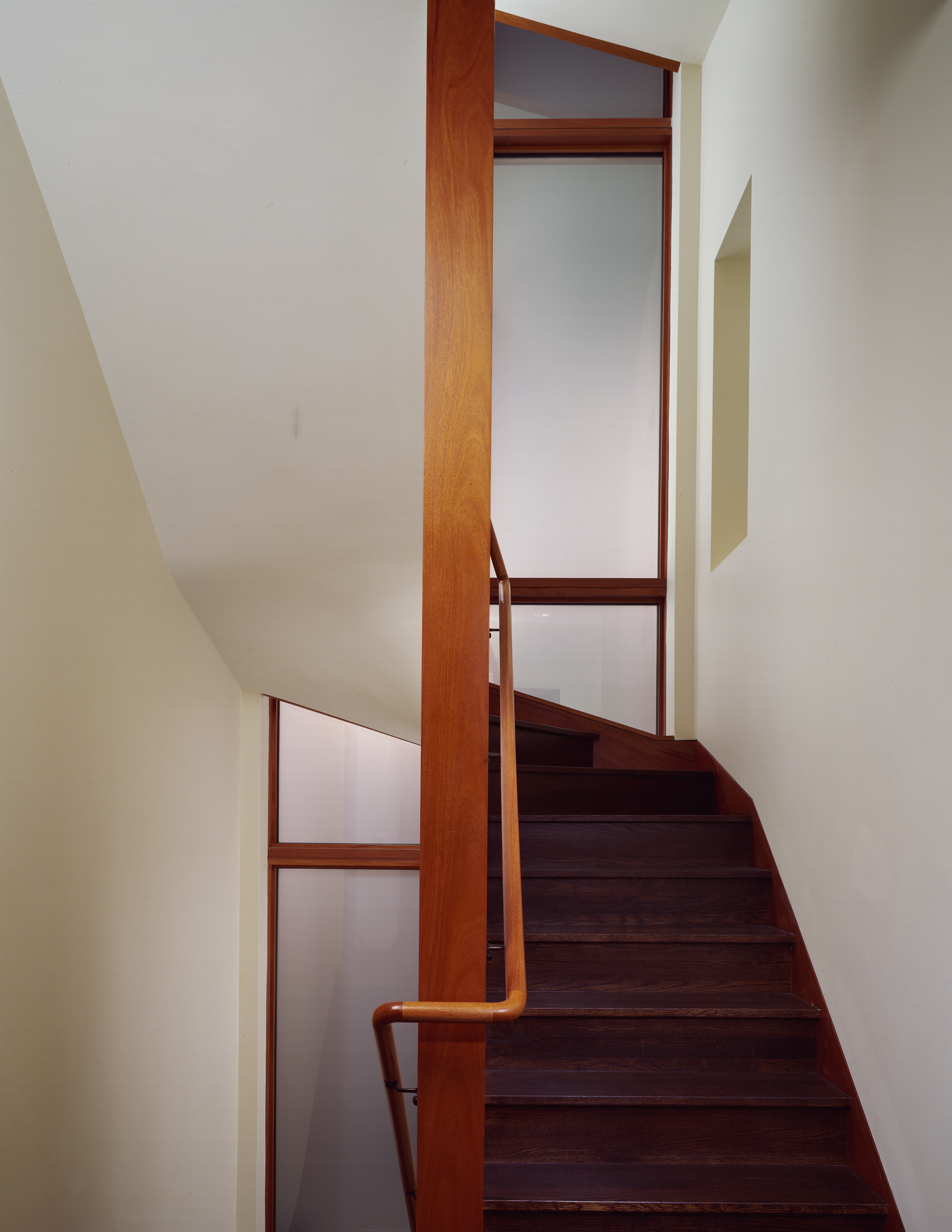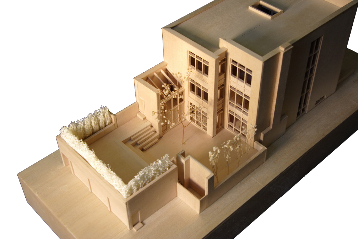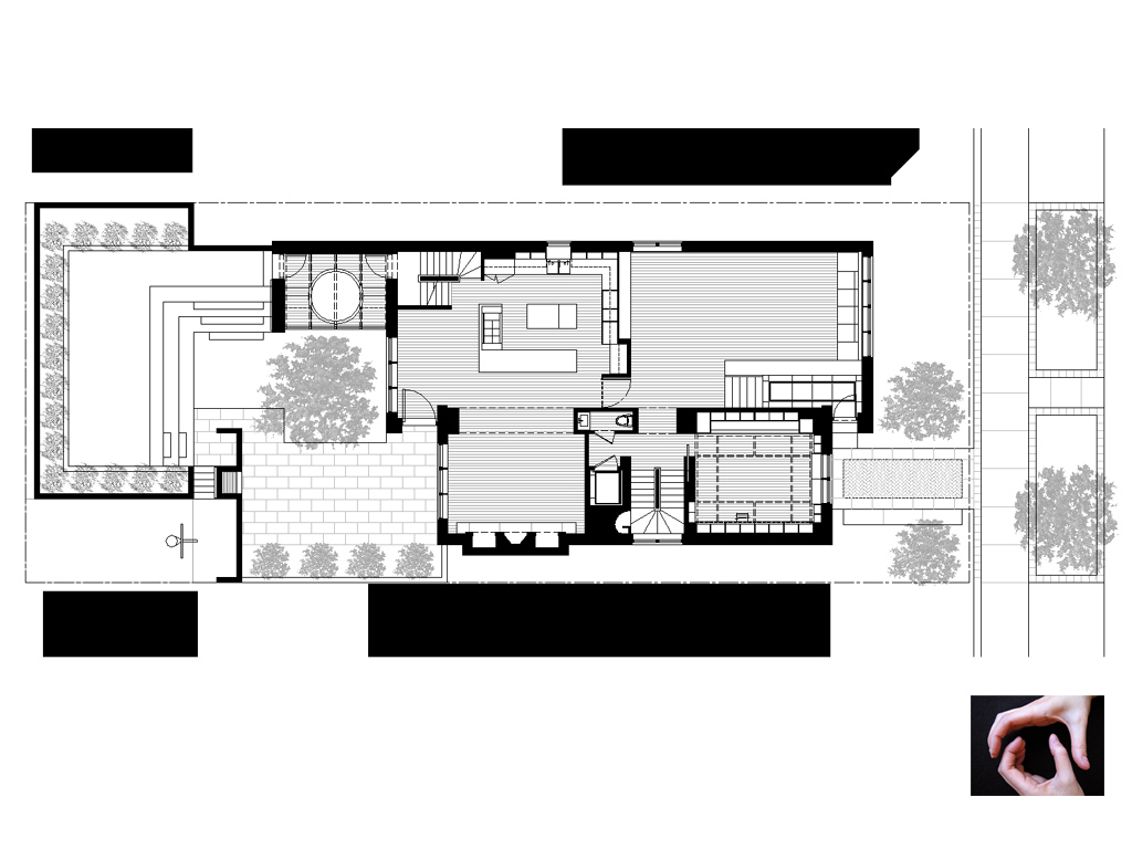 The northern wall encircles intimate single-height spaces while its counterpart encloses double height social spaces to the south. The open plan of the first floor affords ample light to all interior spaces. The upper floors accommodate four bedrooms which surround a day lit open stair.