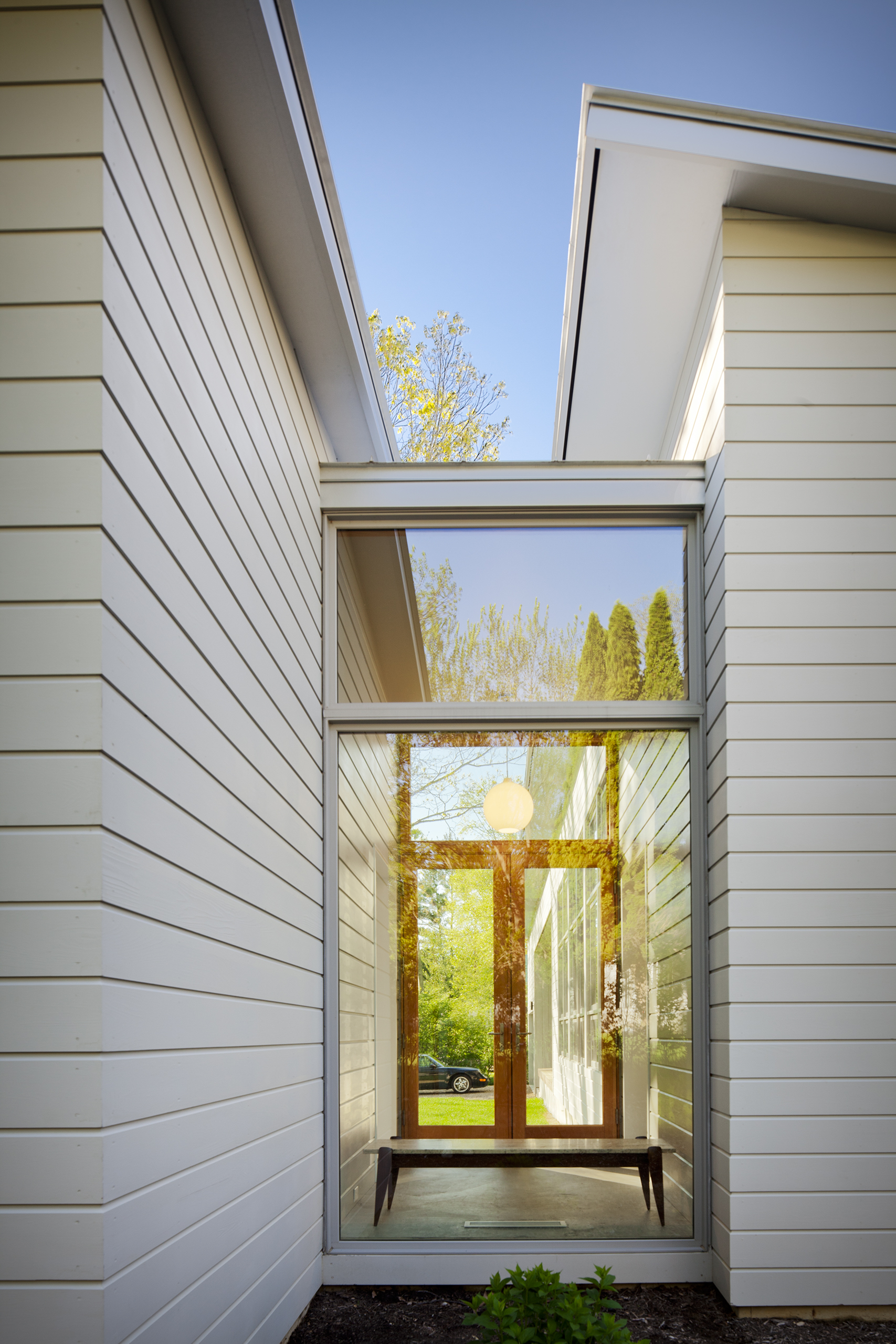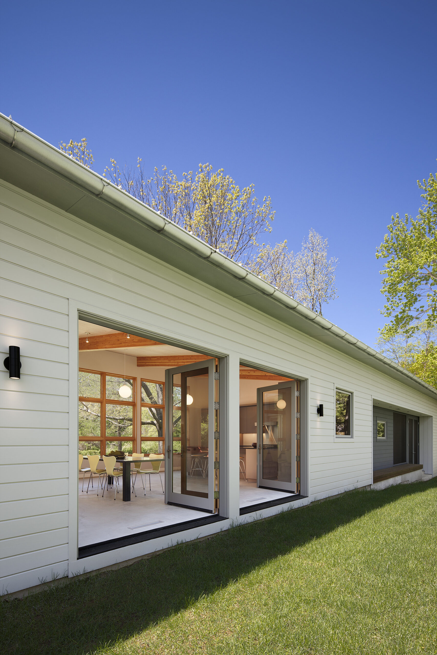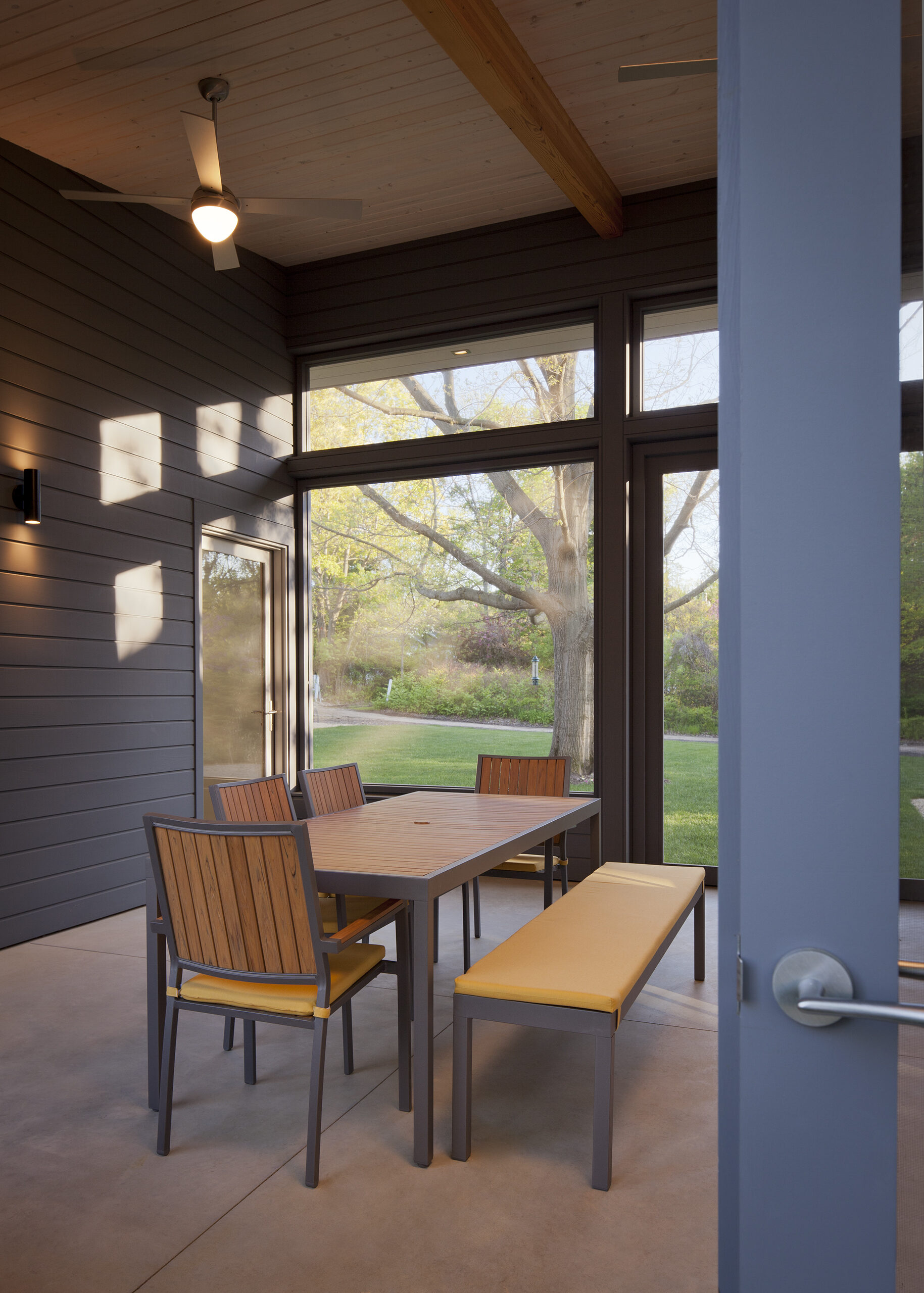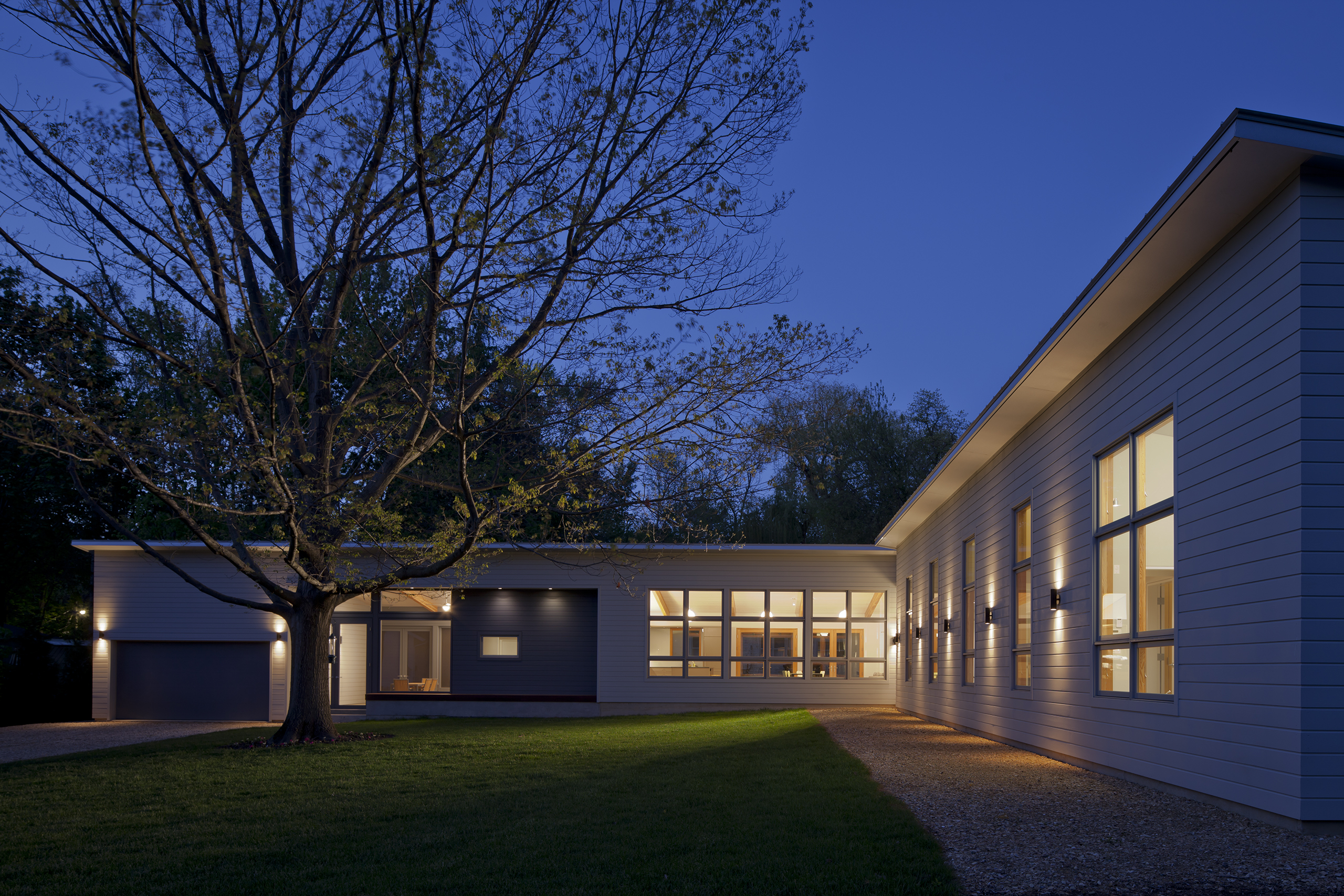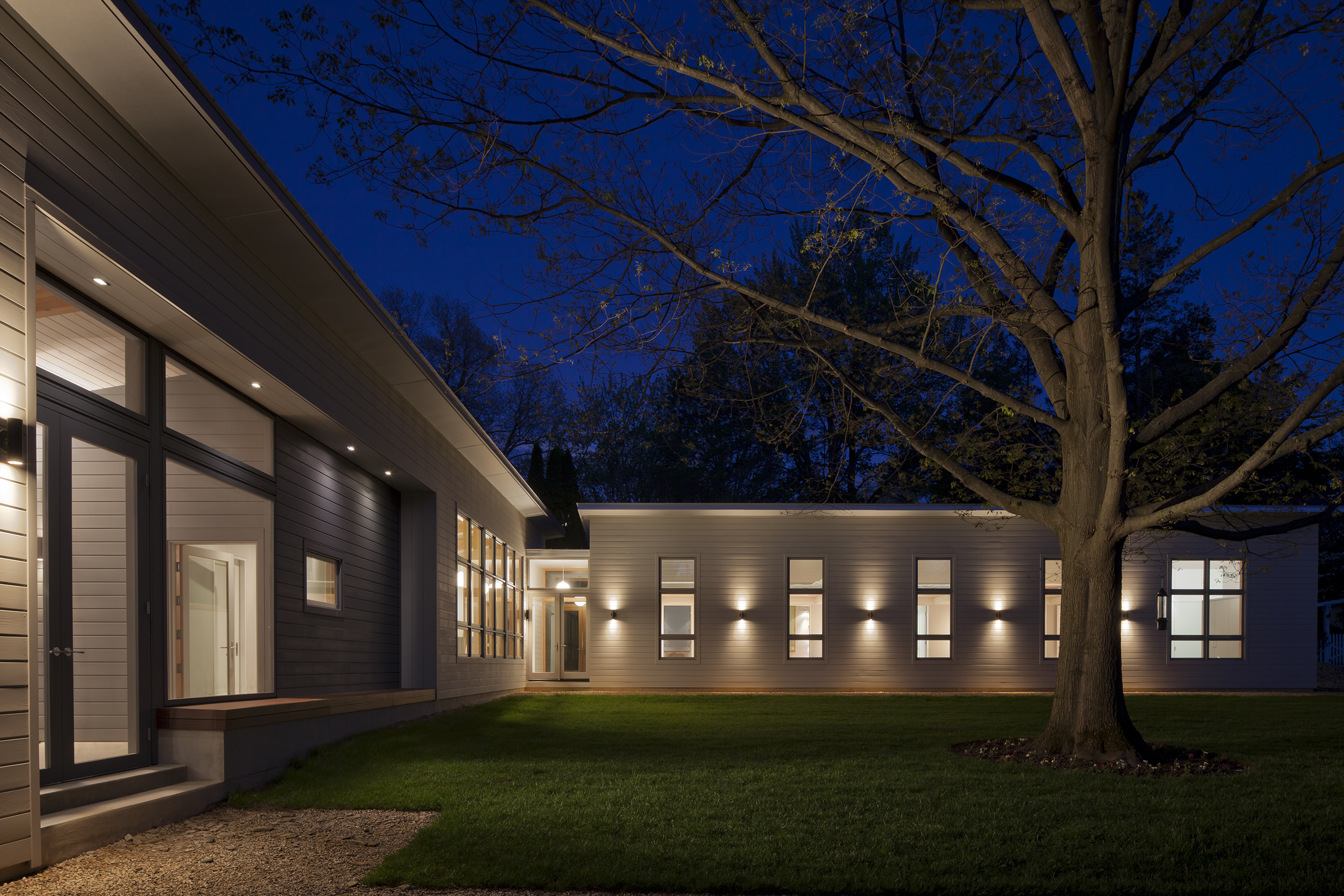 This weekend house for a Chicago family of four was built on a relatively small wooded lot that is dominated by a large oak tree in the center. The selected site diagram preserved the tree and used it as a focal point for all the public spaces. The shed roof inflects to the center of the lot, creating an open court for summer outdoor enjoyment, while minimizing the volume of the building when viewed from neighboring properties.