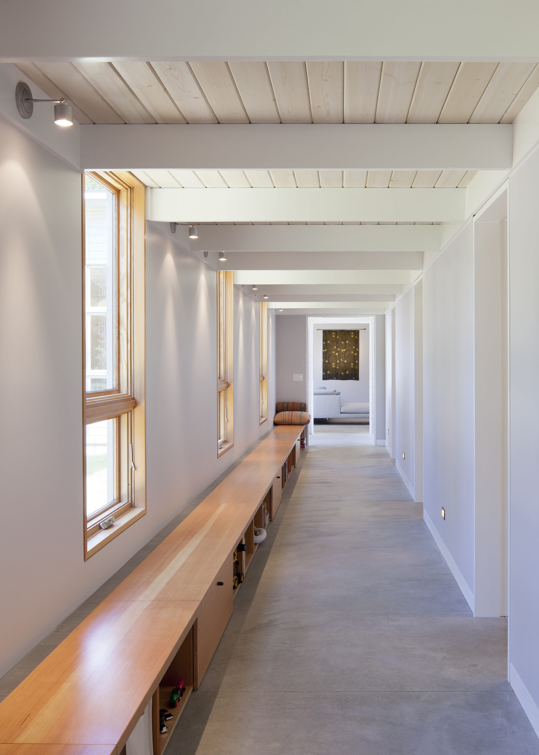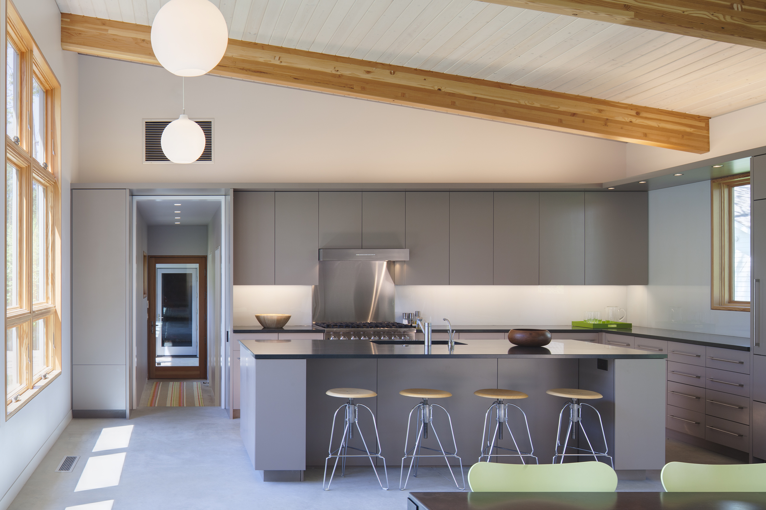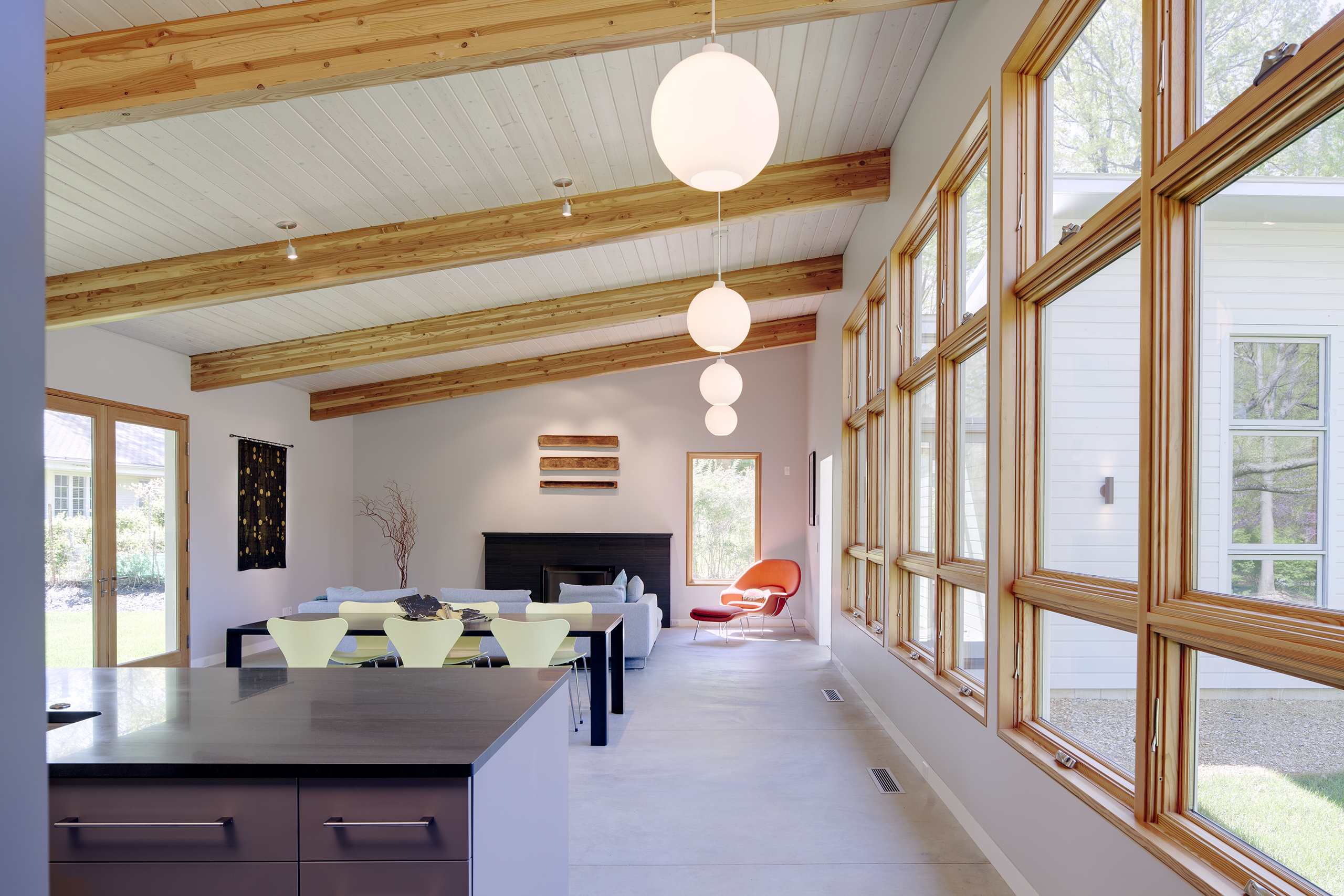 Interior finishes are chosen to offer a light and casual feel in keeping with a weekend house in the country. The large great room incorporates kitchen, living and dining functions. The shed roof affords for sleeping lofts over the bedroom wing hallway, allowing a number of overnight guests in an otherwise small house.