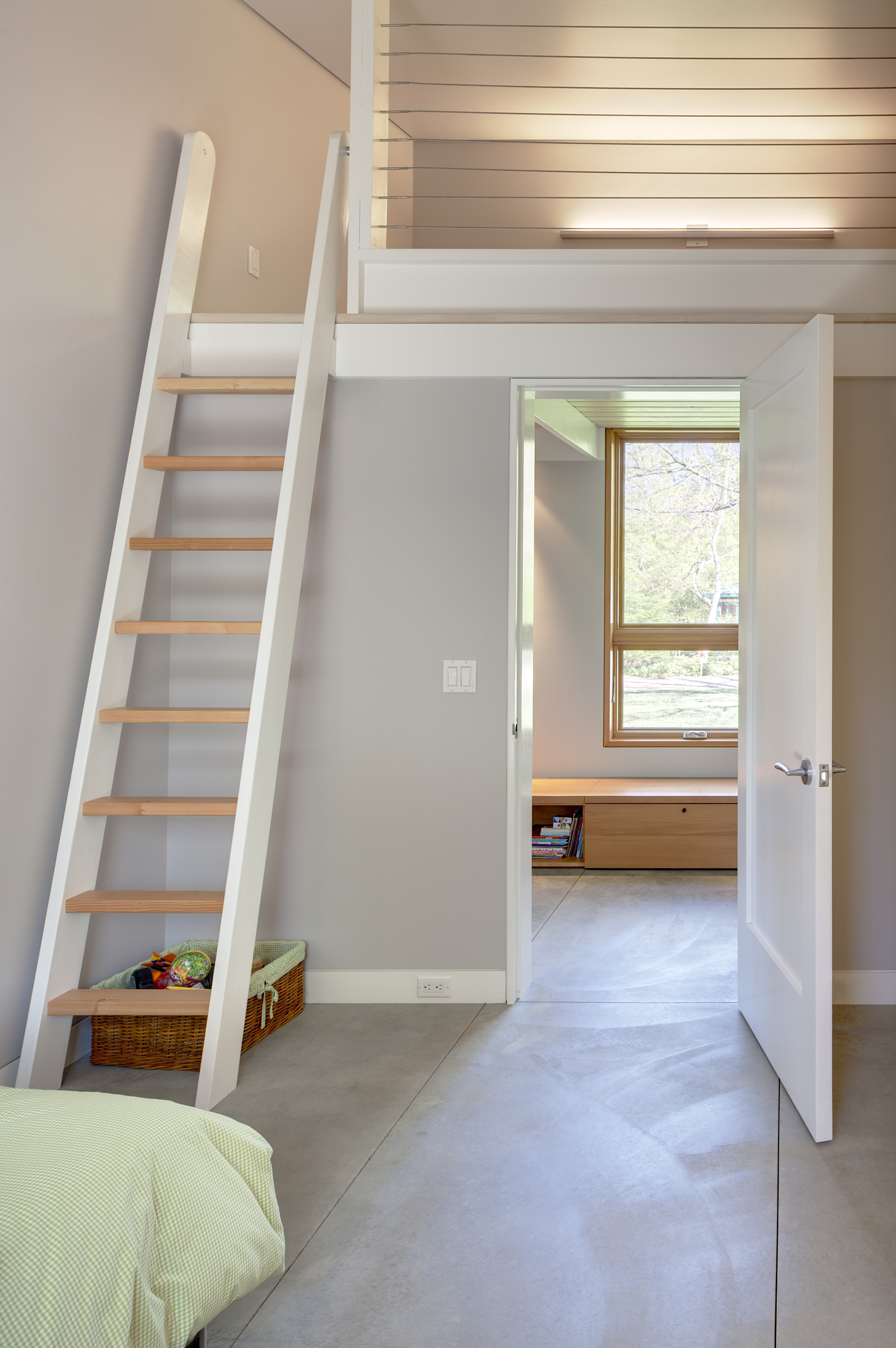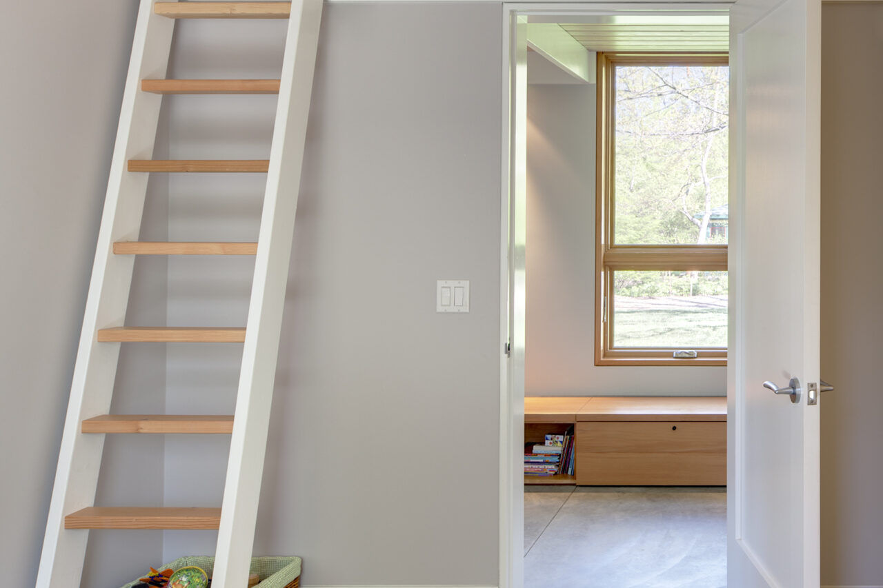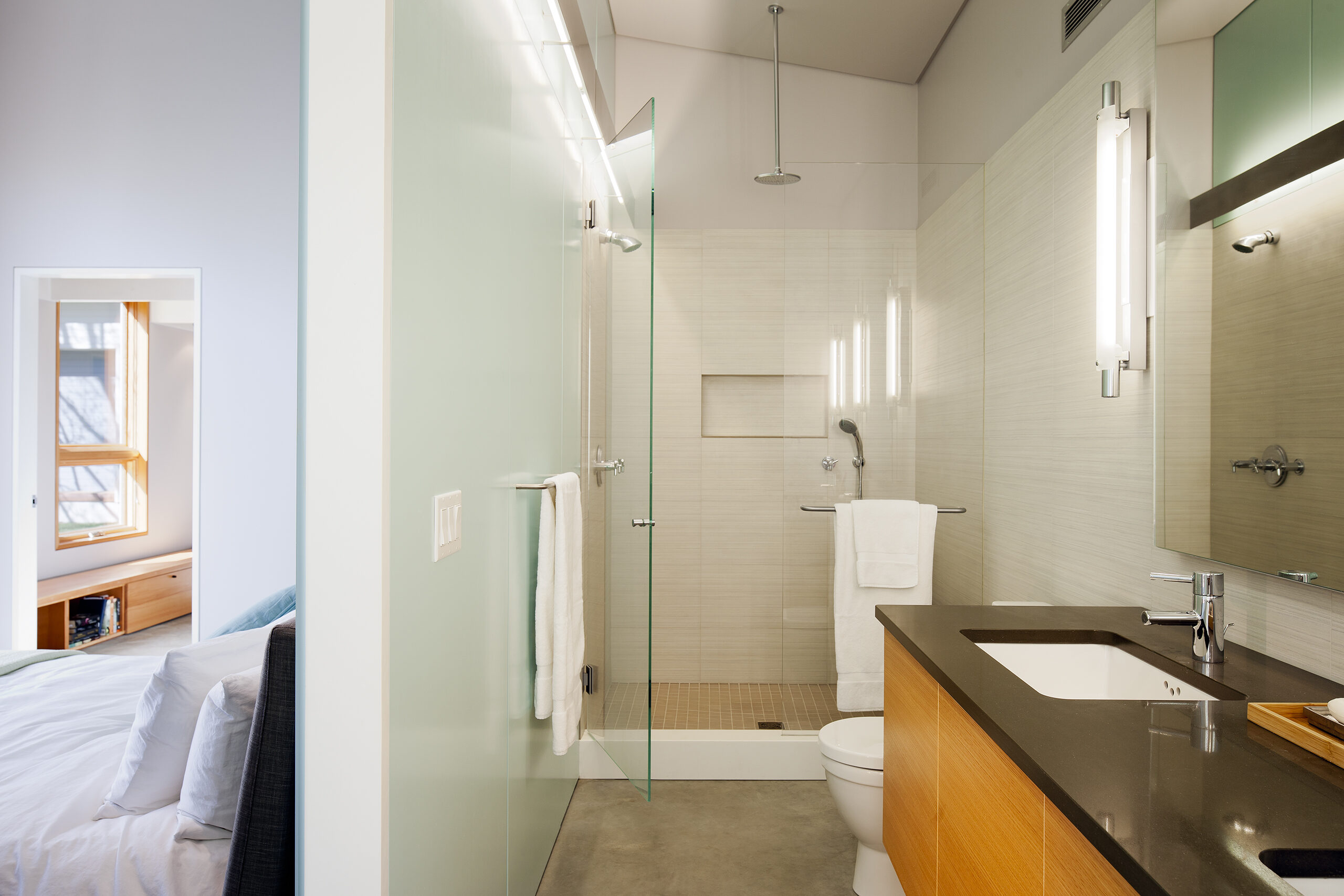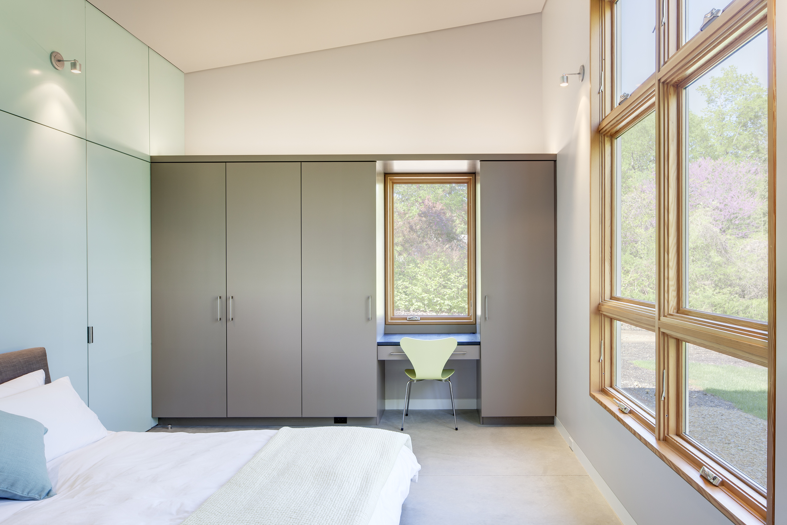 Interior finishes are chosen to offer a light and casual feel in keeping with a weekend house in the country. The large great room incorporates kitchen, living and dining functions. The shed roof affords for sleeping lofts over the bedroom wing hallway, allowing a number of overnight guests in an otherwise small house.