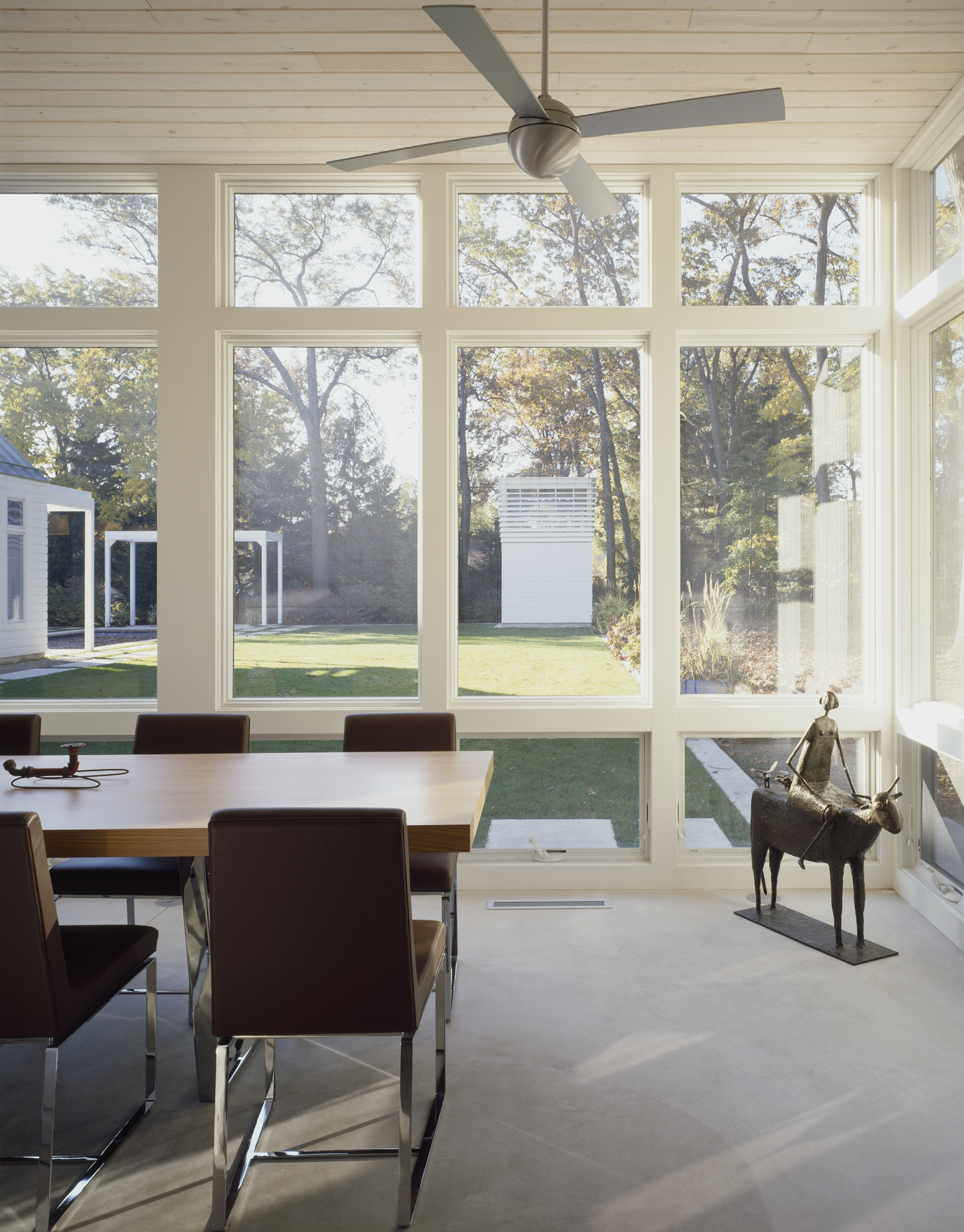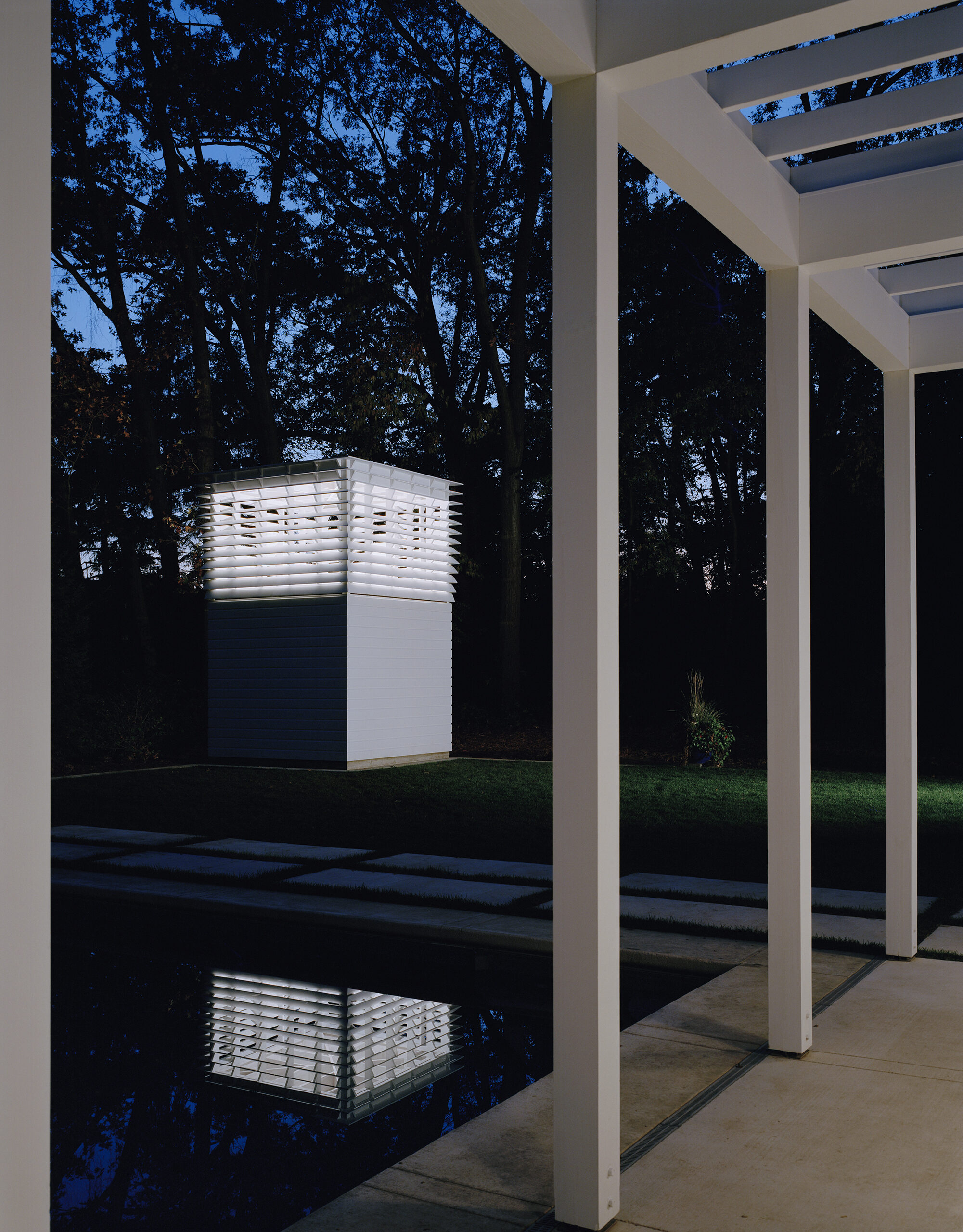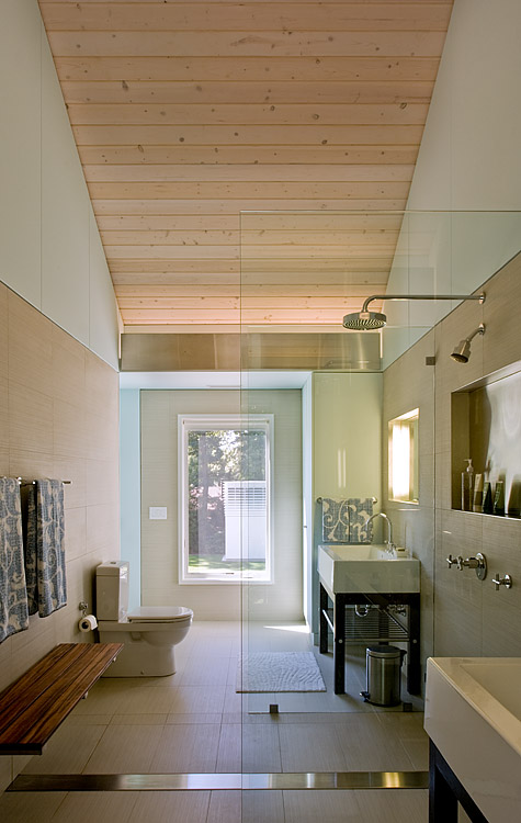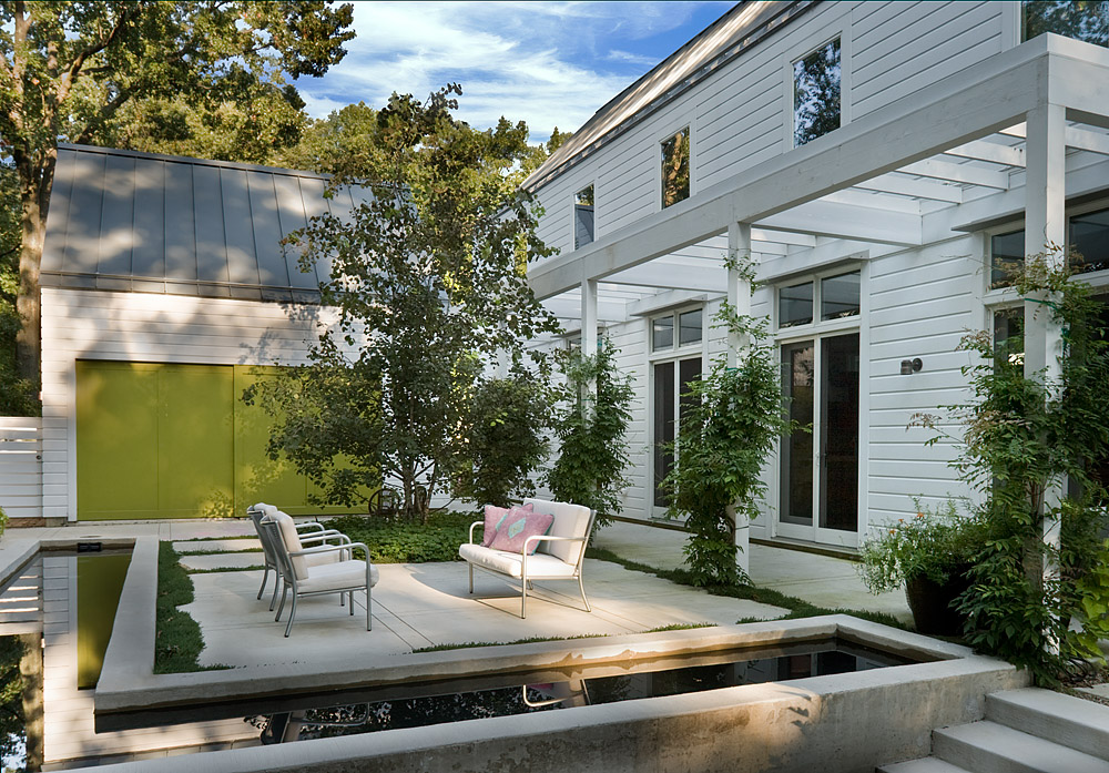 Children’s notions of adventure are satisfied with sleeping lofts, secret bedrooms, and a “tree-house” atop a freestanding two-story structure that anchors the corner of the formal lawn. This same structure also houses pool equipment, a potting shed, and acts as a Chinese lantern, glowing in the evening landscape.