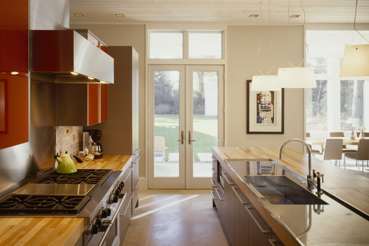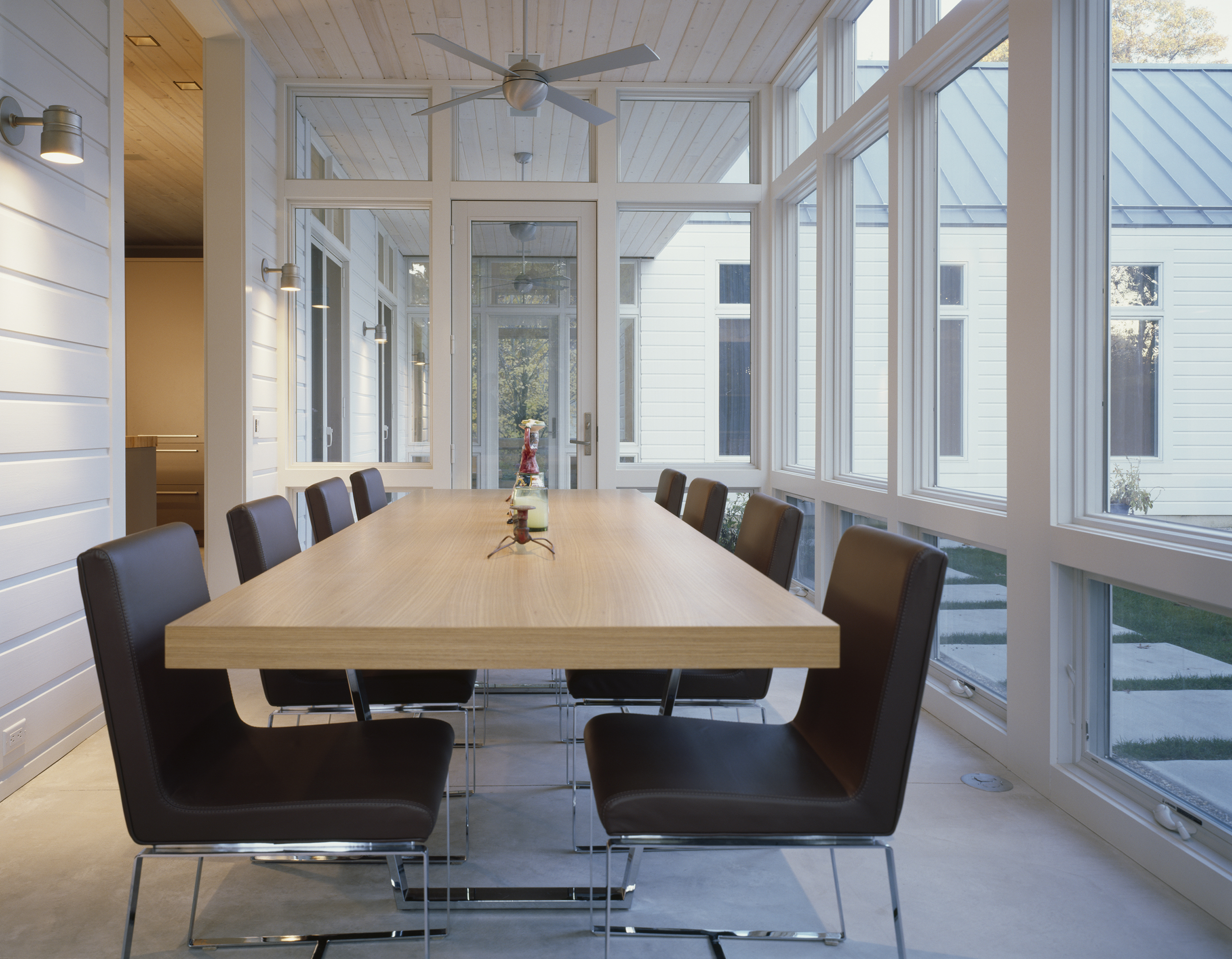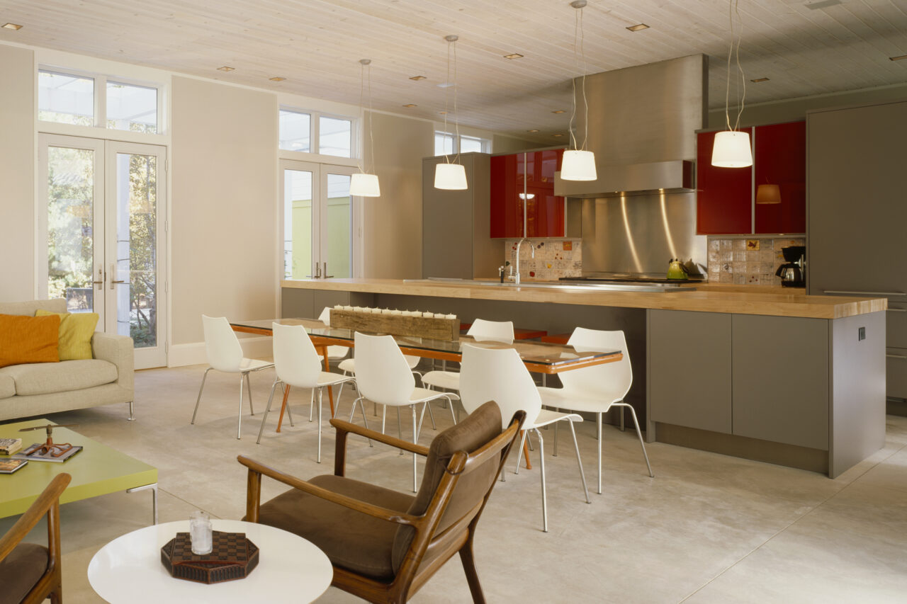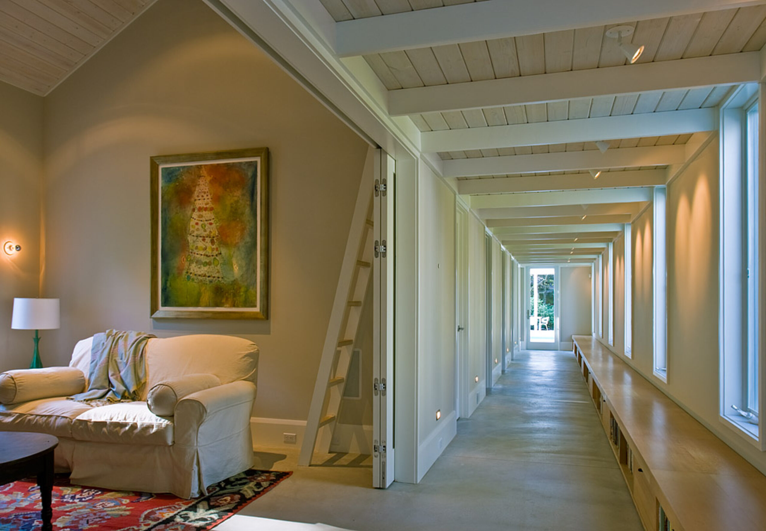 Children’s notions of adventure are satisfied with sleeping lofts, secret bedrooms, and a “tree-house” atop a freestanding two-story structure that anchors the corner of the formal lawn. This same structure also houses pool equipment, a potting shed, and acts as a Chinese lantern, glowing in the evening landscape.